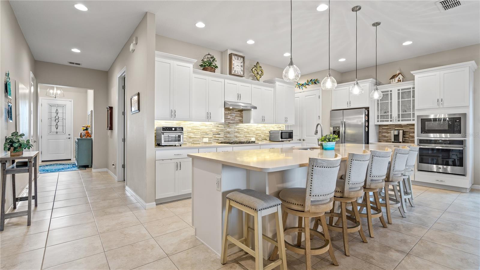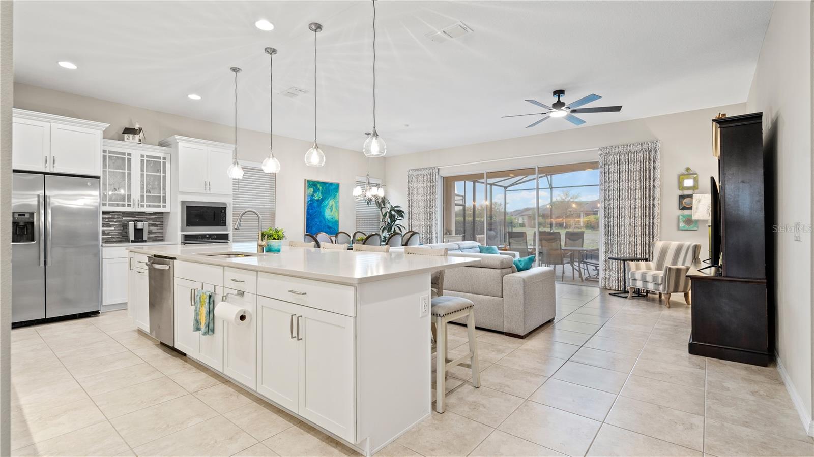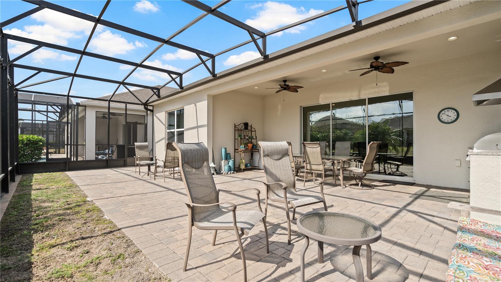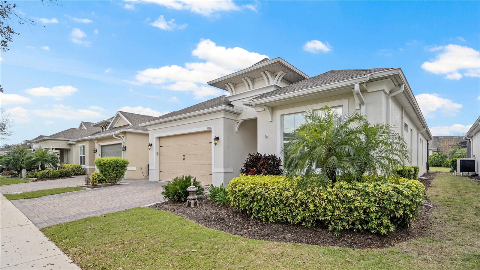 You will love this beautiful St. Lucia home that features the open concept upgraded gourmet kitchen with a 13 foot island, dining room, living room, office, primary bedroom with a fully upgraded bathroom with custom closets and two additional bedrooms plus a full bath. The living and dining room get the all afternoon sun and THE SCREENED LANAI IS EXTENDED WITH A SUMMER KITCHEN. This home is beautifully landscaped with plenty of privacy. The owner put in approximately $45,000 in additional upgrades which includes widening the paver driveway and installing a paved walkway from the front of the home to the backyard. They also installed several overhead storage racks in the garage plus a charging station for electric vehicles and custom cabinetry by the garage. All the closets are custom designed and they added under cabinet lighting in the kitchen and installed medicine cabinets in both bathrooms and installed 1/2 beveled glass entry door. The triple sliding door and all windows feature UV Protection. The Four Seasons is a guard gated community with a wonderful clubhouse which has a very large ballroom, game room, card room, coffee bar and lounge. There is an outside covered lanai for parties and two large pools, lap lane and hot tub. There is also tennis courts, pickle ball and shuffle board. You will love living at the Four Seasons 55+ Community which is entwined within Mystic Dunes Golf Course which allows plenty of homes right on the course.