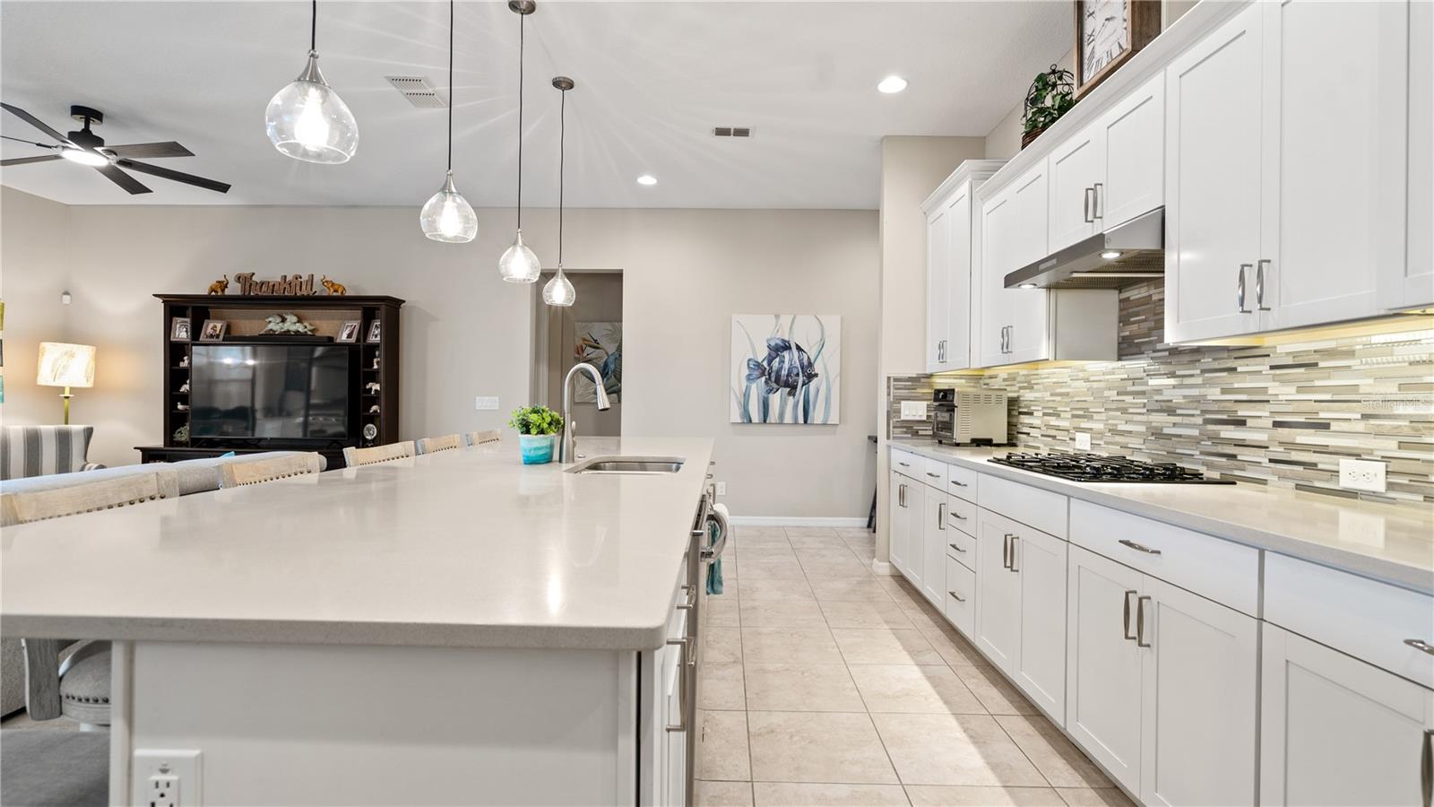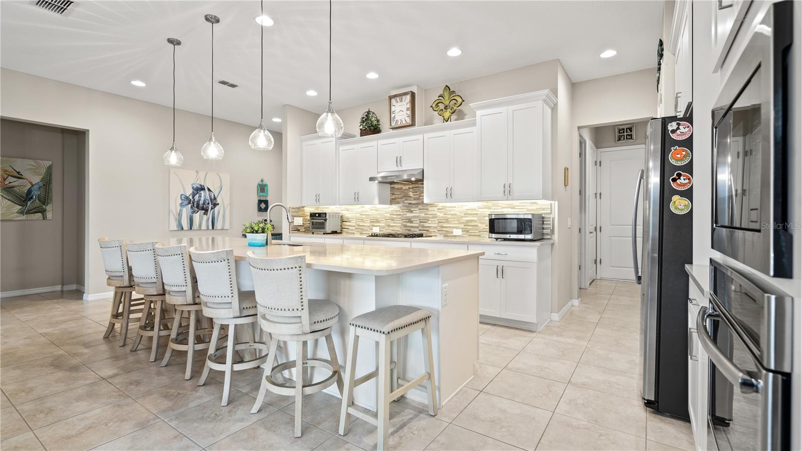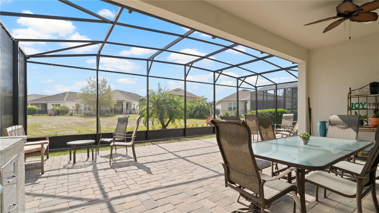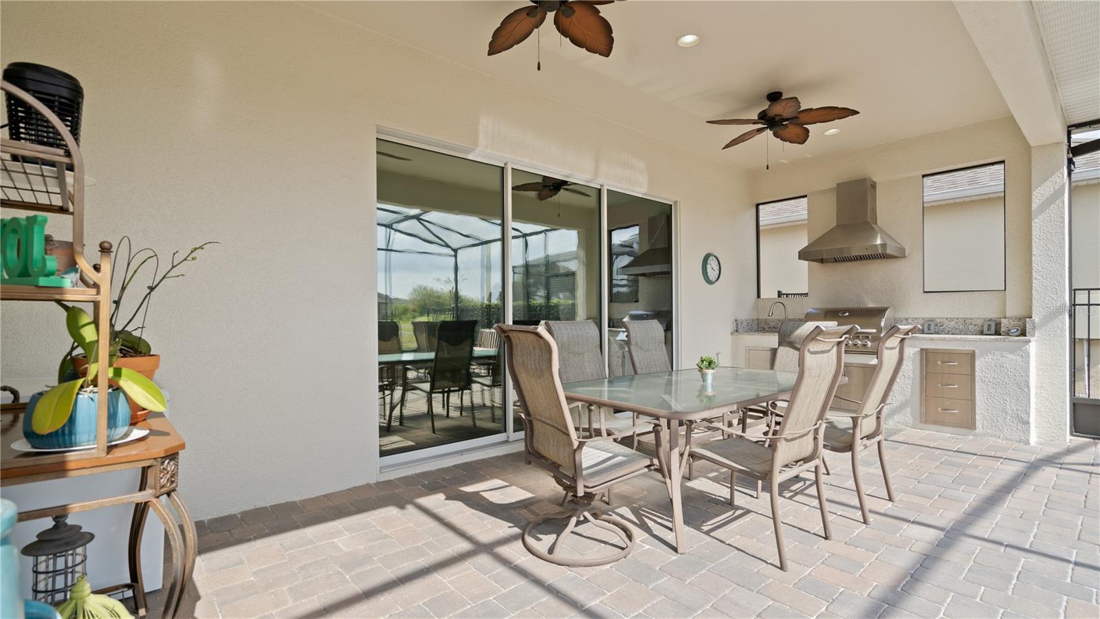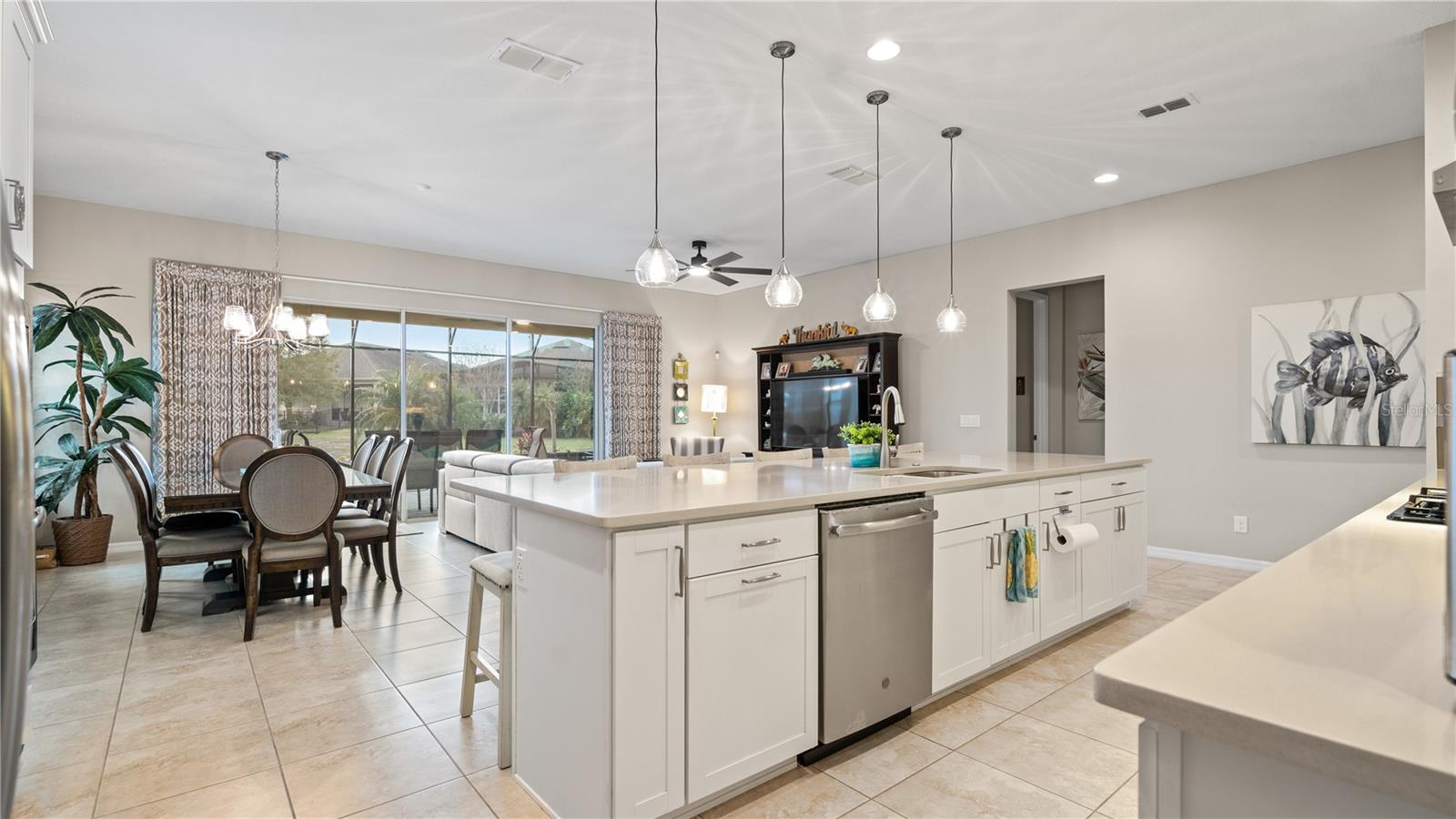 You will love this beautiful St. Lucia home that features the open concept upgraded gourmet kitchen with a 13 foot island, dining room, living room, office, primary bedroom with a fully upgraded bathroom with custom closets and two additional bedrooms plus a full bath. The living and dining room get the all afternoon sun and THE SCREENED LANAI IS EXTENDED WITH A SUMMER KITCHEN. This home is beautifully landscaped with plenty of privacy. The owner put in approximately $45,000 in additional upgrades which includes widening the paver driveway and installing a paved walkway from the front of the home to the backyard. They also installed several overhead storage racks in the garage plus a charging station for electric vehicles and custom cabinetry by the garage. All the closets are custom designed and they added under cabinet lighting in the kitchen and installed medicine cabinets in both bathrooms and installed 1/2 beveled glass entry door. The triple sliding door and all windows feature UV Protection. The Four Seasons is a guard gated community with a wonderful clubhouse which has a very large ballroom, game room, card room, coffee bar and lounge. There is an outside covered lanai for parties and two large pools, lap lane and hot tub. There is also tennis courts, pickle ball and shuffle board. You will love living at the Four Seasons 55+ Community which is entwined within Mystic Dunes Golf Course which allows plenty of homes right on the course.