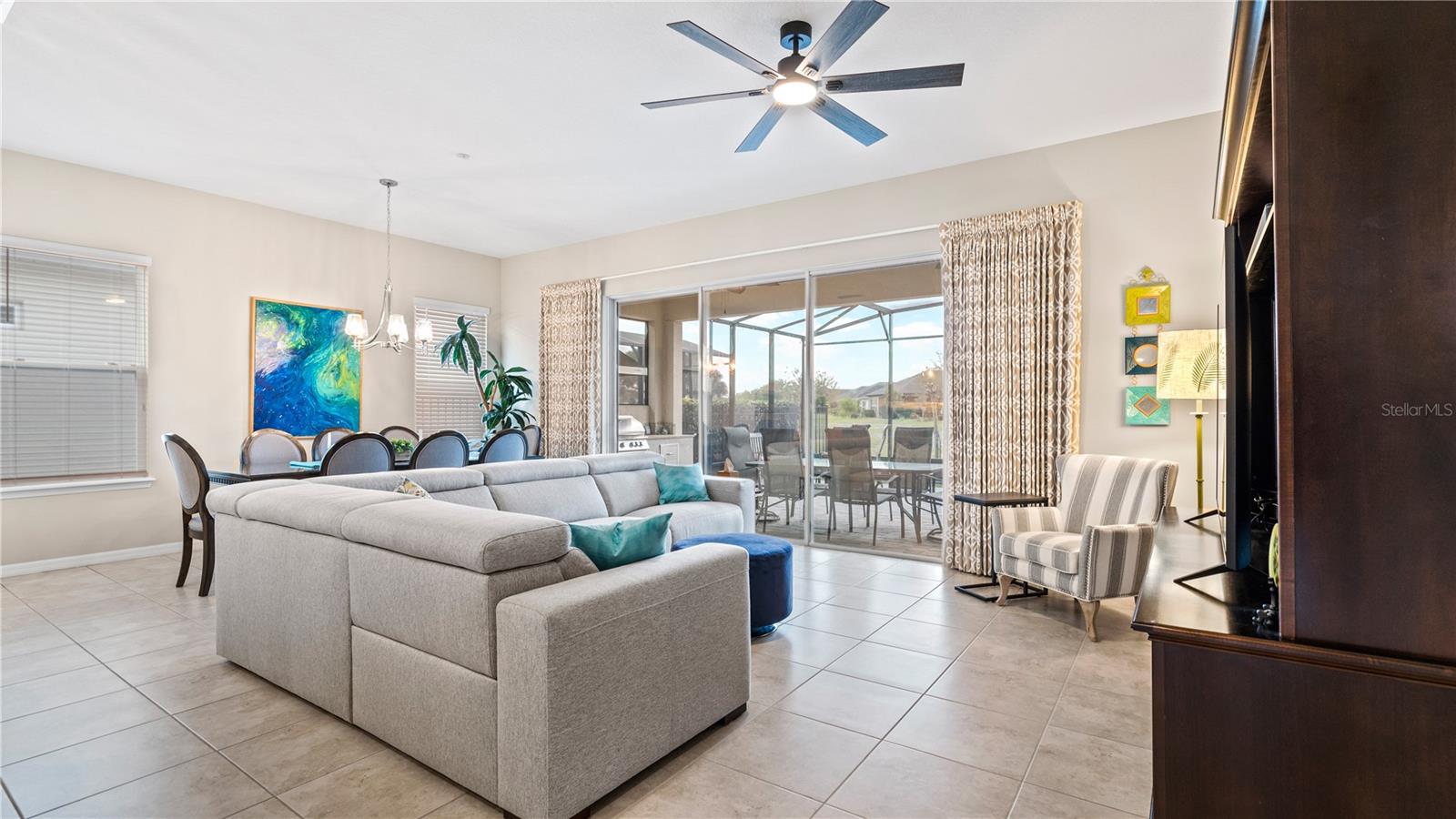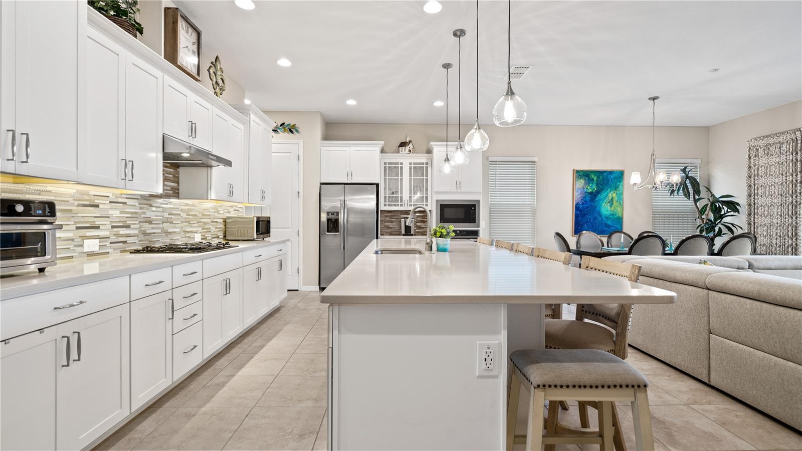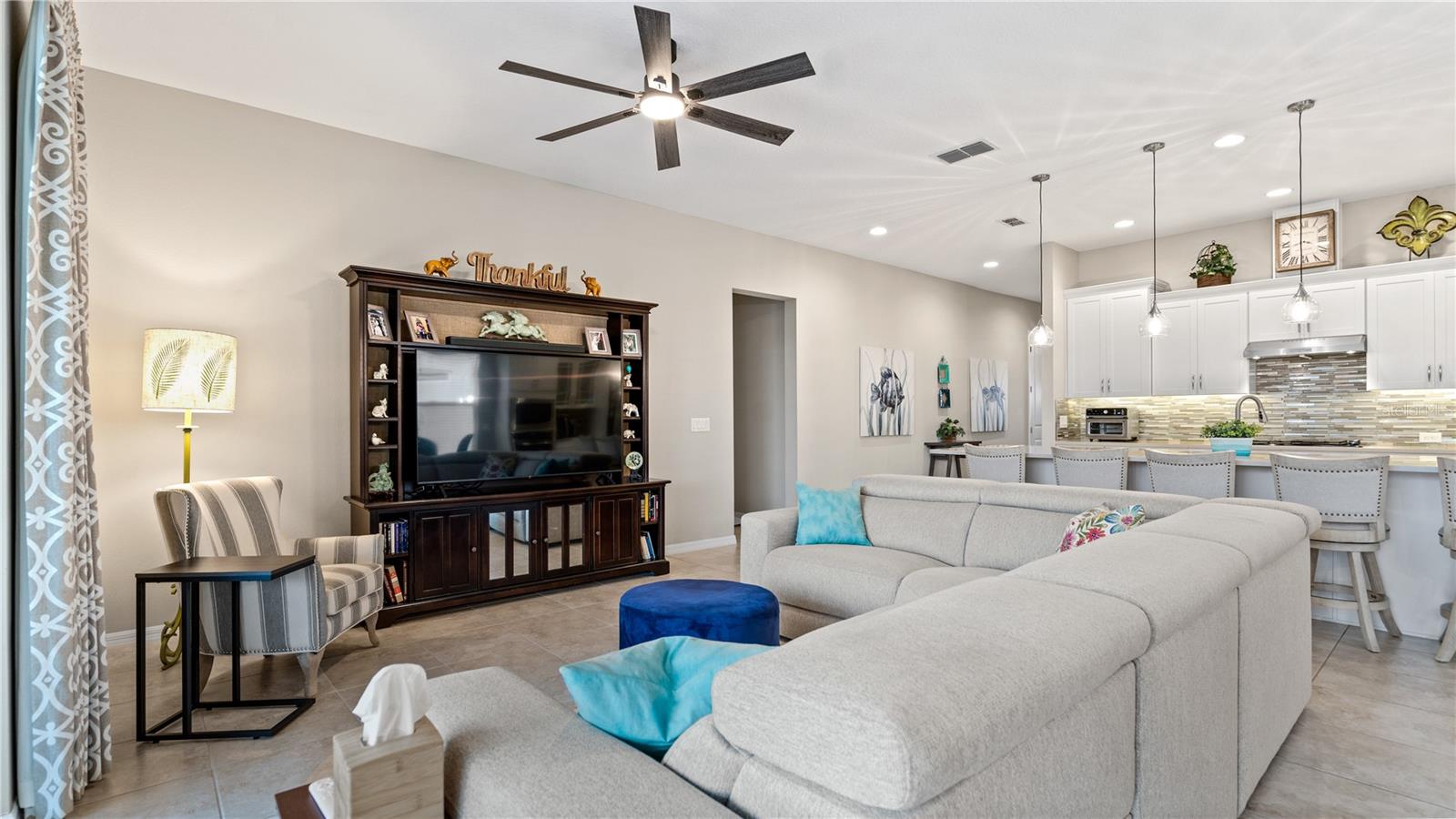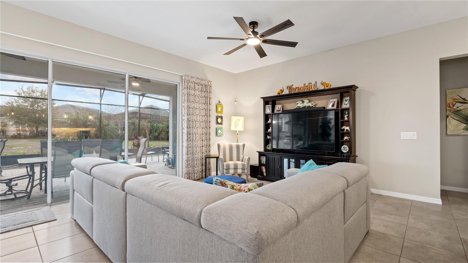 You will love this beautiful St. Lucia home that features the open concept upgraded gourmet kitchen with a 13 foot island, dining room, living room, office, primary bedroom with a fully upgraded bathroom with custom closets and two additional bedrooms plus a full bath. The living and dining room get the all afternoon sun and THE SCREENED LANAI IS EXTENDED WITH A SUMMER KITCHEN. This home is beautifully landscaped with plenty of privacy. The owner put in approximately $45,000 in additional upgrades which includes widening the paver driveway and installing a paved walkway from the front of the home to the backyard. They also installed several overhead storage racks in the garage plus a charging station for electric vehicles and custom cabinetry by the garage. All the closets are custom designed and they added under cabinet lighting in the kitchen and installed medicine cabinets in both bathrooms and installed 1/2 beveled glass entry door. The triple sliding door and all windows feature UV Protection. The Four Seasons is a guard gated community with a wonderful clubhouse which has a very large ballroom, game room, card room, coffee bar and lounge. There is an outside covered lanai for parties and two large pools, lap lane and hot tub. There is also tennis courts, pickle ball and shuffle board. You will love living at the Four Seasons 55+ Community which is entwined within Mystic Dunes Golf Course which allows plenty of homes right on the course.