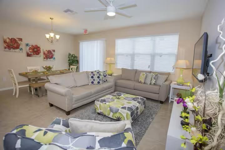 Available for visits from March 10th!! Amazing Investment Opportunity! This beautifully furnished townhome is located in a gated community just minutes from Disney, theme parks, restaurants, shopping, and grocery stores. The home features elegant décor, ceramic tile flooring on the first floor, and plush carpeting on the second floor. HOA fees cover lawn maintenance, community pool upkeep, and a picnic area, ensuring a hassle-free lifestyle. Don't miss out on this fantastic property—perfect as a vacation home or investment!