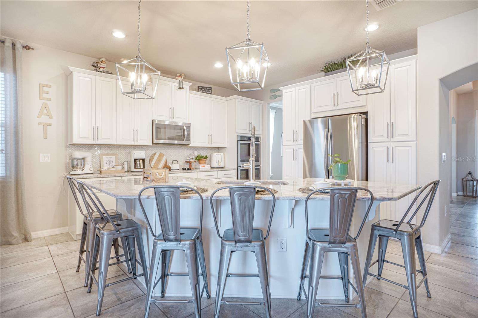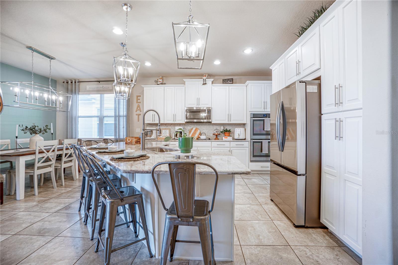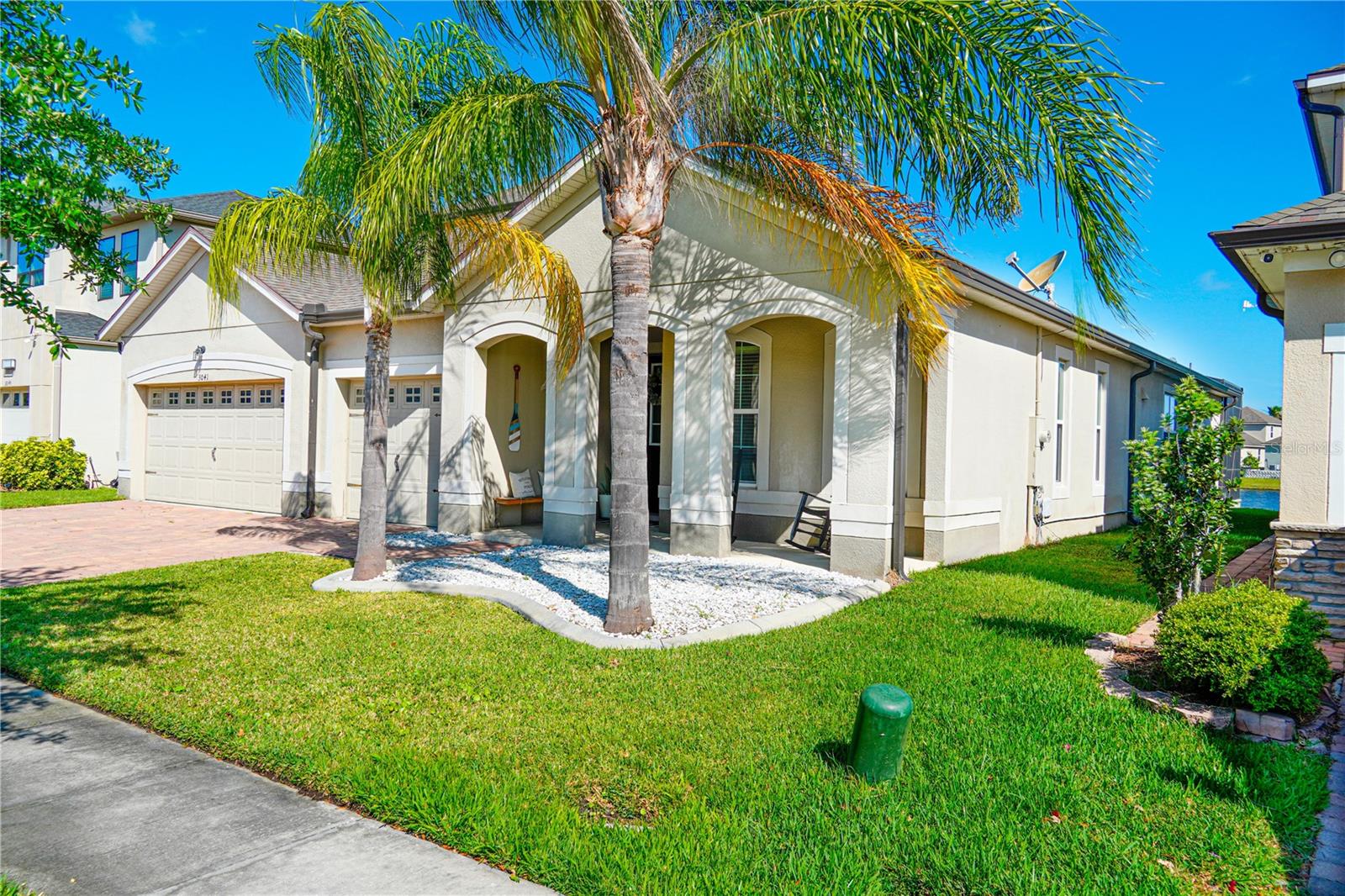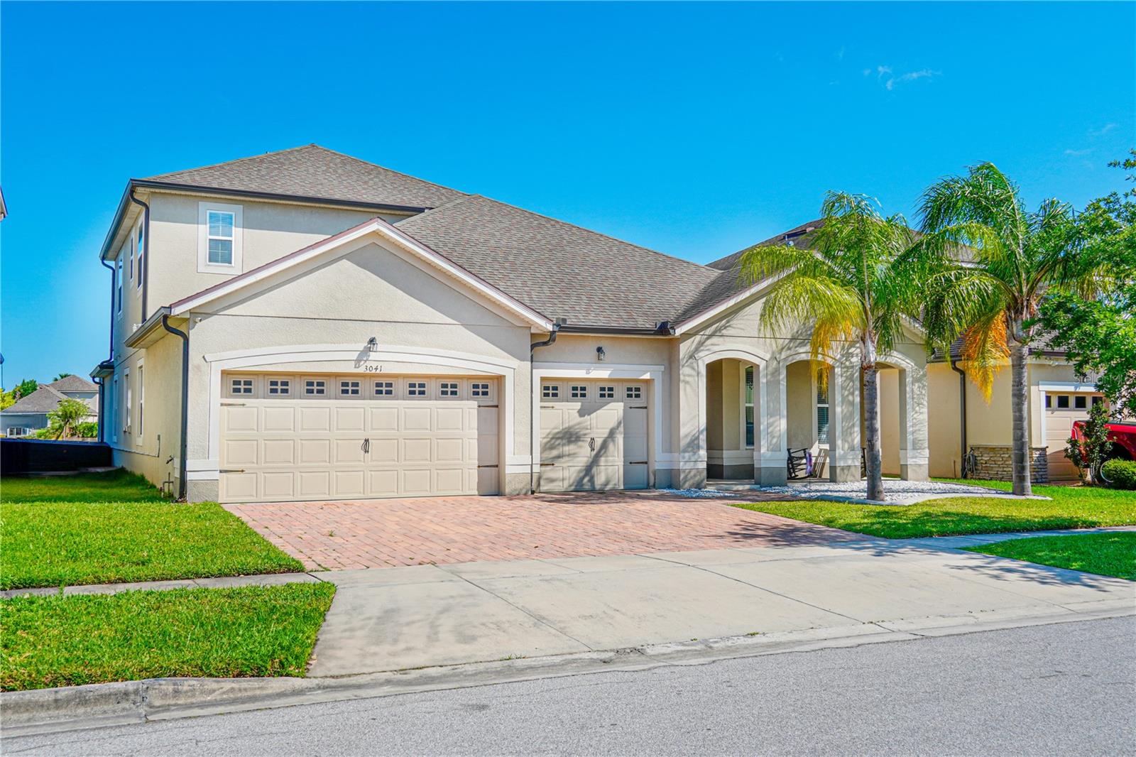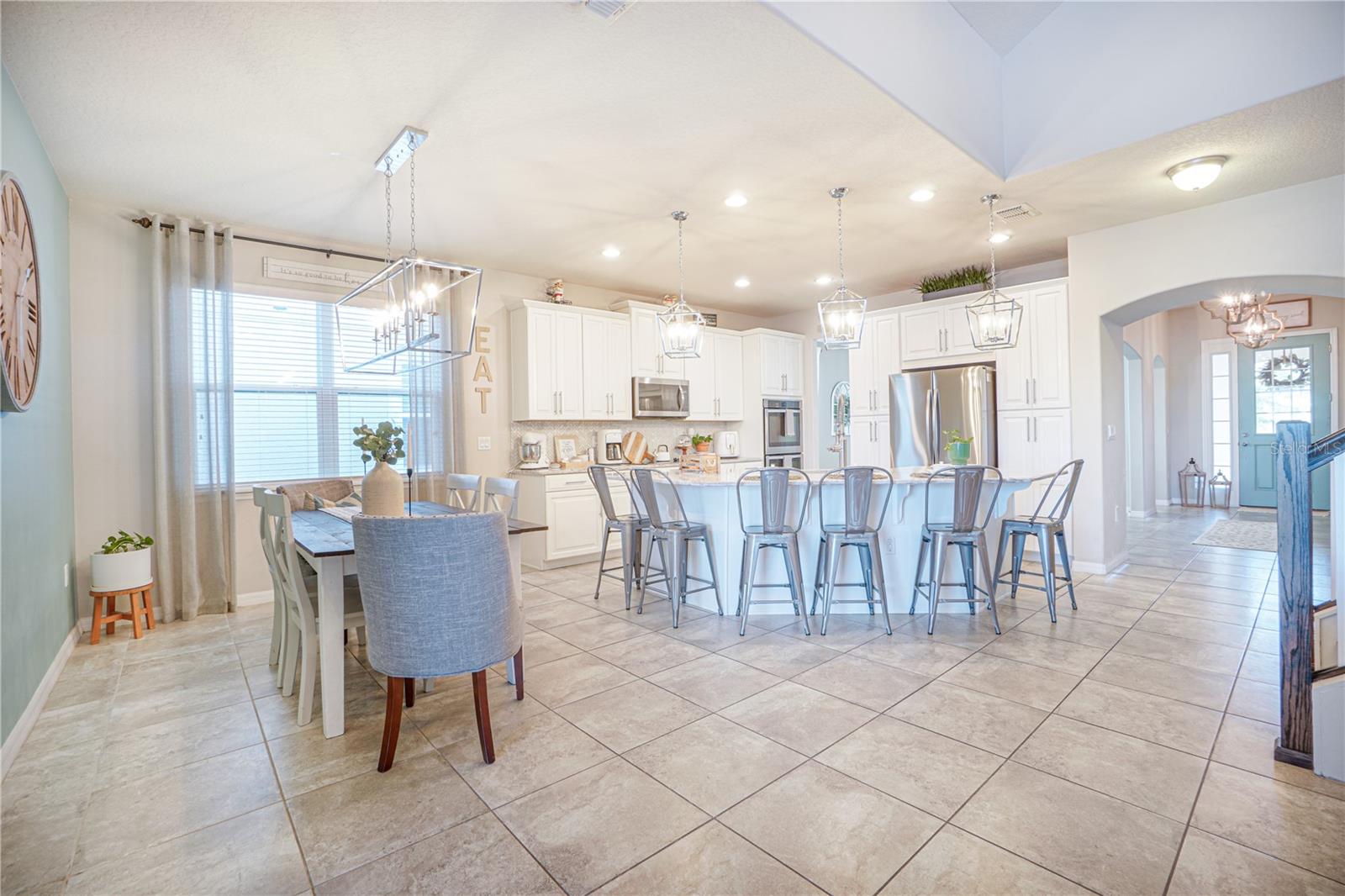 Welcome to this stunning 5-bedroom, 4-bath pool home located in the highly sought-after Tapestry community. From the moment you arrive, the charming front porch invites you in—and once inside, you’ll be captivated by elegant tray ceilings, designer light fixtures, and a bright, open layout. The formal living and dining areas offer a welcoming space for entertaining, while soaring ceilings and abundant natural light create an airy, luxurious feel. At the heart of the home, the gourmet kitchen is a chef’s dream—featuring granite countertops, stainless steel appliances, double ovens, a massive center island, upgraded cabinetry with crown molding, and ample cabinet and counter space, plus a cozy eat-in area. The kitchen flows seamlessly into the spacious family room, where oversized four-panel sliding doors open wide to reveal a sparkling screened-in pool with tranquil pond views—perfect for indoor-outdoor living and entertaining. The primary suite is a serene retreat, boasting elegant luxury vinyl flooring, dual vanities, a soaking tub, and a separate walk-in shower. Two additional bedrooms and a full hall bath are conveniently located off the family room, while a private guest bedroom and bathroom are tucked away at the back of the home. Upstairs, a generous loft offers flexible space—ideal for a kids’ lounge, home office, or game room—along with another full bedroom and bath. Enjoy Florida living at its finest from your private lanai, taking in the peaceful water views from the poolside. Tapestry is a premier gated community offering 24-hour security and resort-style amenities including a clubhouse, resort pool, fitness center, walking trails, dog park, playgrounds, sports fields, BBQ pavilion, ballroom, and an upgraded catering kitchen. Ideally located just minutes from The Loop shopping center, major highways, world-class dining, and Central Florida’s top attractions and theme parks. Don't miss your chance to own this incredible home—schedule your private showing today!