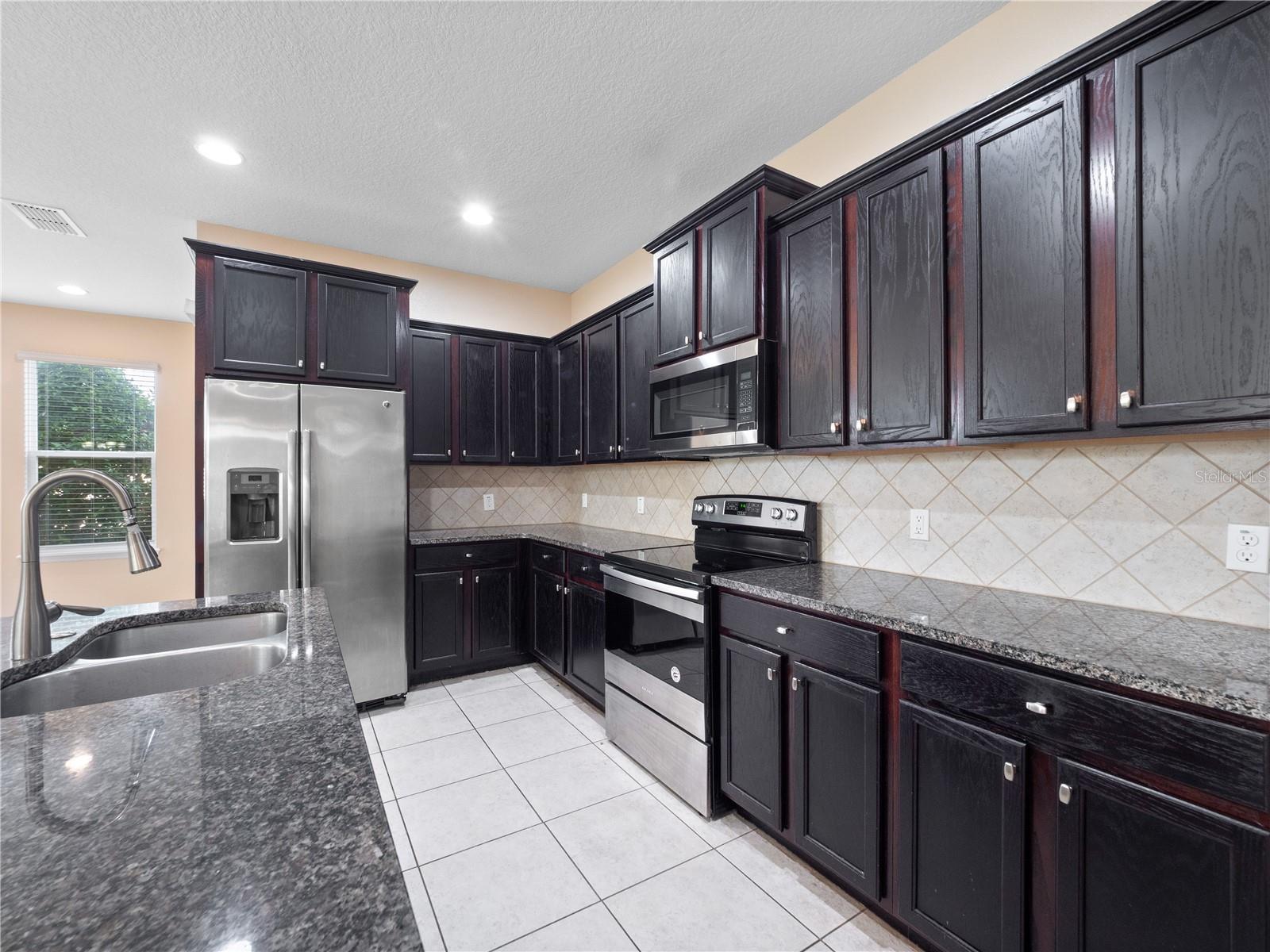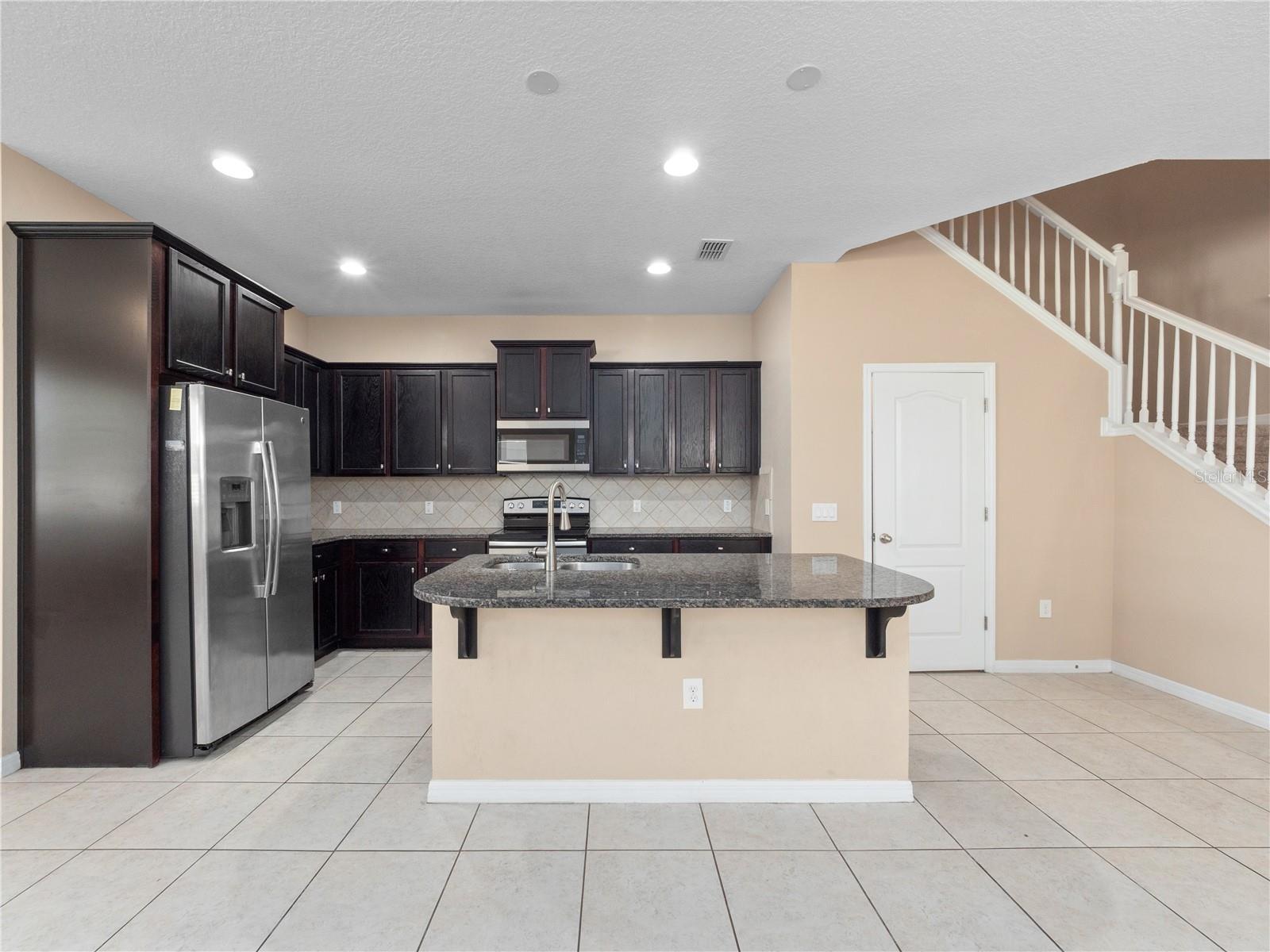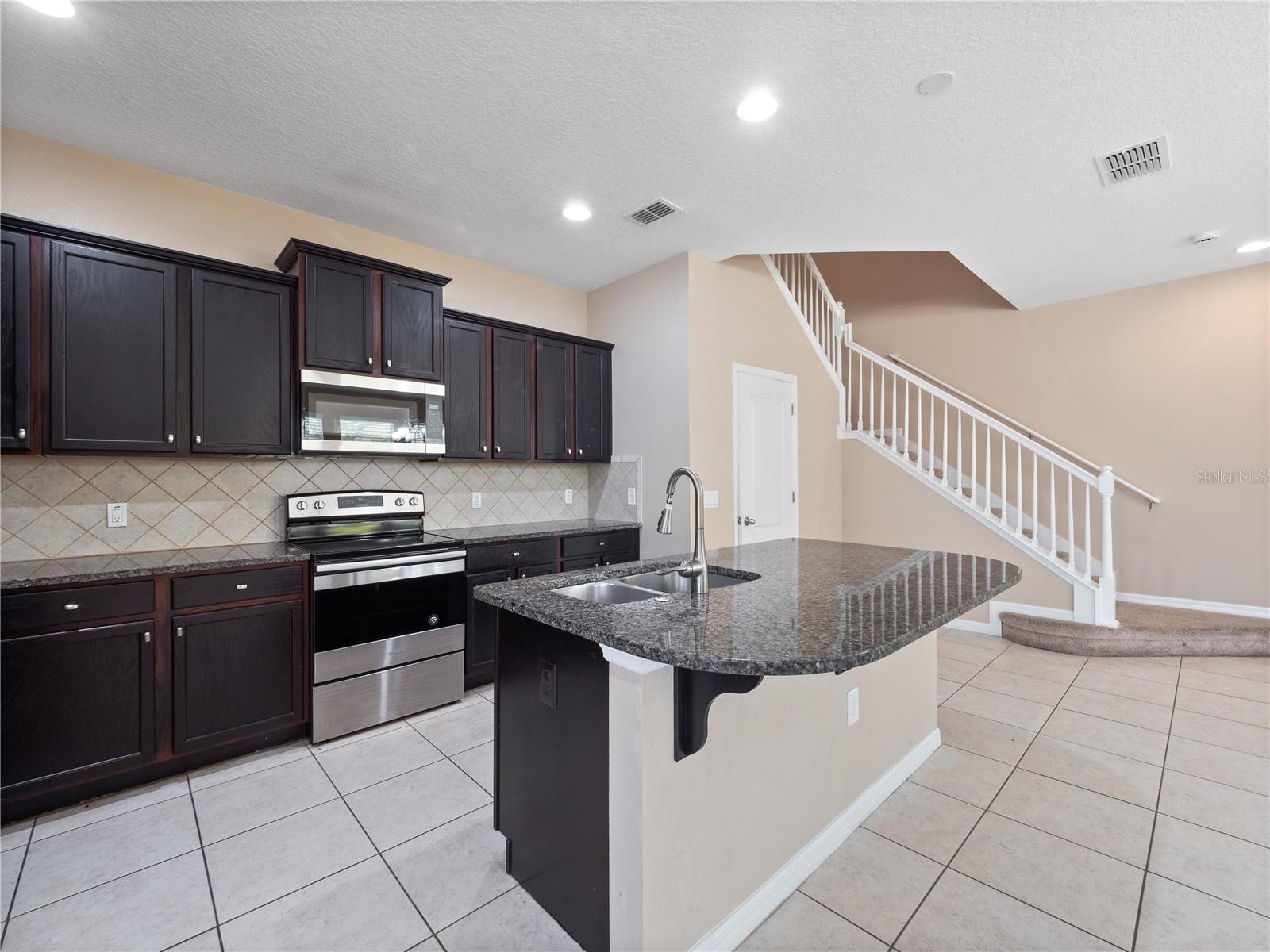 Welcome to this beautifully upgraded 3-bedroom + loft corner unit townhome located in the sought-after gated community of Heritage Run! From the moment you walk through the door, you'll be wowed by the sleek tile flooring that flows effortlessly across the entire first level, creating a seamless blend of modern style and everyday comfort. The heart of the home is the gourmet kitchen, an entertainer’s dream with 42-inch real wood cabinetry, glistening granite countertops, stainless steel appliances (including a brand-new microwave), and an oversized breakfast bar perfect for gatherings. Upstairs, retreat to your expansive primary suite, complete with a spa-like en suite bath featuring dual vanities, a walk-in shower, and a huge walk-in closet. The versatile loft space offers the perfect flex area for a home office, gym, or media space. The two secondary bedrooms are spacious and thoughtfully designed with private vanities and a shared guest bath—ideal for family or guests. Step outside to your screened-in porch overlooking peaceful greenspace—an ideal spot for sipping coffee, unwinding after work, or enjoying weekend mornings. Washer and dryer included for your convenience. Perfectly located near Highway 192 and the Turnpike, you’re just minutes from world-class shopping, dining, Walt Disney World, and Orlando International Airport. Homes like this don’t last, schedule your private tour, TODAY!