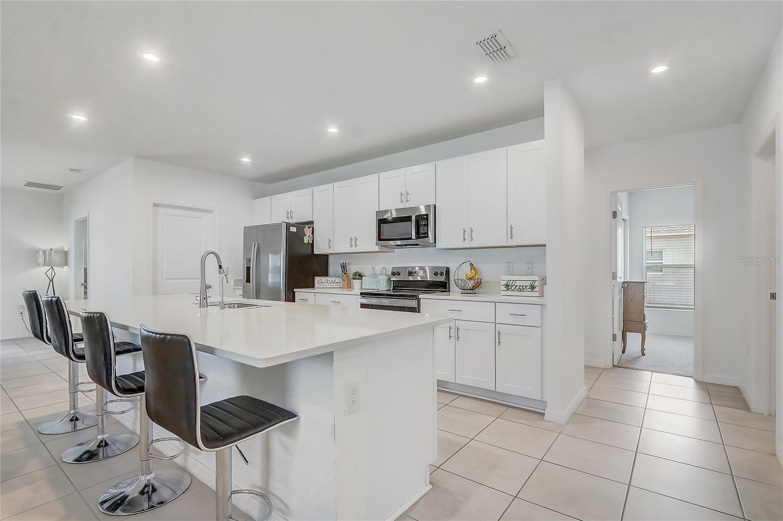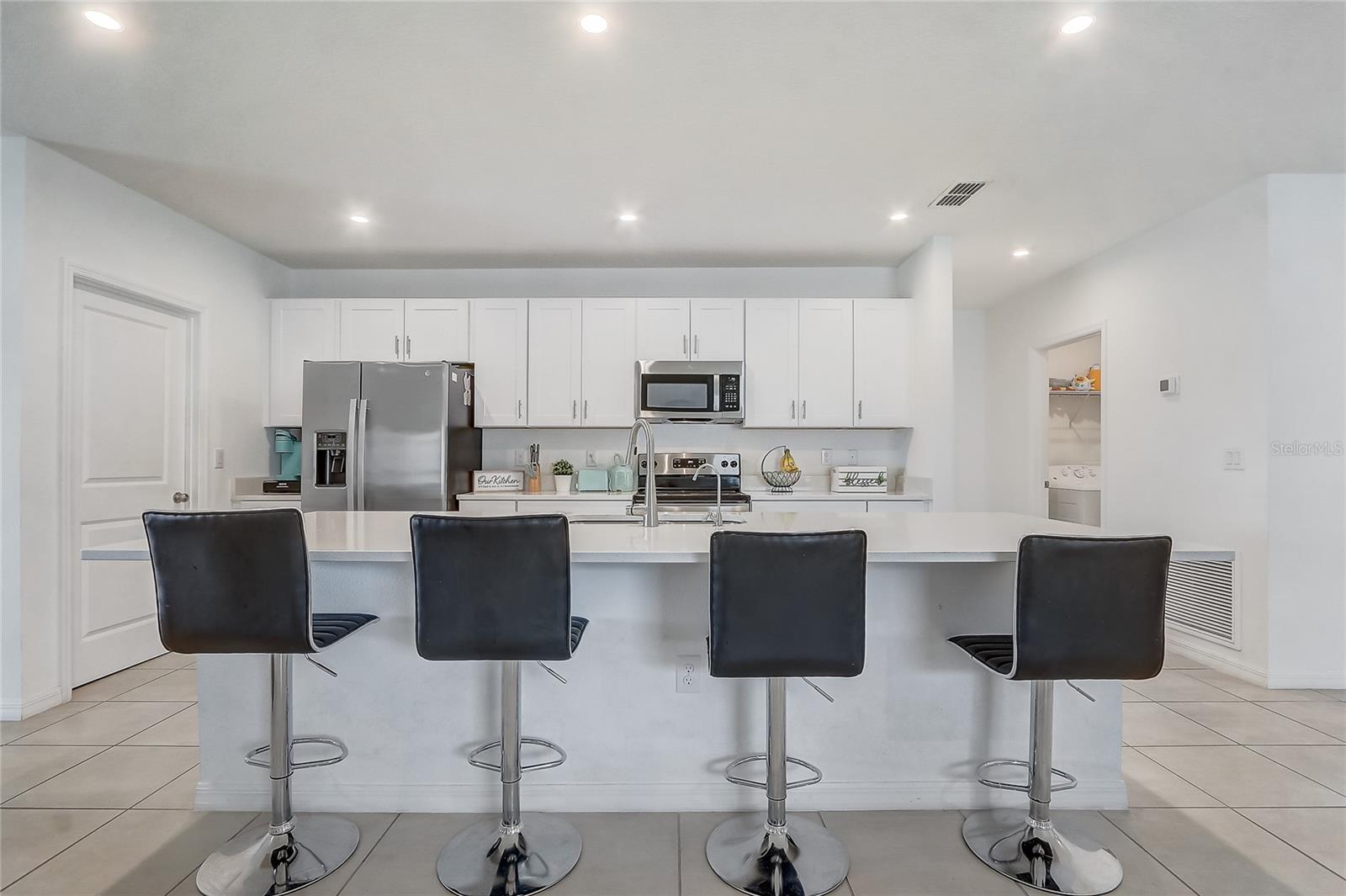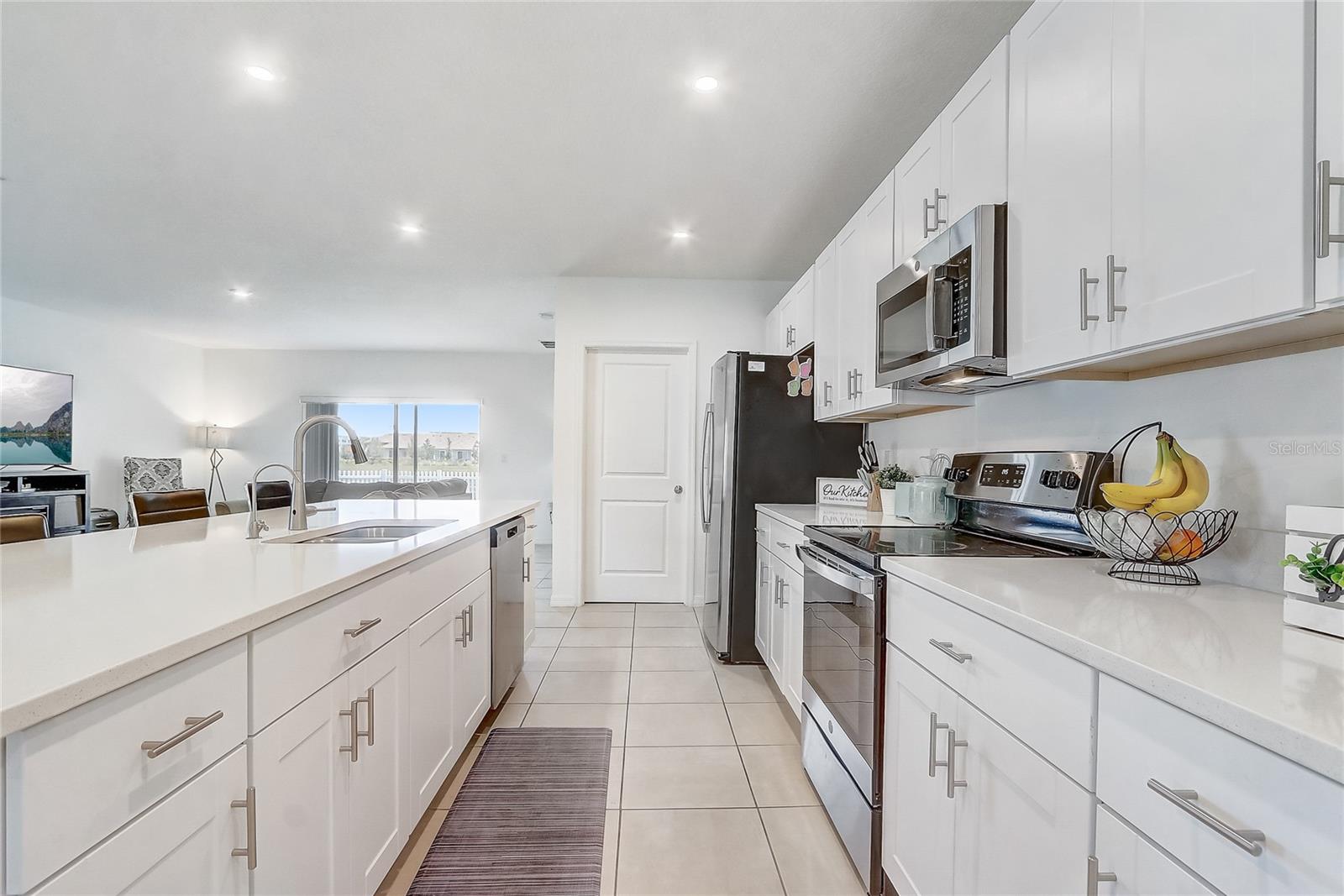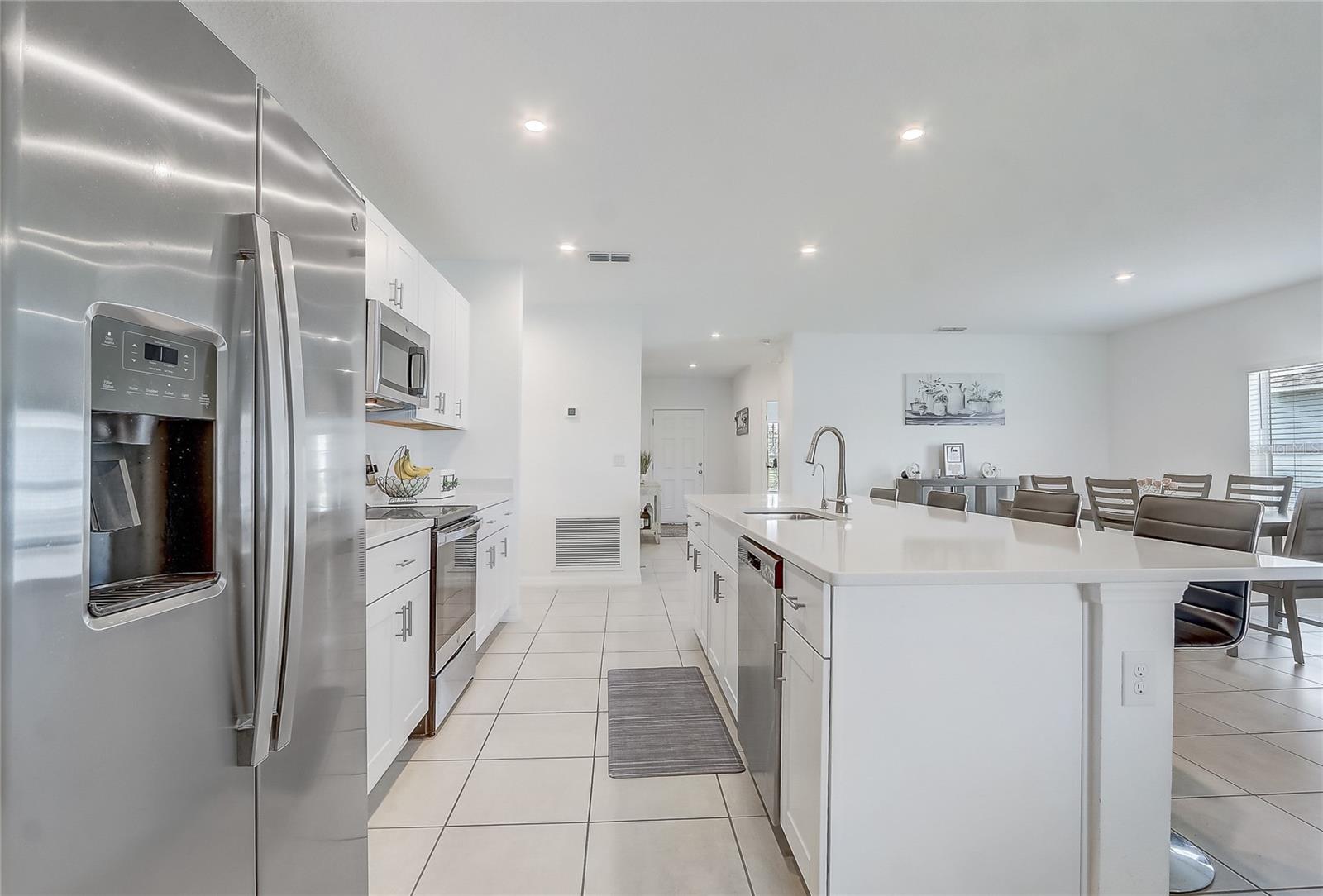 MAJOR PRICE ADJUSTMENT - SELLER SAYS BRING OFFERS!!!! Welcome to this beautiful 4-bedroom, 3-bathroom home in the heart of Kissimmee, Florida! Offering 2,091 square feet of thoughtfully designed living space, this home sits on a generous 0.21-acre lot that backs directly onto a tranquil pond—perfect for relaxing evenings and serene views. As you step inside, you'll be greeted by a spacious open floorplan that seamlessly connects the kitchen, dining area, and living room, ideal for entertaining and everyday living. The kitchen boasts a large center island, solid surface countertops, stainless steel appliances, and a pantry for ample storage. The living room is filled with natural light and features a sliding glass door that opens to a covered patio and a fully fenced backyard. The primary suite is a true retreat with a walk-in closet and a private en suite bathroom featuring dual sinks and a walk-in shower. Modern finishes can be found throughout the home, including ceramic tile flooring in the main living areas and cozy carpet in the bedrooms. A two-car garage adds convenience, while the peaceful pond view and spacious backyard make this home truly special.