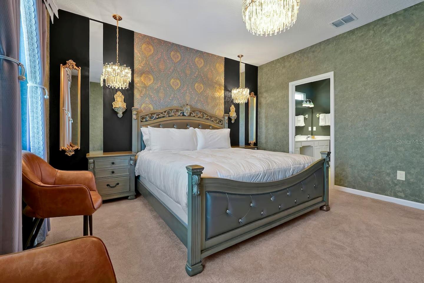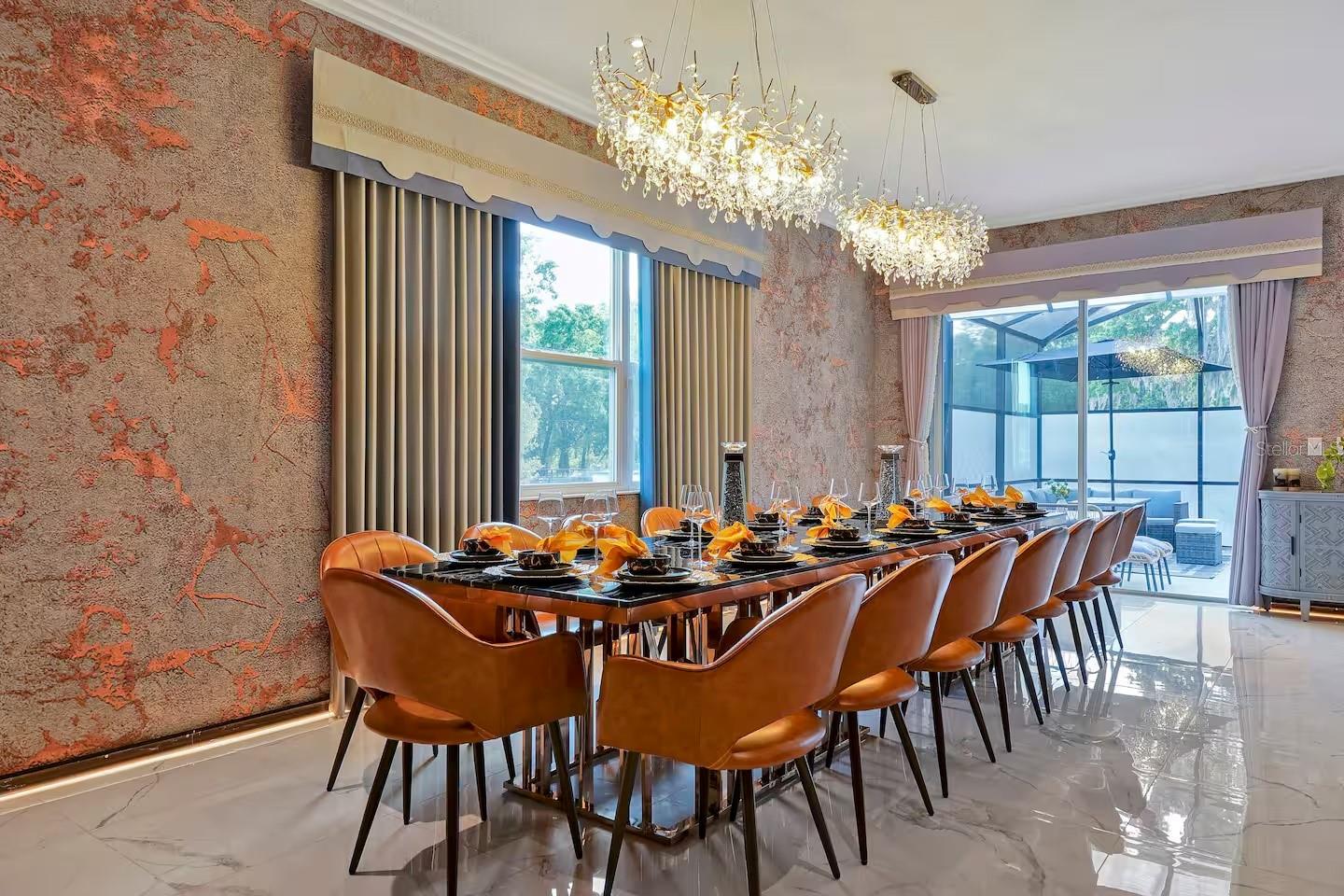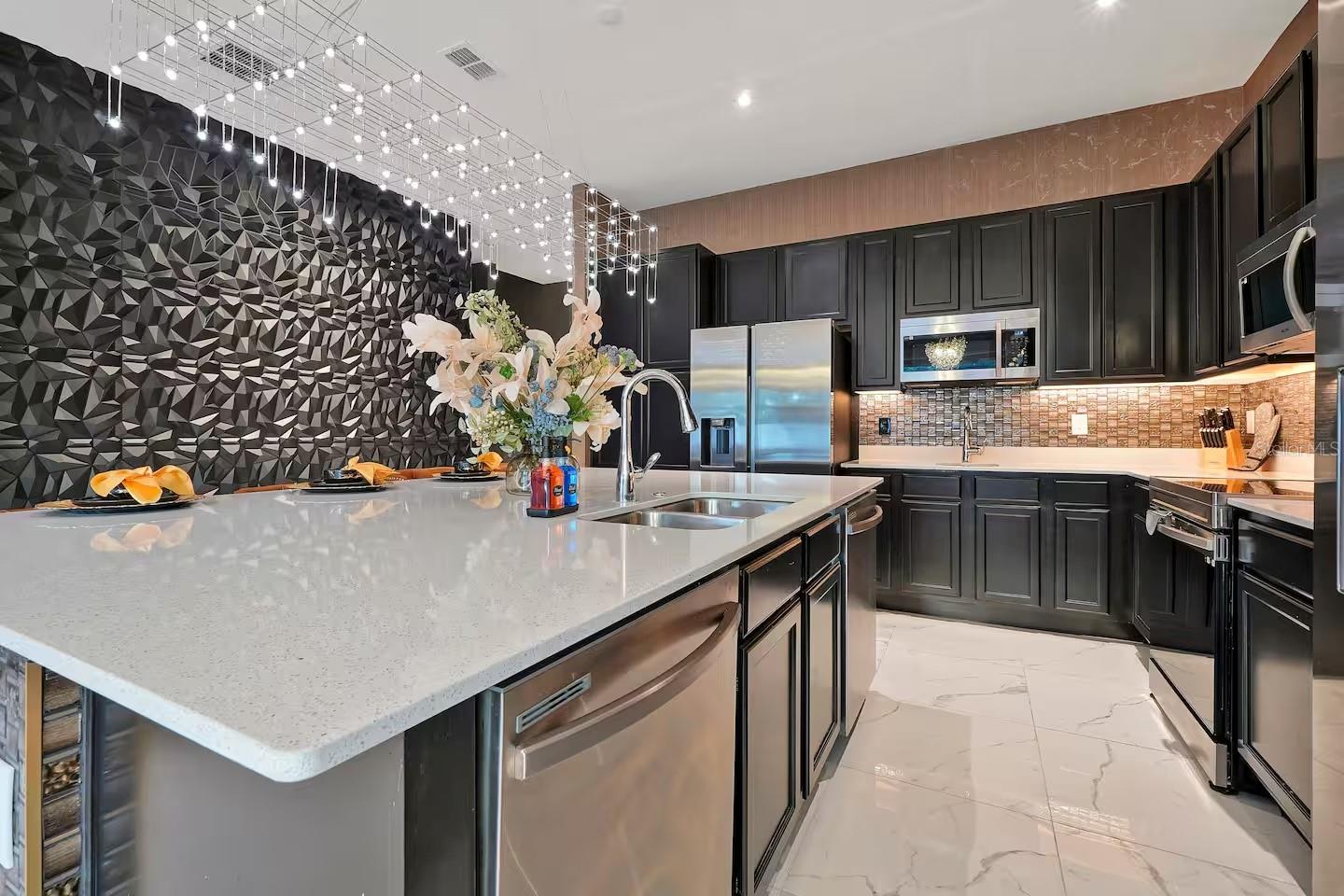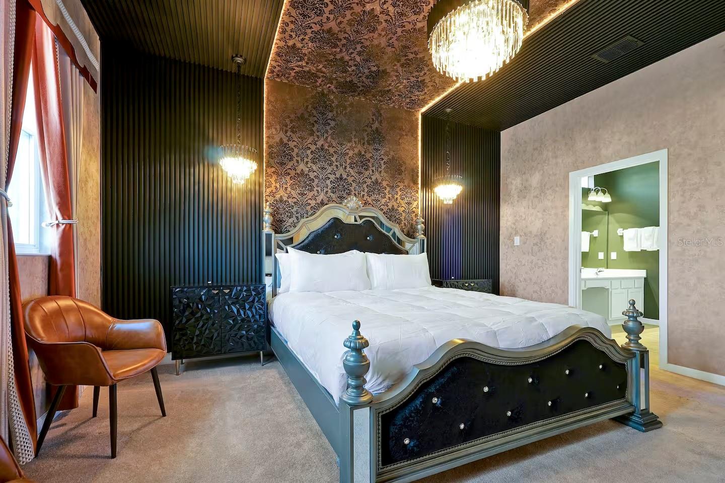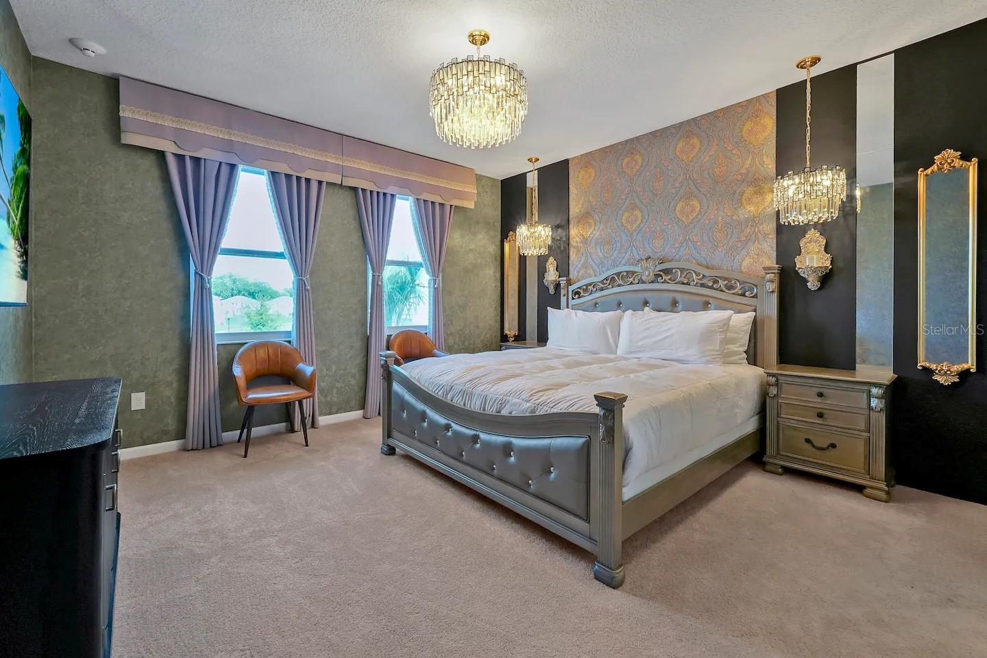 Just reduced by $152,000! Priced to sell! Exceptional Investment Opportunity! This stunning, fully furnished and professionally themed vacation home in the sought-after Veranda Palms community generated over $150,000 in gross rental income last year—with future bookings already in place that can seamlessly transfer to the new owner if continuing with the current management company. The seller has invested over $300,000 in luxury designer furnishings, high-end upgrades, and custom décor, making this property truly one-of-a-kind within the community. Boasting 12 bedrooms and 11.5 bathrooms, including two spacious master suites (one on each floor), this home is built for comfort, functionality, and a true resort-style experience. The gourmet kitchen is equipped with two microwaves, two refrigerators, two dishwashers, dual sinks, and upgraded tile finishes on both the backsplash and island. The open-concept living area has been thoughtfully expanded by enclosing the California room, and the home is loaded with upscale features including: Custom LED lighting, Accent walls and large format tile downstairs, Wood flooring upstairs, Designer light fixtures throughout, Six bathrooms upgraded with sleek, glass-enclosed showers and custom wallpaper, Hidden LED mood lighting integrated into baseboards across common areas on both floors. Entertainment is elevated with a private theater room, complete with a 120” screen, HD projector, starry ceiling, and reclining theater seating—ideal for unforgettable movie nights. Step outside to your private backyard retreat, featuring a heated pool, spa, and lounge area. With no rear neighbors and privacy film on the pool screen, this outdoor space is perfect for quiet relaxation or entertaining guests. Located just minutes from Disney parks, premium outlets, and top community amenities, and with low HOA fees and no CDD, this beautifully upgraded, turnkey income-producing property is the ideal short-term rental investment.