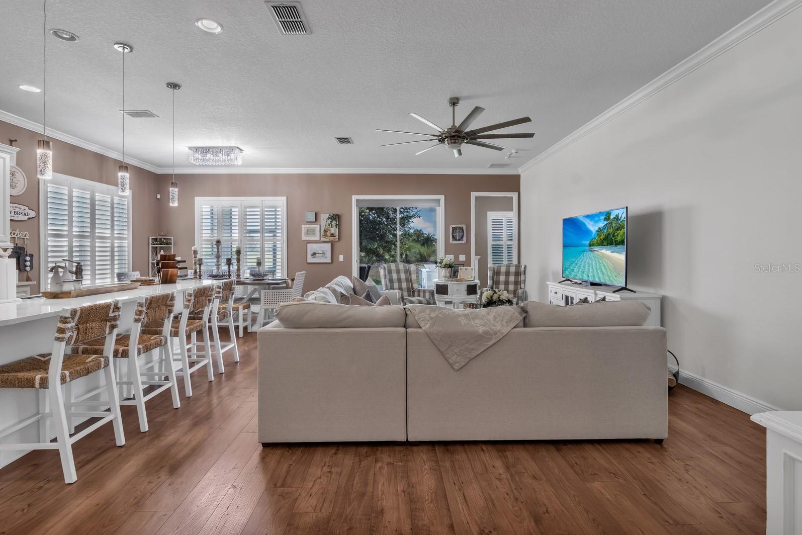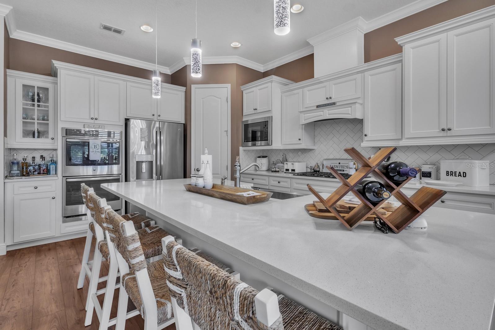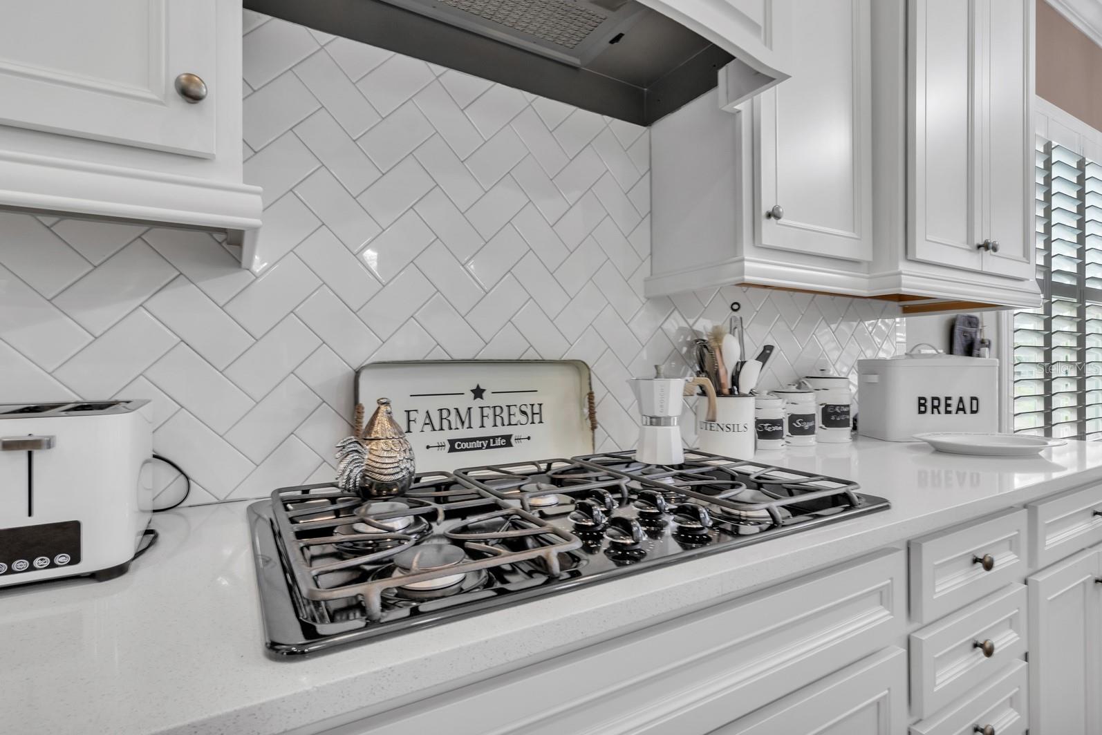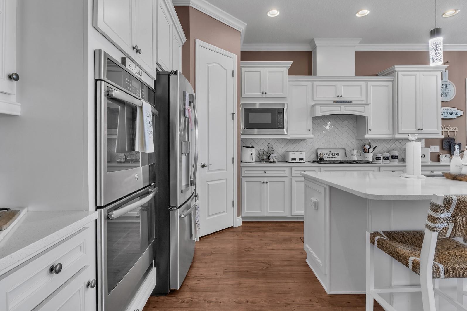 Must see this like new home the “St Thomas” model built by K. Hovnanian’s, this home features many upgrades and is located right on the golf course at Four Seasons at Orlando, one of Central Florida newest and most desirable 55+ communities. Enter and appreciate the Grand Foyer it’s very warm and inviting with the architectural design on tray ceiling, beautiful flooring which makes it’s way into the open floorplan of the kitchen and living area. You will find crown molding throughout the main living area and plantation shutters. The kitchen is a chef’s paradise where you will find, blanco maple quartz counter tops, huge island can accommodate up to 6 seats, a 5 burner gas cooktop with decorative vent hood, built in stainless steel GE double convection ovens and refrigerator, stainless steel apron sink and large walk in corner pantry. In the back of the house, you will find the master featuring an incredibly large walk in closet, double sinks, walk in shower featuring beautiful bianco carrrera tiles throughout. The other two rooms are at the front of the house at entry with a shared full bathroom. There is a private office space off the hallway which sellers used to place a small bed. By the garage entry you will find a large laundry room with front load washer and gas dryer, this home also provides a tankless gas water heater for efficiency. The exterior porch area is another entertaining paradise the outdoor kitchen has under counter refrigerator, storage and sink. This home is perfect for active adult lifestyle, with beautiful Club house, fitness center, pools, tennis courts, pickle ball courts and much more. Located near all the mayor park attractions such as Disney Parks and Resorts. The community is gated and manned by security 24/7.