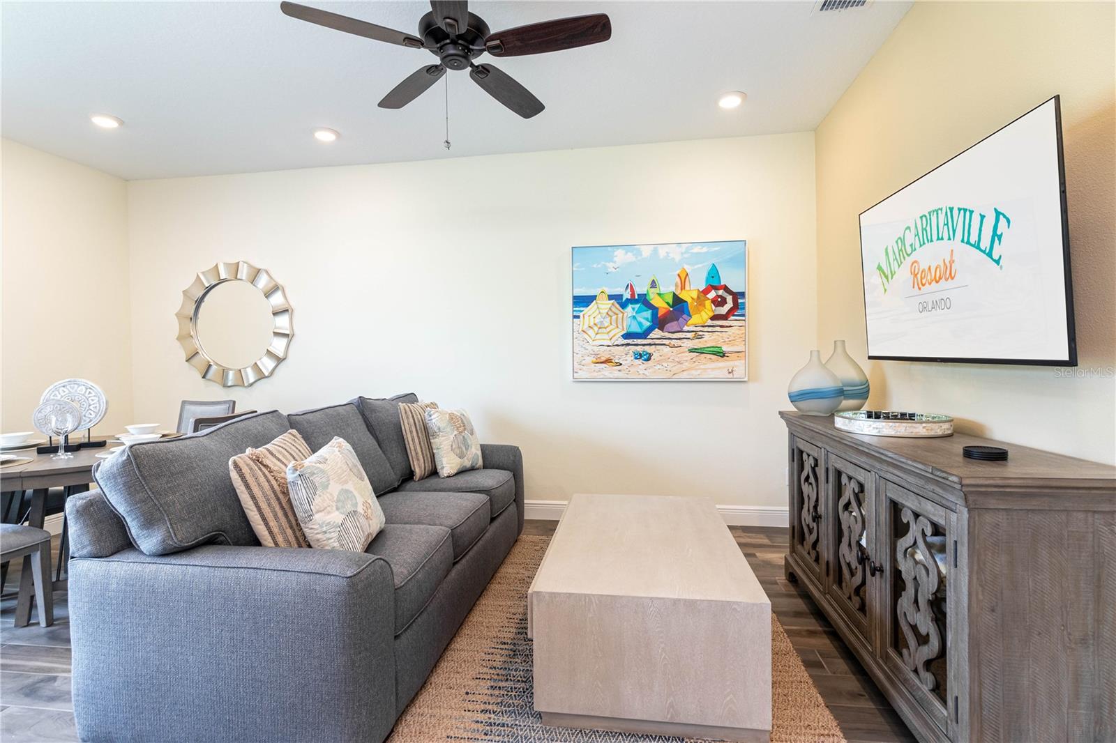 Own a Slice of Paradise in Margaritaville Resort! Welcome to this move-in-ready, fully furnished 3-bedroom, 3-bathroom villa, nestled in the heart of the world-famous Margaritaville Orlando Resort. Whether you’re seeking a luxurious second home, a high-performing short-term rental, or both, this tropical oasis is a dream come true. Step Inside Paradise: This beautifully designed Key West-style villa features three spacious en-suite bedrooms, an open-concept living and dining area, and stylish finishes throughout. Large sliding glass doors lead to your private paved patio, perfect for morning coffee or evening cocktails. The bright, light-filled interior boasts 10-foot ceilings, 8-foot doors, wood-look tile flooring, and ceiling fans that enhance the breezy tropical feel. A modern kitchen awaits with sleek quartz countertops, a breakfast bar, and high-end Samsung stainless steel appliances, including a washer and dryer. Fully Turnkey – Just Bring Your Flip-Flops: Offered with the Margaritaville-approved furniture and housewares package, the villa comes fully stocked with everything you need to start enjoying or renting right away: furnishings, TVs, artwork, kitchen essentials, linens, and more. There's even a private owner's lockable closet for personal items and double-paned windows for energy efficiency and quiet comfort. Resort-Style Living Redefined: Live the good life with exclusive access to multiple lagoon-style pools, private cabanas, a fitness center, full-service spa, H2O water park, Fins Up Beach Club with live entertainment, and more. Just steps from your door, you’ll find top-rated dining, vibrant nightlife, and boutique shopping at Sunset Walk. And when adventure calls, you’re less than 5 miles from Disney World, Universal Studios, and other world-famous attractions. A Smart Investment Opportunity: Zoned for short-term rentals, this villa presents a high-income potential in one of Florida’s most in-demand vacation destinations. Enjoy the flexibility to use it for personal getaways while earning passive income when you’re away. With year-round tourism and strong rental demand, this property is truly an investor’s dream.