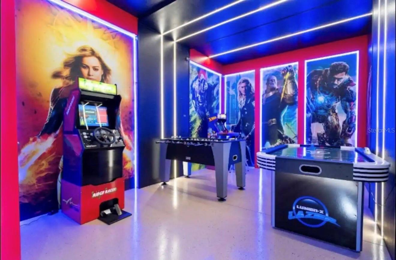 Welcome to your dream retreat at Solara Resort! This stunning, professionally decorated home features two luxurious primary suites—one on the main floor and another upstairs—perfect for multi-generational living or vacation guests. Enjoy the open-concept kitchen and living room, designed for both comfort and entertaining. Step outside to your private oasis with a sparkling pool, heated spa, oversized lanai, and a convenient pool bathroom. Upstairs, a bonus room awaits—complete with a TV projector movie setup, game table, and dedicated office space for work or play. The home comes fully furnished with upscale furniture, offering a true turn-key experience. Garage was converted to an impressive modern arcade room. Located on a premium lot with added privacy, this home is just a 2-minute walk to the clubhouse and close to guest parking. The resort-style community offers incredible amenities including restaurants, a convenience store, fitness center, playground, soccer field, walking trails, and a tiki bar with an aqua park for kiddos. All this just under 20 minutes to Walt Disney World, with easy access to Hwy 429, US-27, I-4, and all major shopping, dining, and entertainment. Whether you’re looking for a second residence, vacation home, or investment opportunity, this property checks every box! Call us now to schedule your private tour.