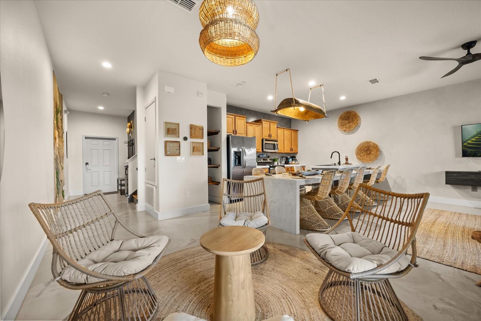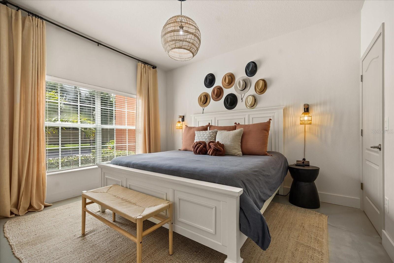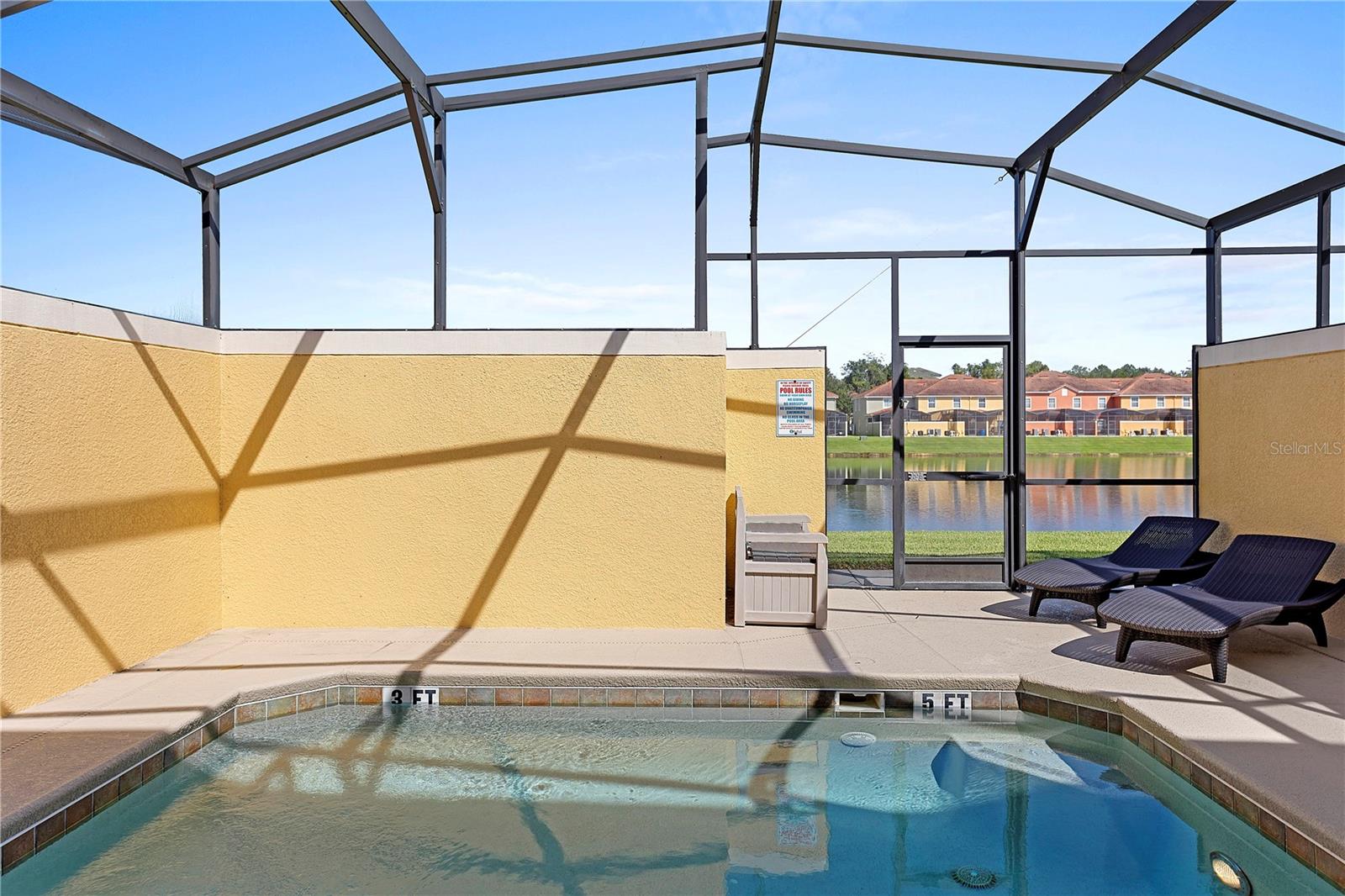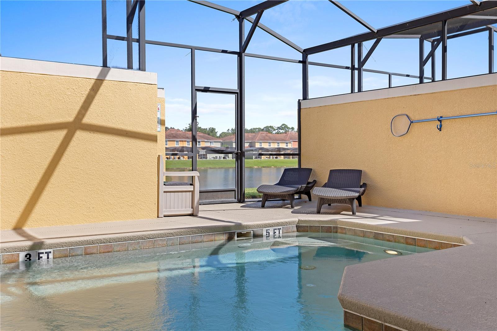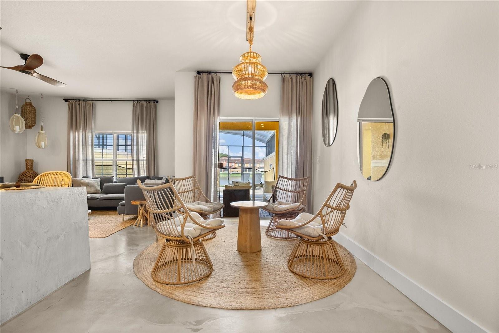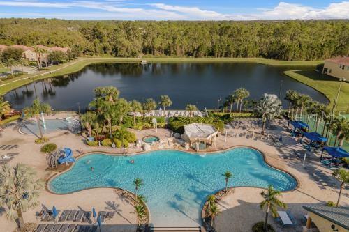 Welcome to a beautifully designed, tastefully remodeled, fully furnished 4-bedroom/3 bathrooms townhouse located in a highly desirable gated community Paradise Palms Resort-just minutes from Disney and major attractions. This turn-key property is currently a successful Airbnb with exceptional 5 star reviews that can be purchased as primary residence or investment property as it's zoned for short term rentals. Step inside the two-story home and be welcomed by an open concept floor plan. The thoughtfully curated interior features natural textures and tones, concrete counter tops and concrete floors and high-end Boho decor that instantly make guests feel at home. Enjoy a chef-style kitchen with stainless steel appliances, a large concrete waterfall-edge island that sits eight. The open concept layout flows into a spacious living area with two sitting areas, perfect for hosting family or group stays. Bedrooms include three designer-inspired king suites and one additional bedroom with 2 twin beds, all decorated with the feel of a boutique hotel level. One bedroom and full bathroom are conveniently located on the first floor. Relax in the private screened in patio with lake views, swim in private heated pool or sip your morning coffee in the cozy rattan sitting nook. The resort offers a great amount of amenities, giant community pool, movie theater, tennis court, gym and more to keep guests entertained. HOA fee includes internet and cable, and also HOA covers home owner's insurance for exterior of the building so you only have to obtain HO-6 coverage. Whether you are looking for a revenue generating vacation rental or a stylish personal retreat, this home is ready to impress.