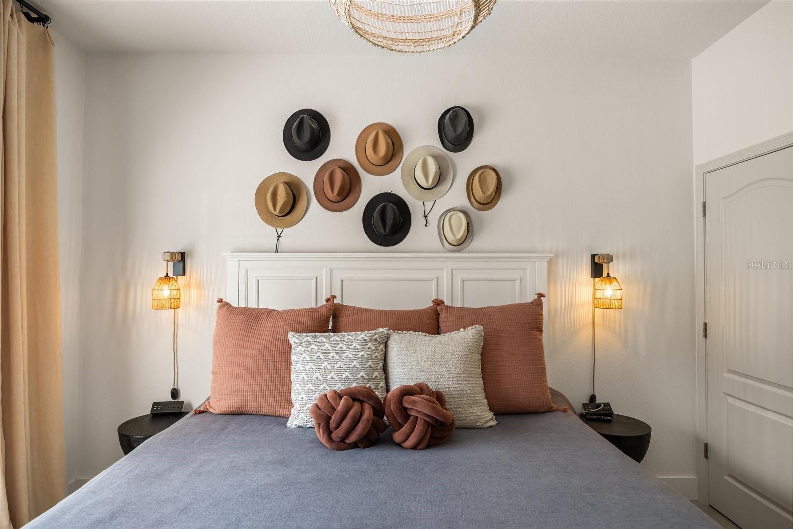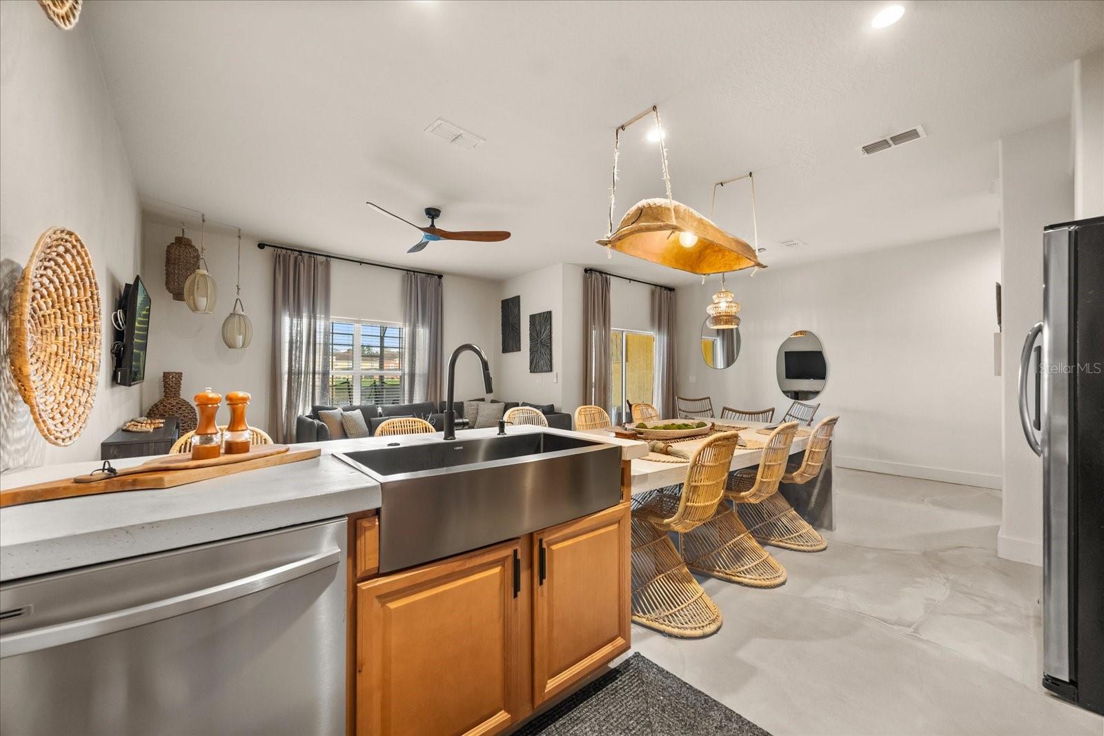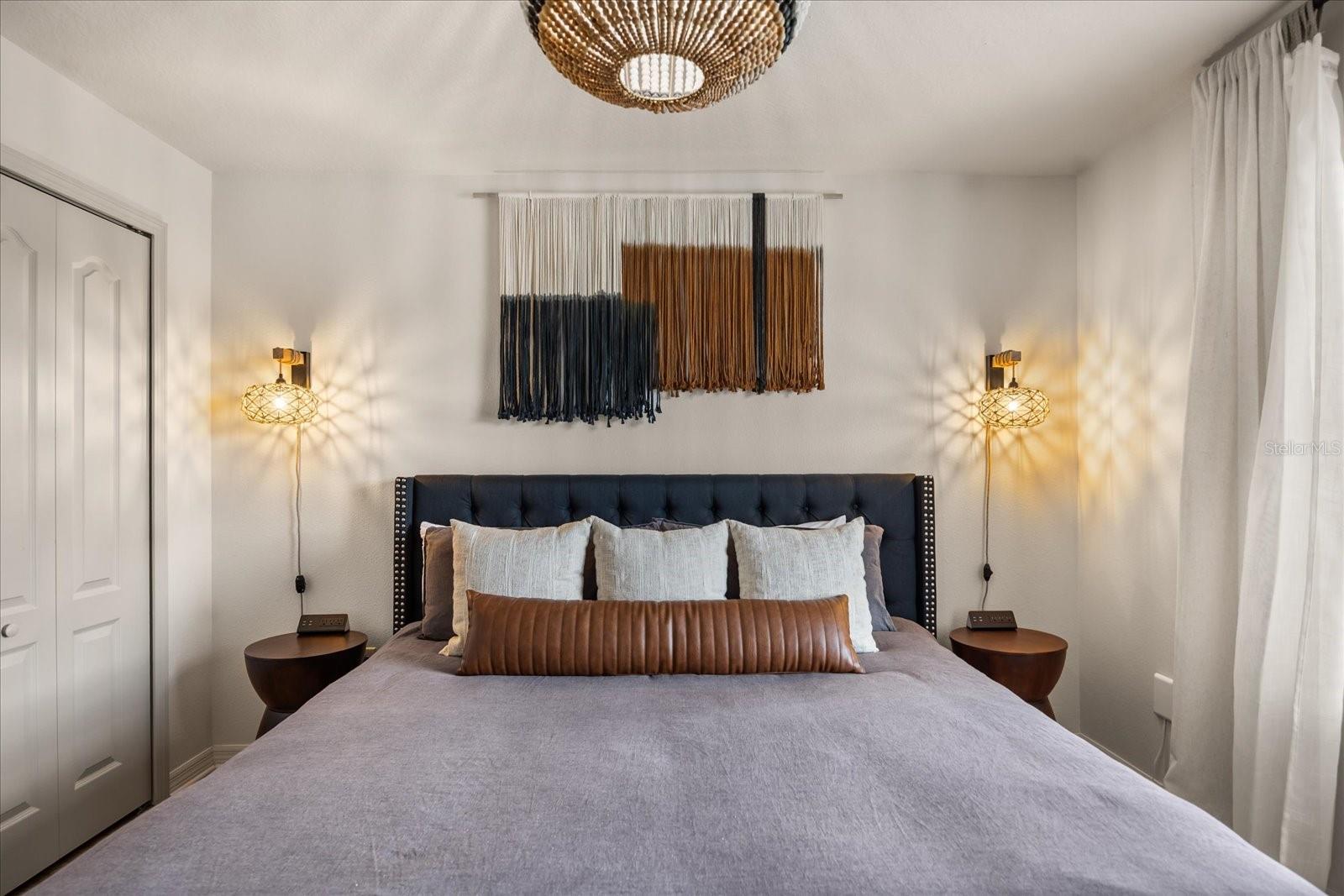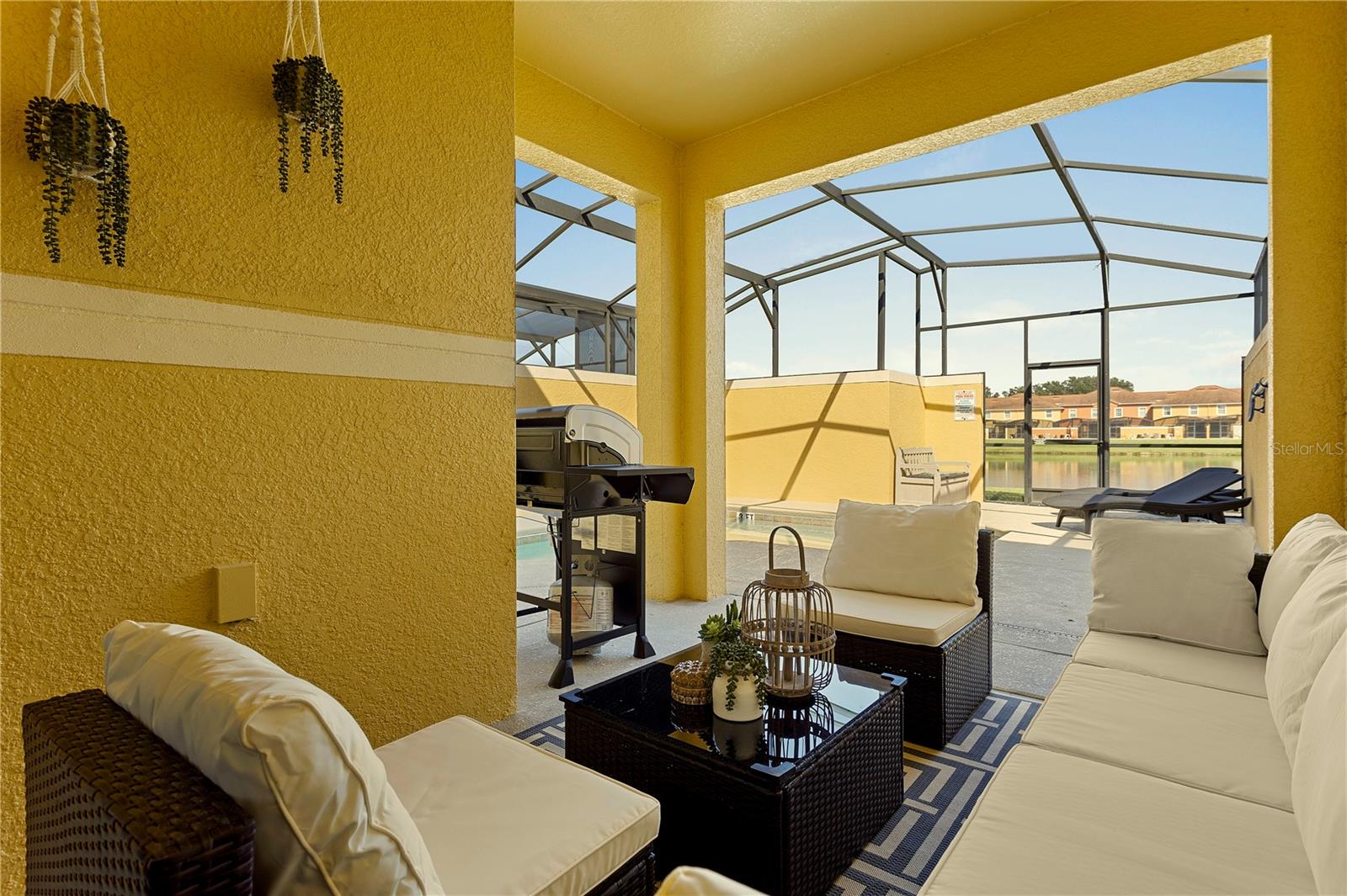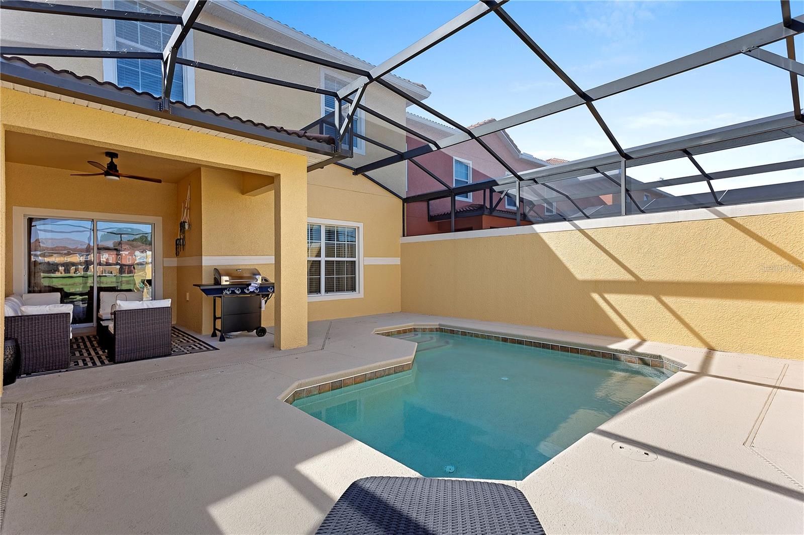 Welcome to a beautifully designed, tastefully remodeled, fully furnished 4-bedroom/3 bathrooms townhouse located in a highly desirable gated community Paradise Palms Resort-just minutes from Disney and major attractions. This turn-key property is currently a successful Airbnb with exceptional 5 star reviews that can be purchased as primary residence or investment property as it's zoned for short term rentals. Step inside the two-story home and be welcomed by an open concept floor plan. The thoughtfully curated interior features natural textures and tones, concrete counter tops and concrete floors and high-end Boho decor that instantly make guests feel at home. Enjoy a chef-style kitchen with stainless steel appliances, a large concrete waterfall-edge island that sits eight. The open concept layout flows into a spacious living area with two sitting areas, perfect for hosting family or group stays. Bedrooms include three designer-inspired king suites and one additional bedroom with 2 twin beds, all decorated with the feel of a boutique hotel level. One bedroom and full bathroom are conveniently located on the first floor. Relax in the private screened in patio with lake views, swim in private heated pool or sip your morning coffee in the cozy rattan sitting nook. The resort offers a great amount of amenities, giant community pool, movie theater, tennis court, gym and more to keep guests entertained. HOA fee includes internet and cable, and also HOA covers home owner's insurance for exterior of the building so you only have to obtain HO-6 coverage. Whether you are looking for a revenue generating vacation rental or a stylish personal retreat, this home is ready to impress.