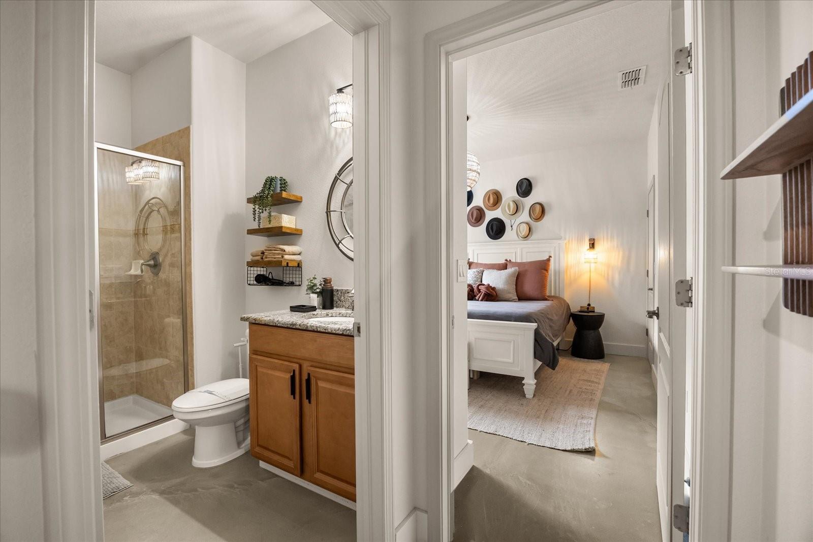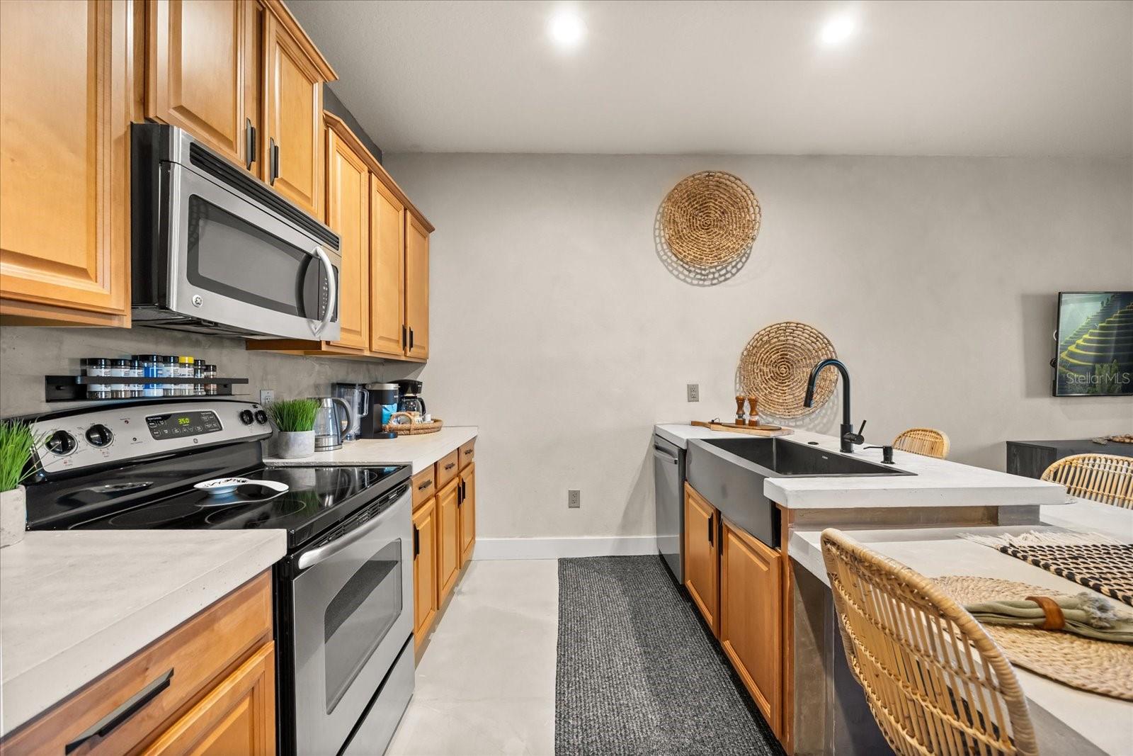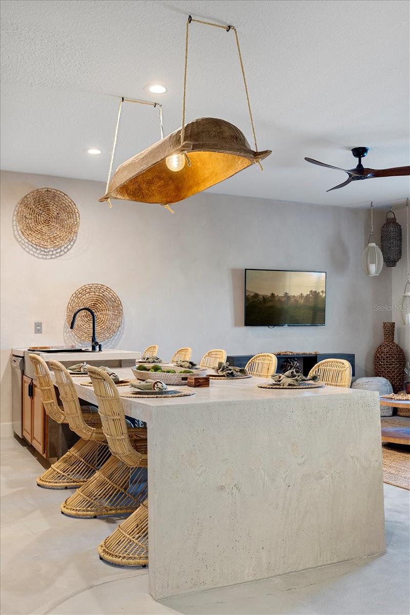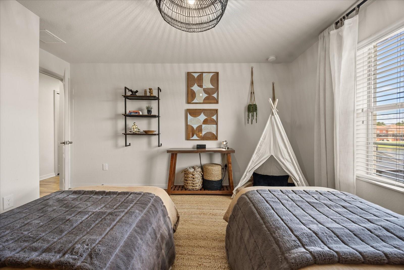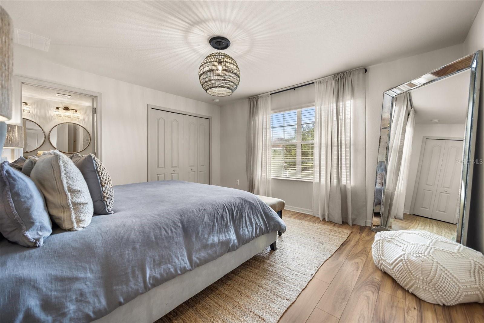Welcome to a beautifully designed, tastefully remodeled, fully furnished 4-bedroom/3 bathrooms townhouse located in a highly desirable gated community Paradise Palms Resort-just minutes from Disney and major attractions. This turn-key property is currently a successful Airbnb with exceptional 5 star reviews that can be purchased as primary residence or investment property as it's zoned for short term rentals. Step inside the two-story home and be welcomed by an open concept floor plan. The thoughtfully curated interior features natural textures and tones, concrete counter tops and concrete floors and high-end Boho decor that instantly make guests feel at home. Enjoy a chef-style kitchen with stainless steel appliances, a large concrete waterfall-edge island that sits eight. The open concept layout flows into a spacious living area with two sitting areas, perfect for hosting family or group stays. Bedrooms include three designer-inspired king suites and one additional bedroom with 2 twin beds, all decorated with the feel of a boutique hotel level. One bedroom and full bathroom are conveniently located on the first floor. Relax in the private screened in patio with lake views, swim in private heated pool or sip your morning coffee in the cozy rattan sitting nook. The resort offers a great amount of amenities, giant community pool, movie theater, tennis court, gym and more to keep guests entertained. HOA fee includes internet and cable, and also HOA covers home owner's insurance for exterior of the building so you only have to obtain HO-6 coverage. Whether you are looking for a revenue generating vacation rental or a stylish personal retreat, this home is ready to impress.