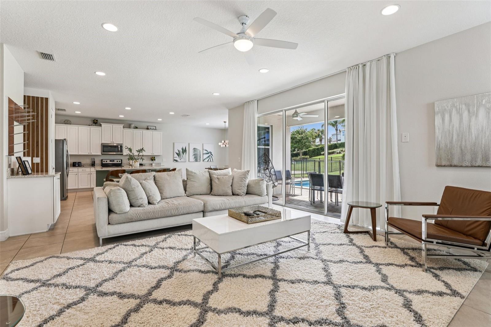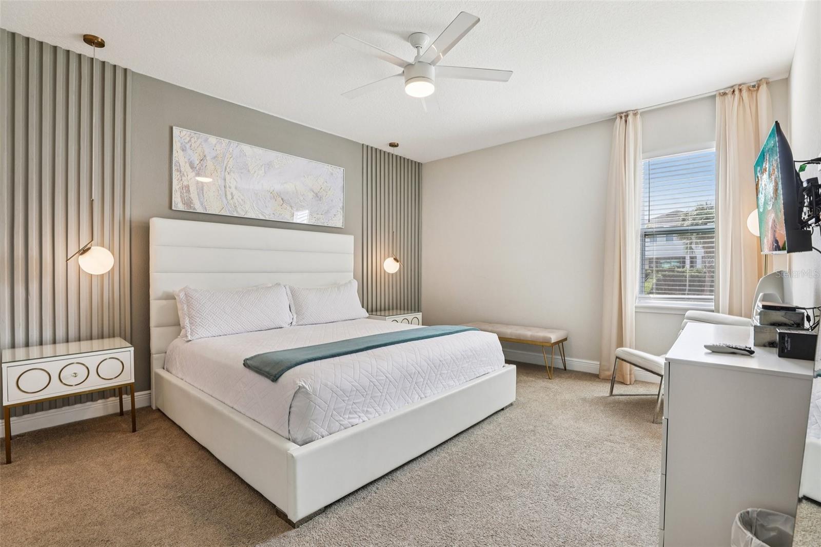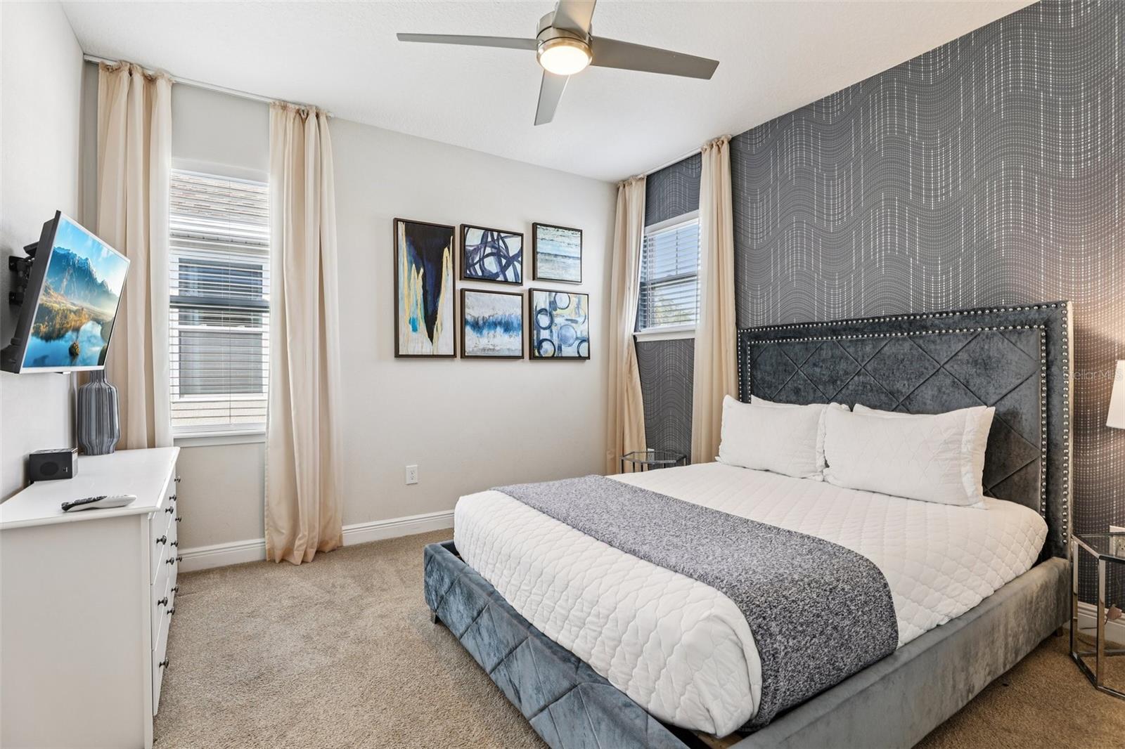 TURNKEY- FULLY FURNISHED! 5 bedroom/5.5 bathroom home is ideal for your next vacation getaway or investment opportunity with potential for short-term rental income. The first floor features an open floorplan with great room, eat in kitchen with island and SS appliances and guest bedroom with en-suite. Step out onto the lanai to enjoy heated pool and spa or the garage which has been converted into a game room. Upstairs, there's a loft/bonus room accompanied by four bedrooms, each with its own private bathroom. Your HOA covers pool maintenance, lawn care, and landscaping, freeing you to indulge in the luxury amenities Encore at Reunion Resort boasts. Reunion West offers resort amenities including a water park, fitness center, basketball courts, volleyball, and tennis. The clubhouse offers a marketplace, casual bar, restaurants, and a concierge desk for booking tickets, spa services, reservations, and resort shuttles. Checkout the 3D tour online and schedule a private viewing today!
