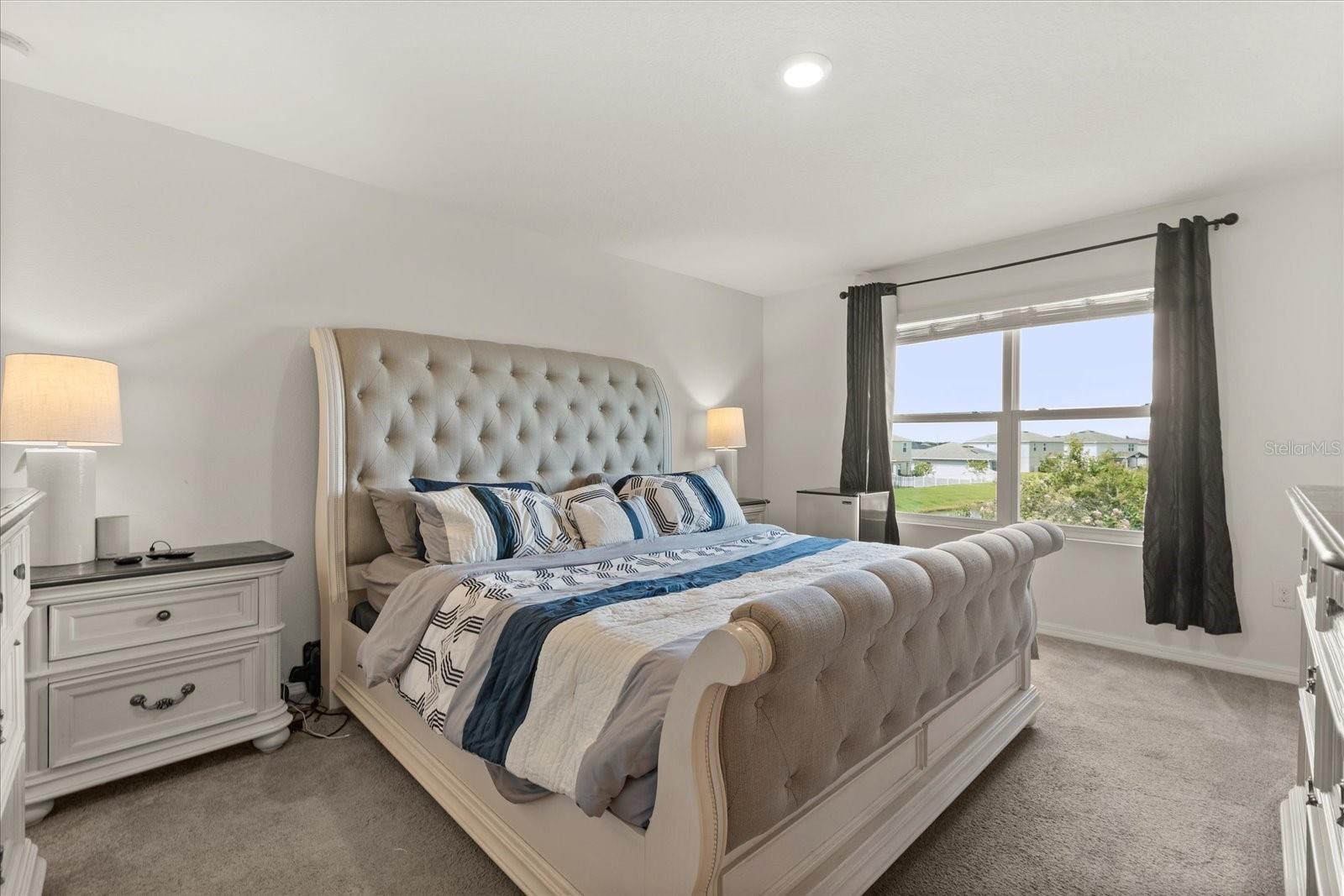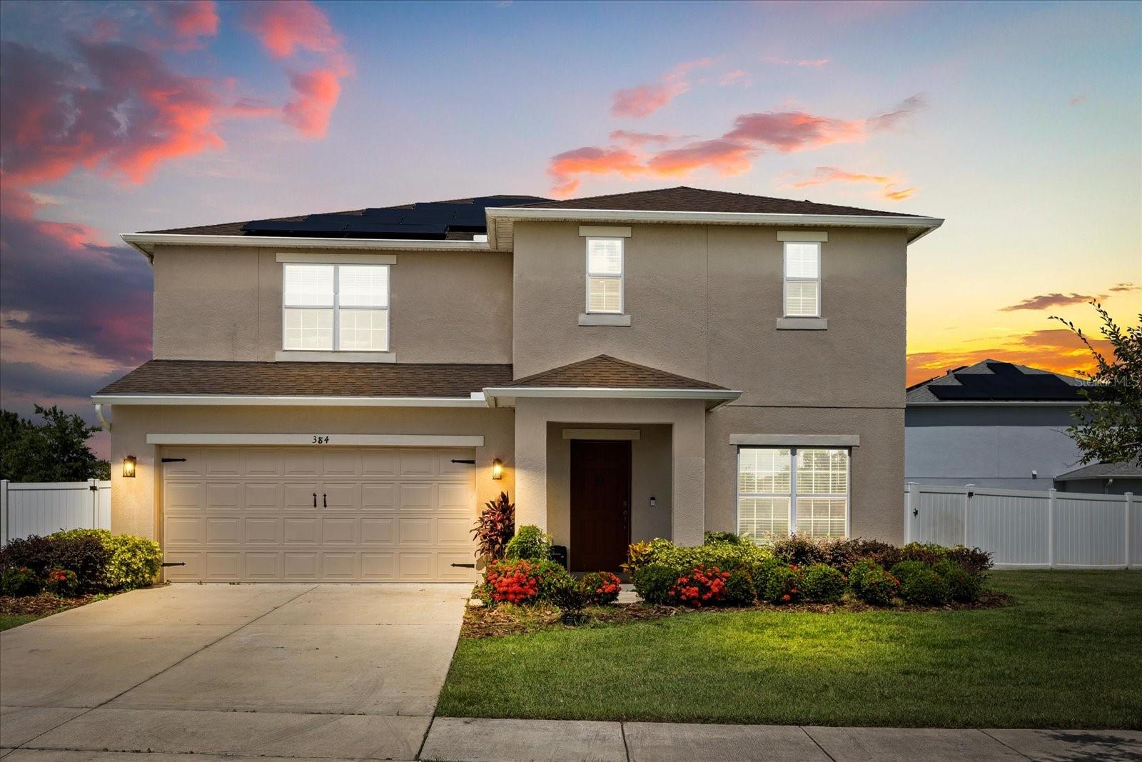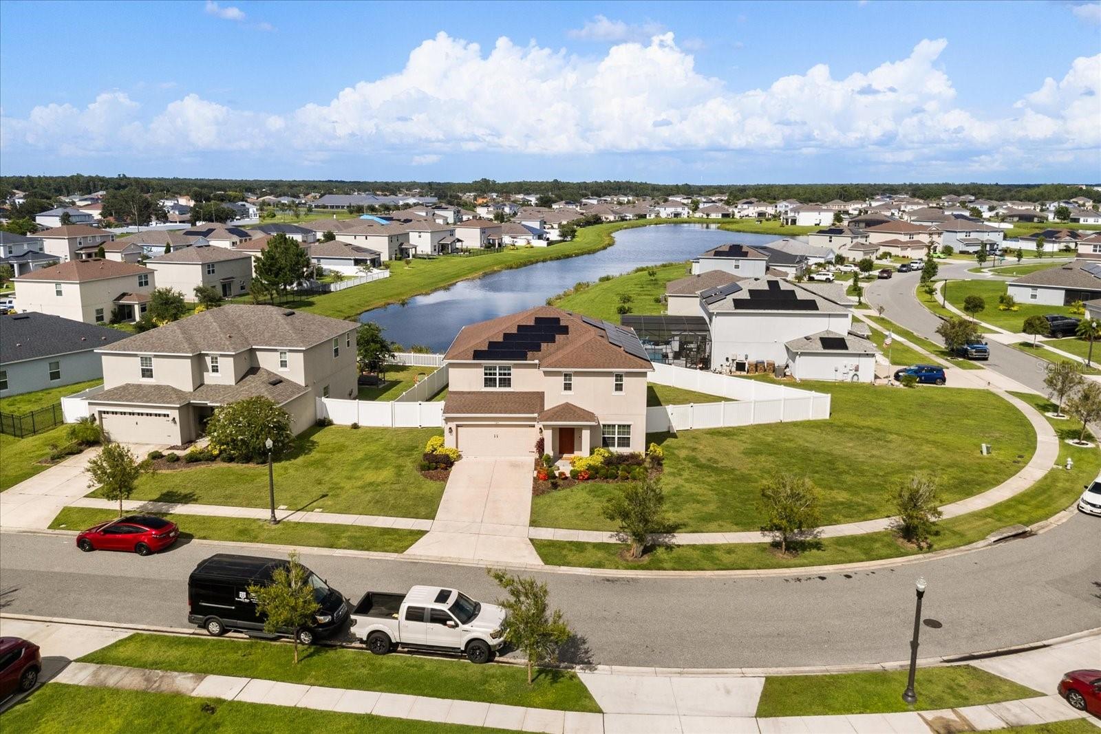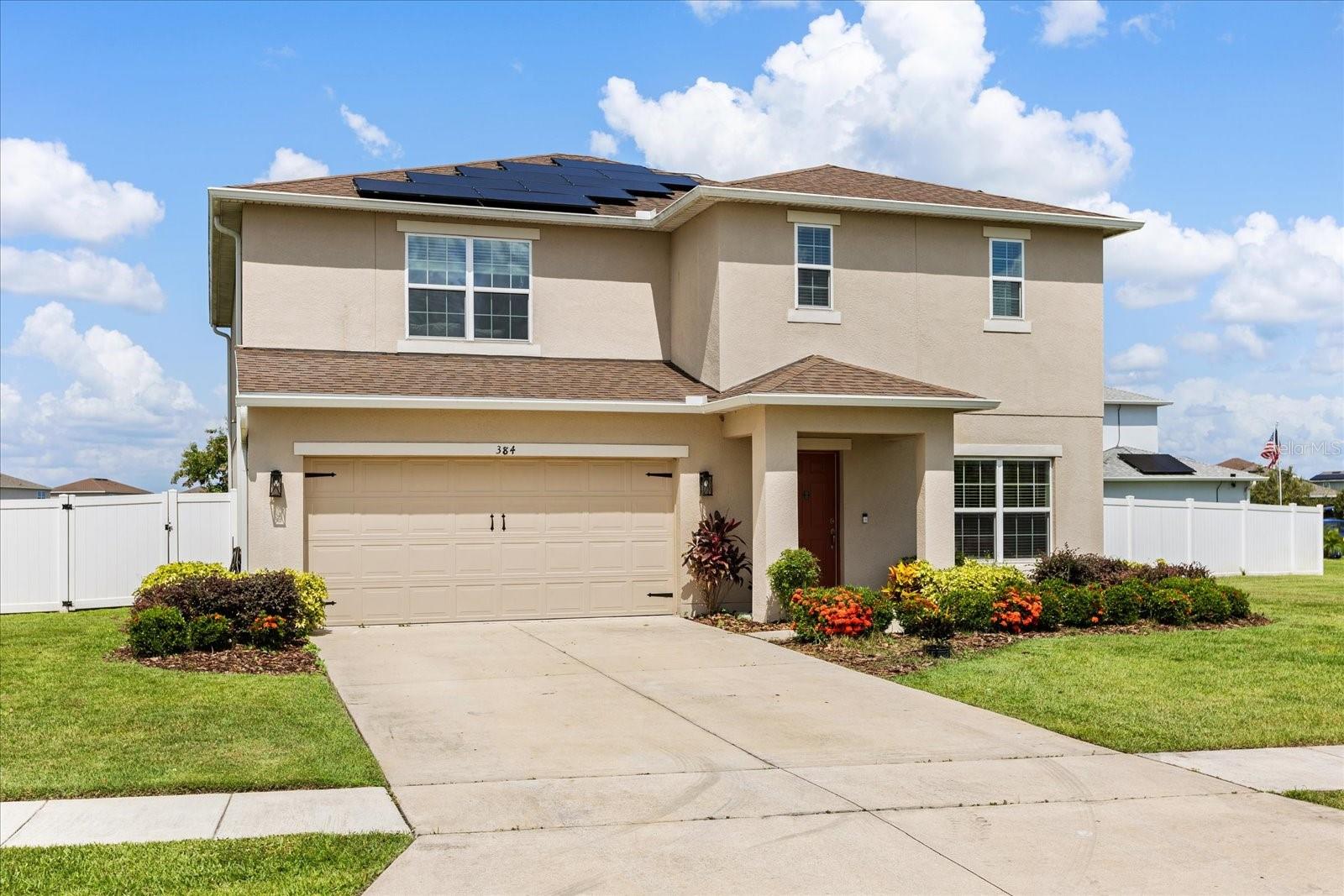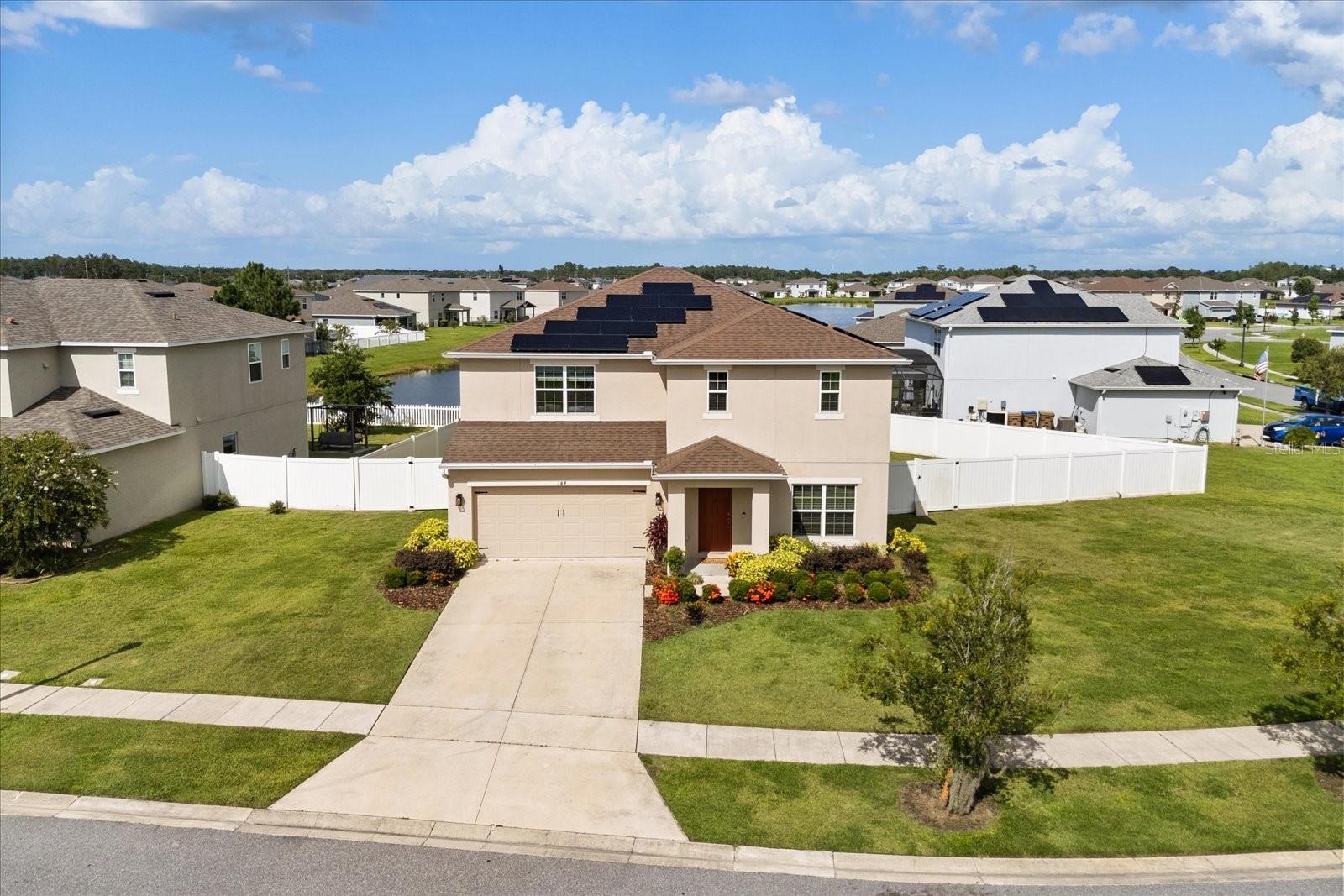 PAID OFF SOLAR PANELS, Discover the largest home on the largest lot in the sought-after Stepping Stone community. This expansive 6-bedroom, 5-bath home offers over 3,000 square feet of living space and was built in 2020 with quality and comfort in mind. Featuring new downstairs paint and updated laminate flooring, this home is move-in ready with a modern, open-concept layout. The main floor includes a welcoming foyer, spacious living and dining areas, and a beautifully appointed kitchen with a center island, stainless steel appliances, breakfast bar seating, and a walk-in pantry. Two bedrooms are located downstairs—one with a private en-suite bath, perfect for guests or multigenerational living. Upstairs, the spacious primary suite includes a walk-in closet and en-suite bathroom. Three additional bedrooms include a Jack-and-Jill bath and an extra full bathroom, along with a large loft and a dedicated laundry room. Enjoy relaxing water views from the fenced backyard, which features both a covered and open patio—ideal for entertaining or enjoying time outdoors. Energy-efficient solar panels which will save hundreds of dollars a month in electricity, a 10-year builder structural warranty, and space for 4+ cars in the driveway plus a 2-car garage offer comfort and peace of mind. Community amenities include a park, playground, and sidewalks throughout. Conveniently located near Disney, theme parks, shopping, dining, and golf, this home combines size, style, and location—all in one.