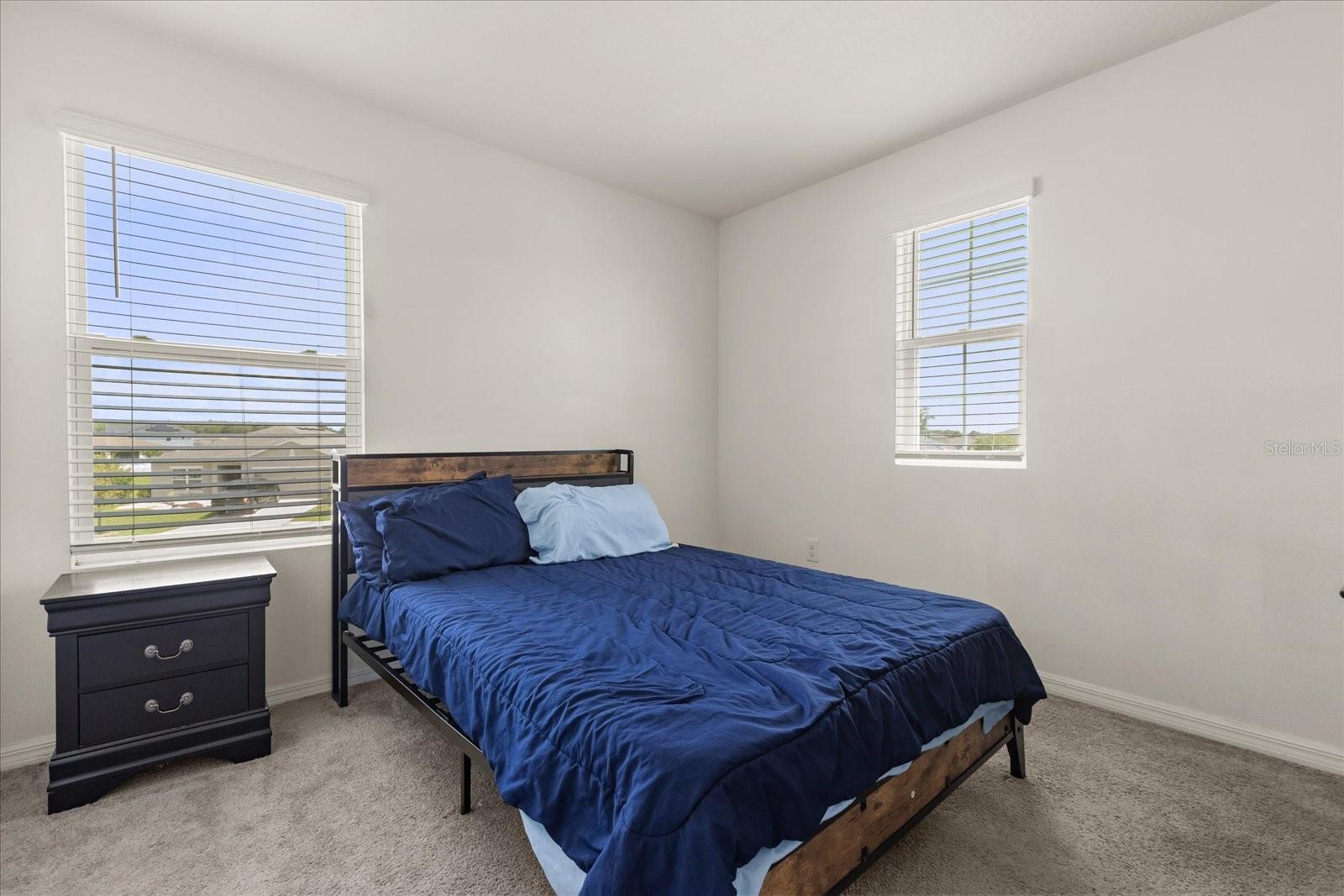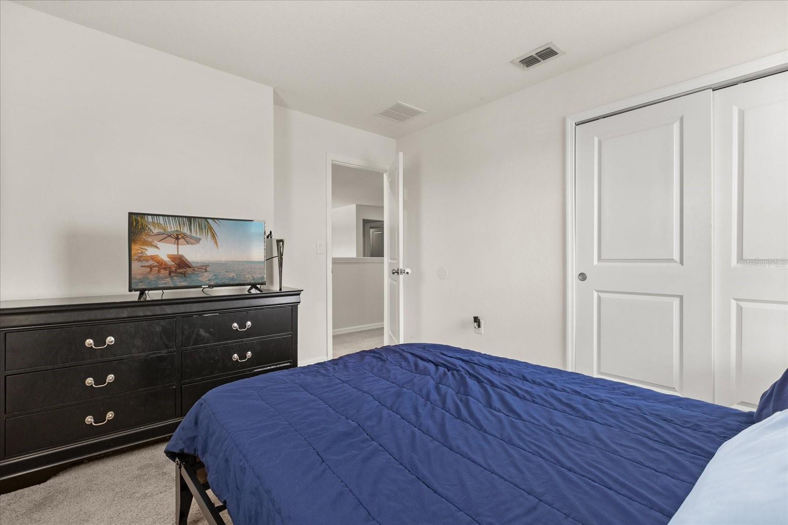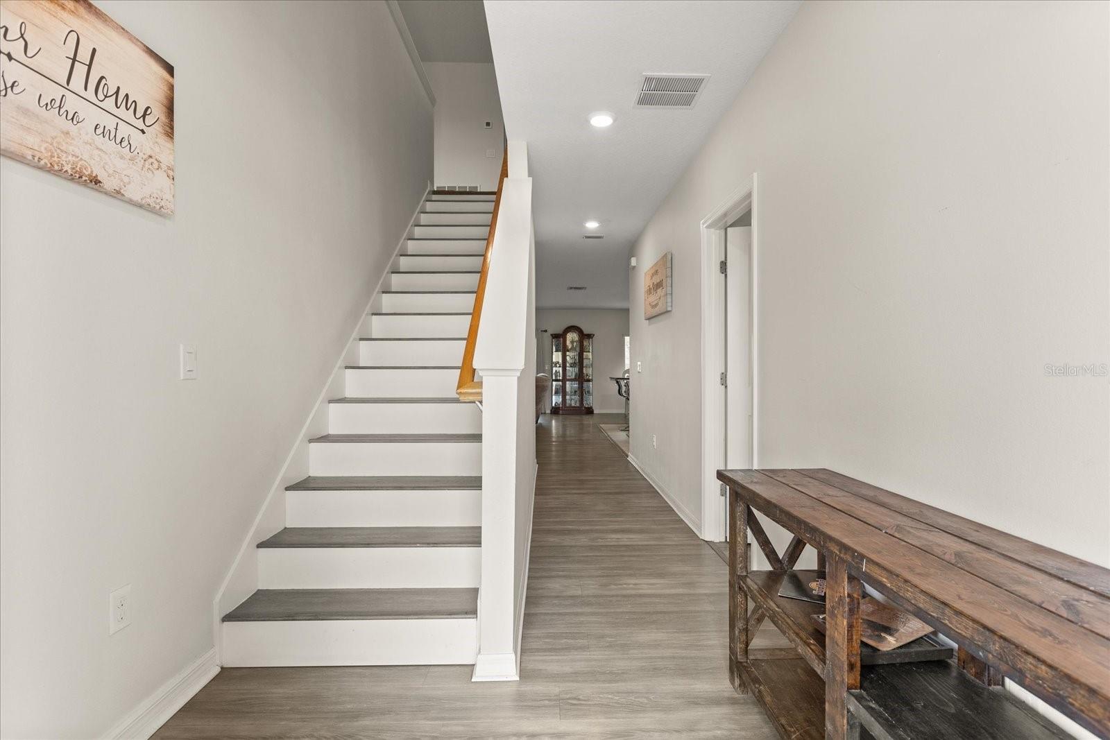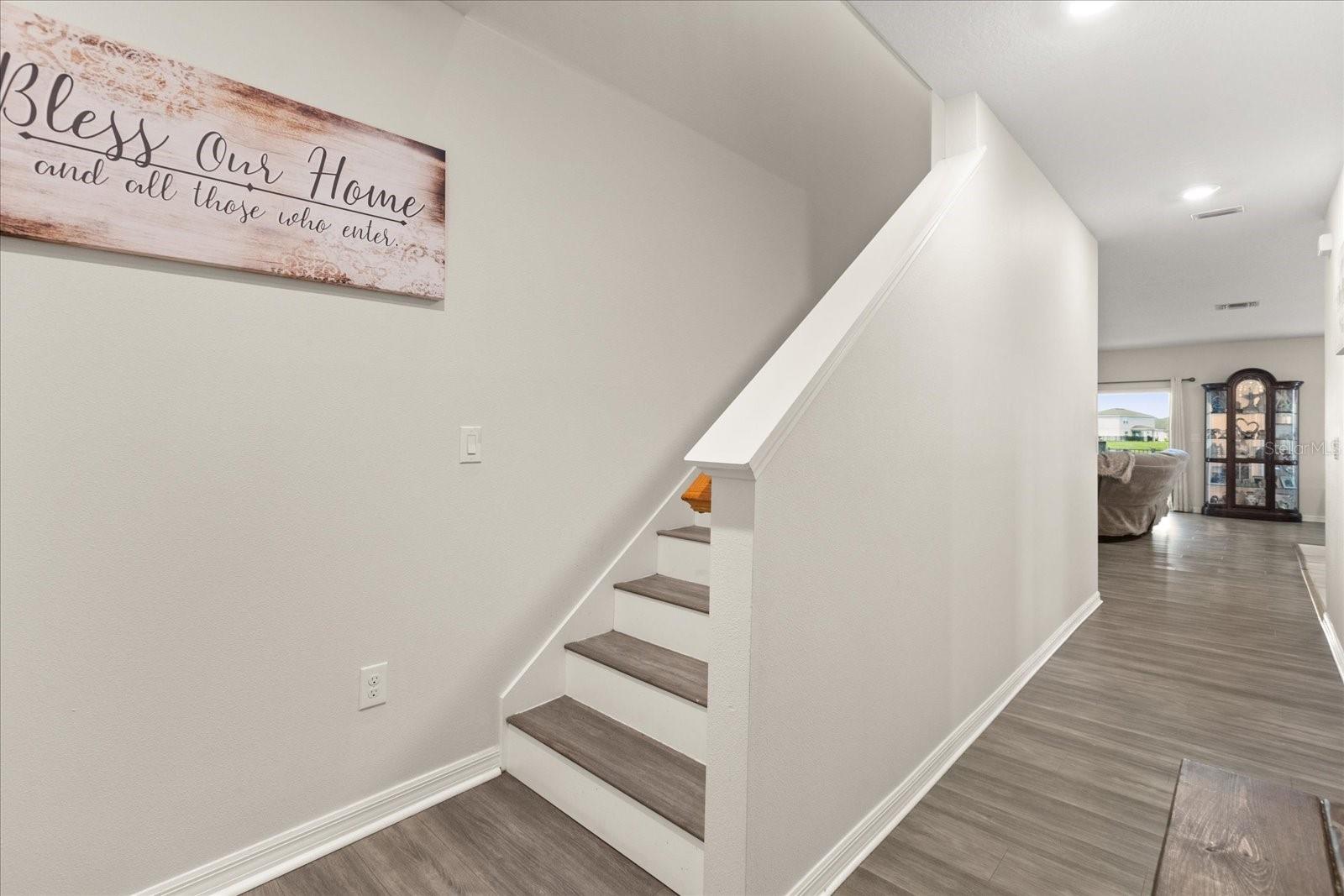 PAID OFF SOLAR PANELS, Discover the largest home on the largest lot in the sought-after Stepping Stone community. This expansive 6-bedroom, 5-bath home offers over 3,000 square feet of living space and was built in 2020 with quality and comfort in mind. Featuring new downstairs paint and updated laminate flooring, this home is move-in ready with a modern, open-concept layout. The main floor includes a welcoming foyer, spacious living and dining areas, and a beautifully appointed kitchen with a center island, stainless steel appliances, breakfast bar seating, and a walk-in pantry. Two bedrooms are located downstairs—one with a private en-suite bath, perfect for guests or multigenerational living. Upstairs, the spacious primary suite includes a walk-in closet and en-suite bathroom. Three additional bedrooms include a Jack-and-Jill bath and an extra full bathroom, along with a large loft and a dedicated laundry room. Enjoy relaxing water views from the fenced backyard, which features both a covered and open patio—ideal for entertaining or enjoying time outdoors. Energy-efficient solar panels which will save hundreds of dollars a month in electricity, a 10-year builder structural warranty, and space for 4+ cars in the driveway plus a 2-car garage offer comfort and peace of mind. Community amenities include a park, playground, and sidewalks throughout. Conveniently located near Disney, theme parks, shopping, dining, and golf, this home combines size, style, and location—all in one.