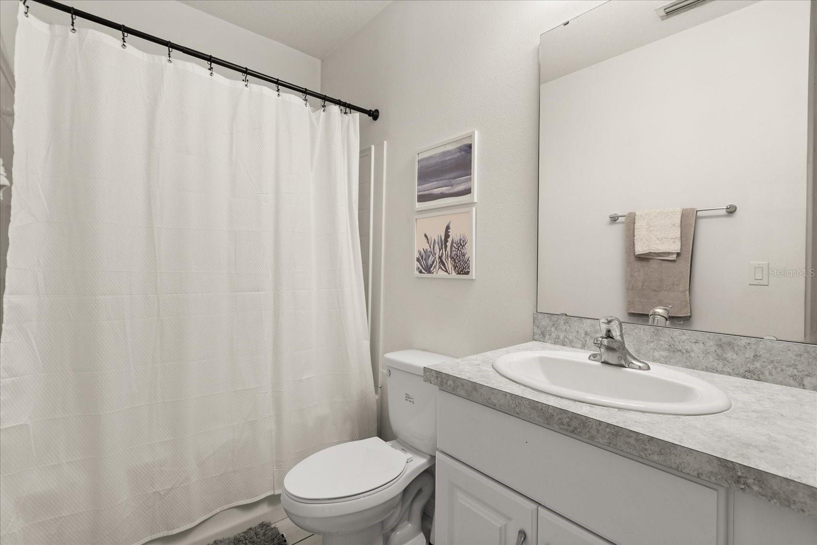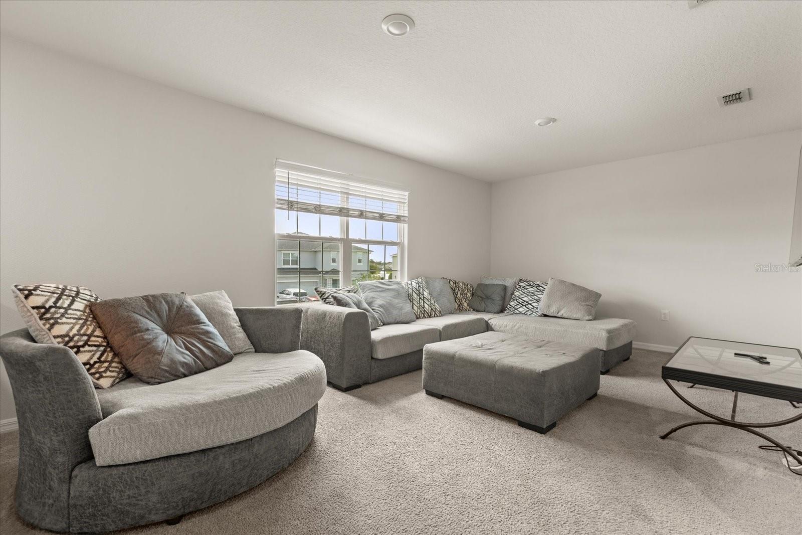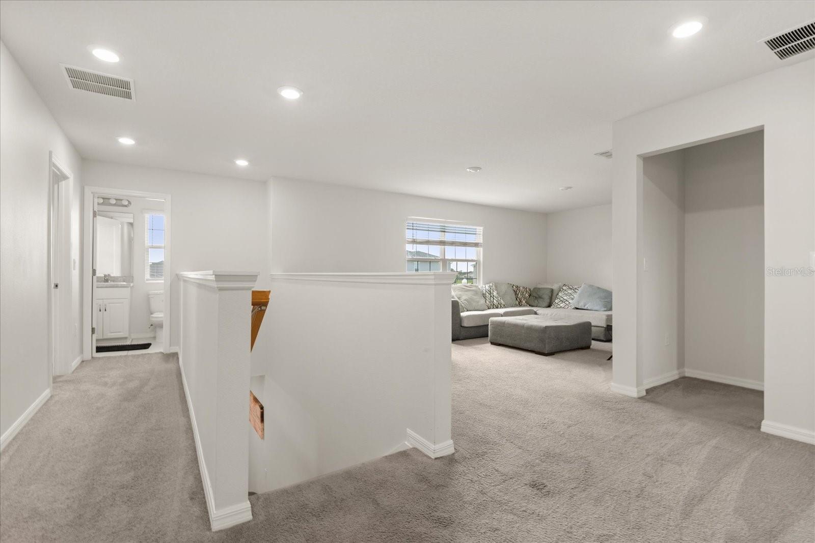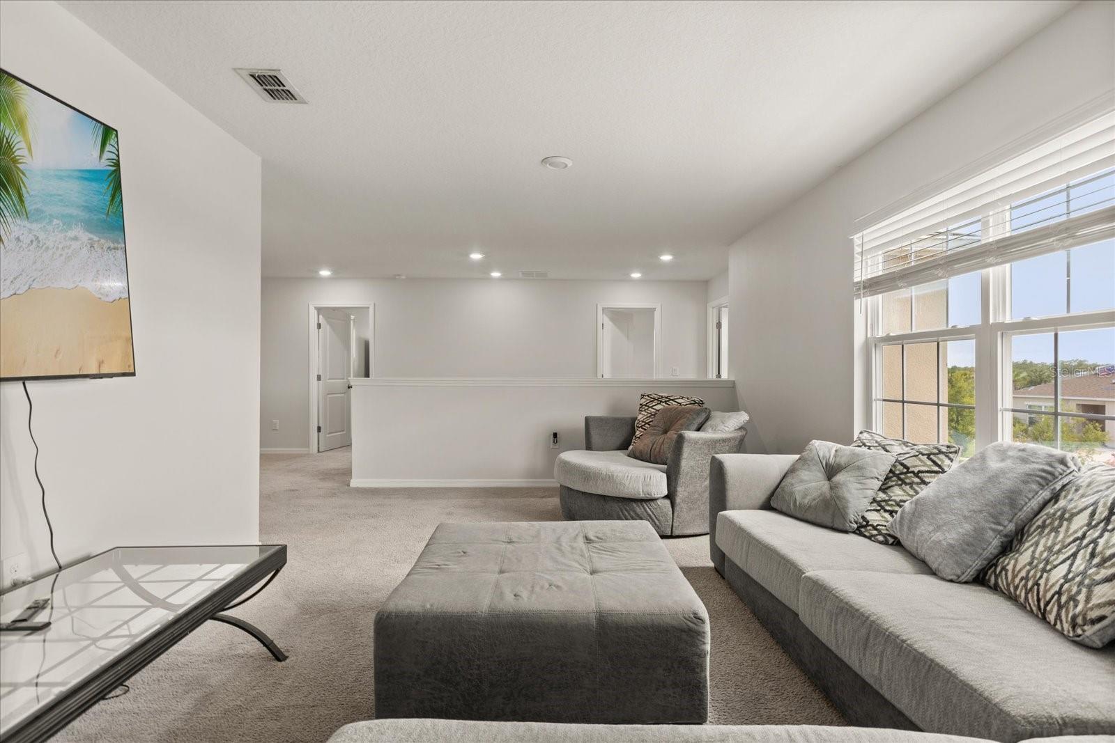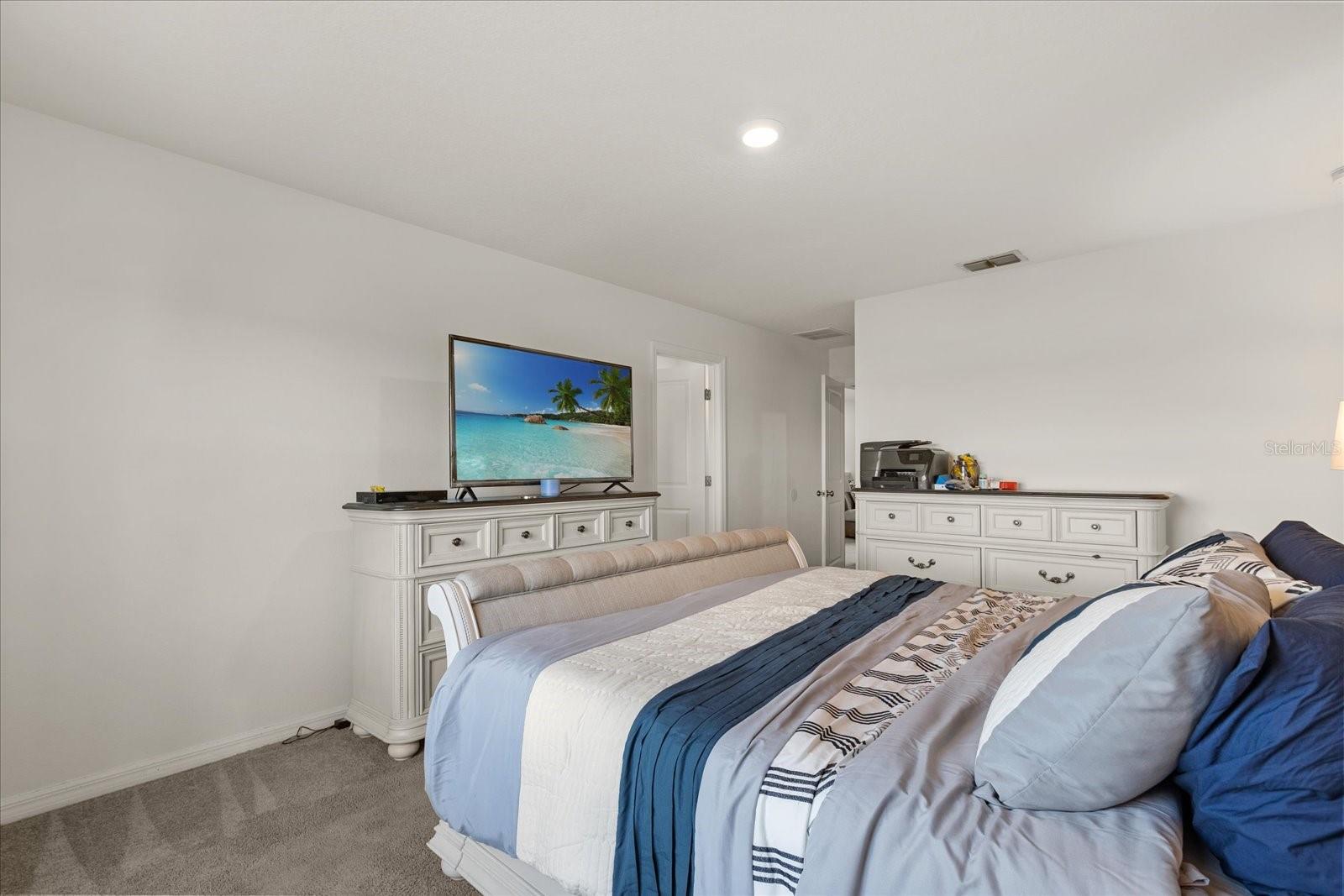 PAID OFF SOLAR PANELS, Discover the largest home on the largest lot in the sought-after Stepping Stone community. This expansive 6-bedroom, 5-bath home offers over 3,000 square feet of living space and was built in 2020 with quality and comfort in mind. Featuring new downstairs paint and updated laminate flooring, this home is move-in ready with a modern, open-concept layout. The main floor includes a welcoming foyer, spacious living and dining areas, and a beautifully appointed kitchen with a center island, stainless steel appliances, breakfast bar seating, and a walk-in pantry. Two bedrooms are located downstairs—one with a private en-suite bath, perfect for guests or multigenerational living. Upstairs, the spacious primary suite includes a walk-in closet and en-suite bathroom. Three additional bedrooms include a Jack-and-Jill bath and an extra full bathroom, along with a large loft and a dedicated laundry room. Enjoy relaxing water views from the fenced backyard, which features both a covered and open patio—ideal for entertaining or enjoying time outdoors. Energy-efficient solar panels which will save hundreds of dollars a month in electricity, a 10-year builder structural warranty, and space for 4+ cars in the driveway plus a 2-car garage offer comfort and peace of mind. Community amenities include a park, playground, and sidewalks throughout. Conveniently located near Disney, theme parks, shopping, dining, and golf, this home combines size, style, and location—all in one.
