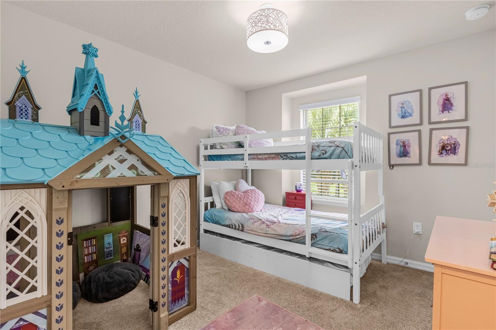 Fully Furnished Turnkey Vacation Rental! This 5-bedroom, 4.5-bathroom vacation retreat is built for both relaxation and revenue—comfortably accommodating up to 16 guests and ready for immediate enjoyment or income potential! Ideally located just minutes from major theme parks, this property blends modern luxury with fun-filled amenities. On the main floor, you'll find a private king bedroom and full bathroom—perfect for multi-generational stays. The open-concept heart of the home features a stylish kitchen with granite countertops, stainless steel appliances, and a large island, flowing seamlessly into a bright, airy living room with views of the private heated pool. Step outside to a covered lanai and convenient outdoor half bath—ideal for entertaining. Upstairs, a spacious loft adds bonus living space, alongside four additional bedrooms and three full bathrooms. Two themed rooms—Frozen and Star Wars—feature custom murals and LED lighting, offering a magical experience for younger guests. Recent upgrades include fresh interior paint, a Nest thermostat, digital door locks, new lighting, plush carpeting, and high-end washer/dryer units. The detached garage provides flexible space for parking, storage, or a future game room or theater conversion. The HOA covers cable, internet, trash, lawn care, and access to resort-style amenities including a clubhouse, arcade,