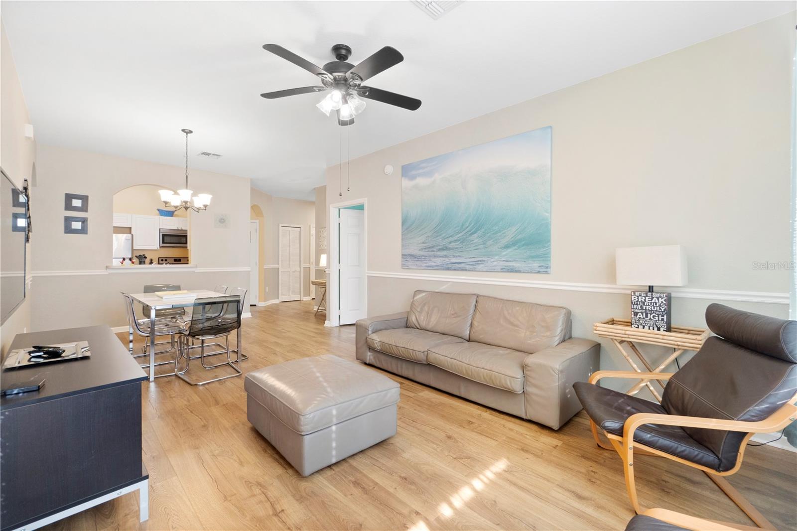 Don’t miss this rare first floor condo in the sought-after Windsor Palms Resort! Step inside and enjoy a bright, open layout featuring a combined living and dining area that flows seamlessly to a screened patio, perfect for relaxing after a day at the parks. The split bedroom design offers privacy and comfort. On one side, you’ll find a spacious primary suite with a walk-in closet and private bath. The opposite side includes a large second bedroom and a generous third bedroom, which share a full bath. All bedrooms and the main living areas feature new LVP flooring. This condo comes fully furnished and move-in ready, complete with stainless steel appliances, washer and dryer, and everything needed for a fantastic vacation rental or personal retreat. A newer AC unit provides peace of mind. Windsor Palms is a gated resort community with 24-hour security and a long list of amenities: a resort style pool, hot tub, splash pad, fitness center, clubhouse with arcade and movie theater, tennis, basketball, playground, Tiki bar, and more. Perfectly located just minutes from Disney, golf, restaurants, shopping, and entertainment, this condo is zoned for short-term, long-term, or full-time living. Opportunities for ground floor units like this are few and far between, schedule your showing today!