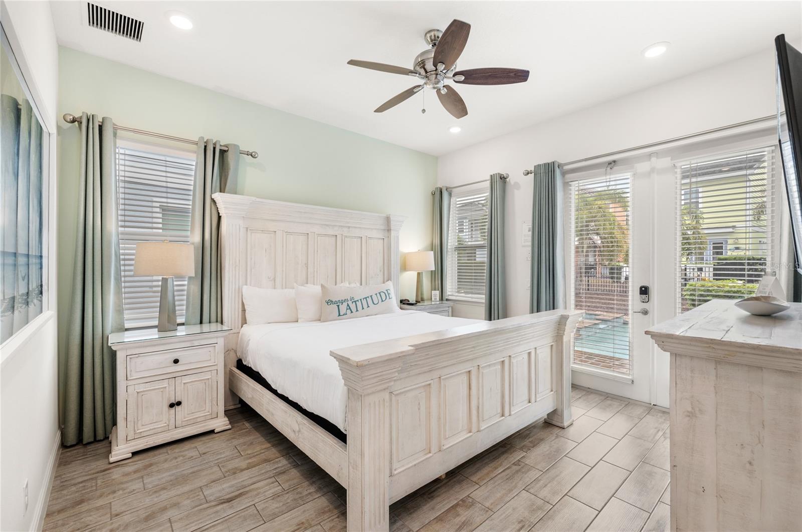 Experience the Margaritaville lifestyle! This charming 3-bedroom, 3-bath cottage with a full, transferable booking calendar is the perfect blend of fun and investment potential. Located in Margaritaville Resort Orlando, this home offers resort-style living just minutes from Disney, shopping, and dining. Inside, enjoy a bright, open floor plan with stylish “wood” tile floors, ceiling fans, and a chef-inspired kitchen featuring quartz countertops, stainless steel appliances, and an abundance of counter space perfect for morning coffee and evening cocktails. French doors lead to a private backyard oasis with a heated pool and spa, ideal for relaxing or entertaining. The first-floor primary suite includes a nicely appointed en-suite bath, while second-floor has an alternate primary suite with en-suite bath, a guest bedroom -plus a bonus "half" bedroom or small retreat area and another full bath (sleeps up to nine total). This cottage comes fully furnished with the Margaritaville-approved furniture package—including décor, kitchenware, linens, and TVs—all included in the list price. Enjoy access to resort amenities: multiple pools, fitness center, water park, and Sunset Walk with 20+ restaurants, bars, shops. Live every day like you’re on vacation!