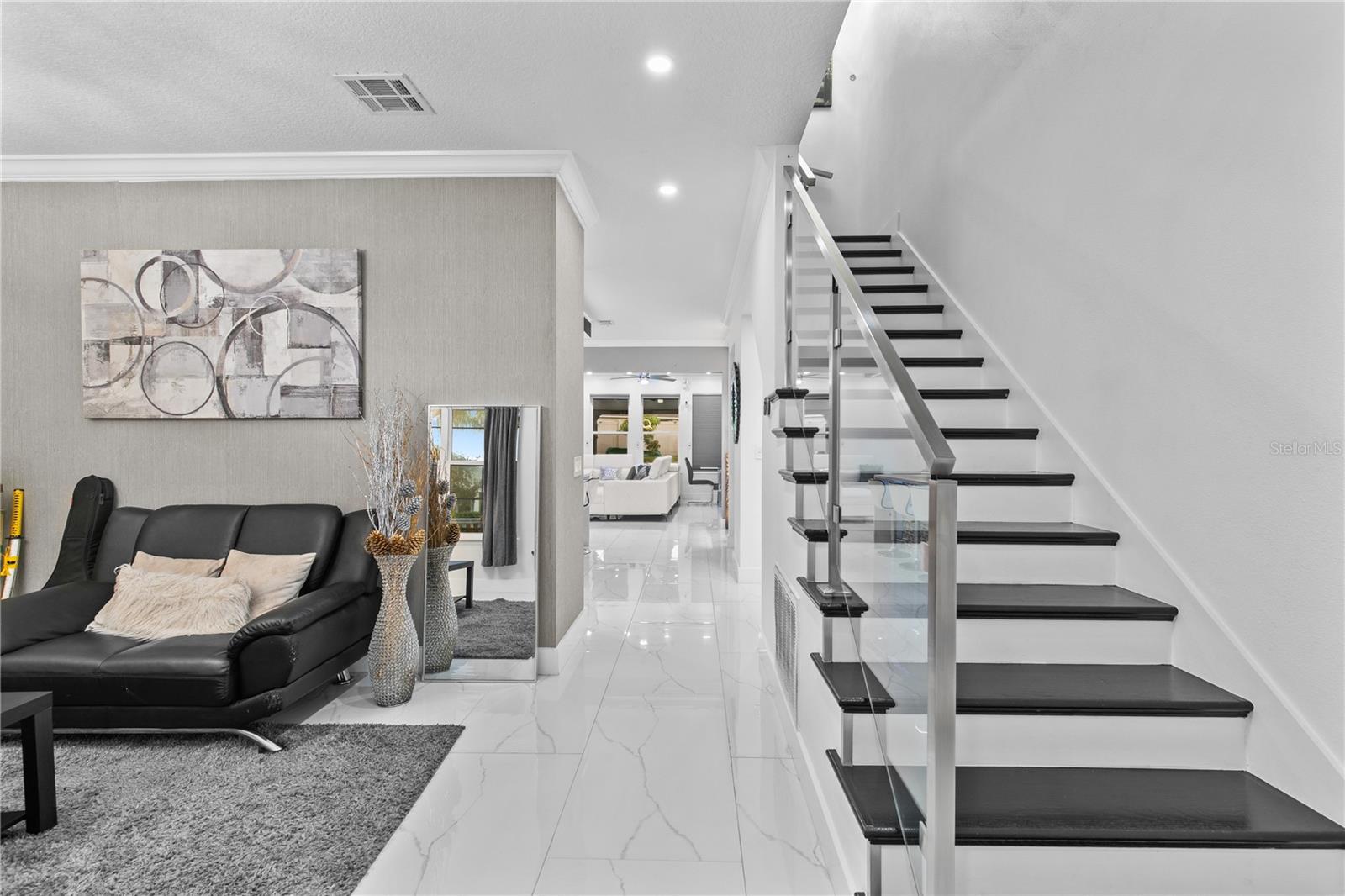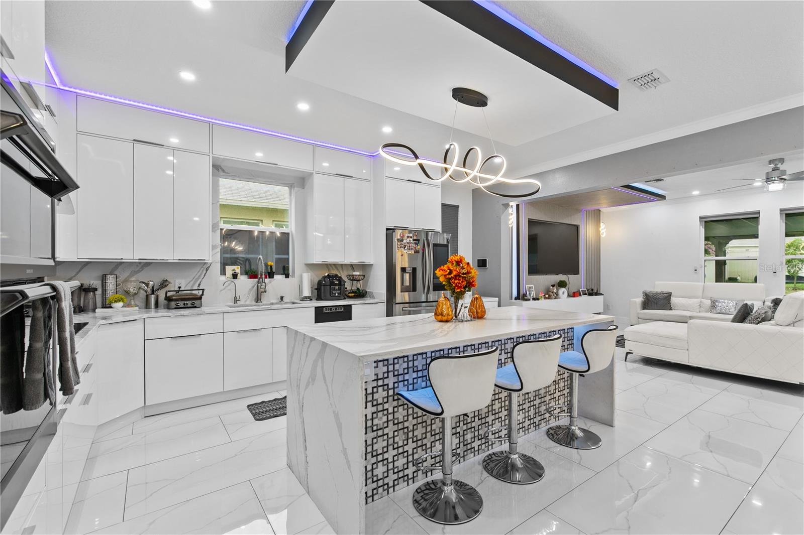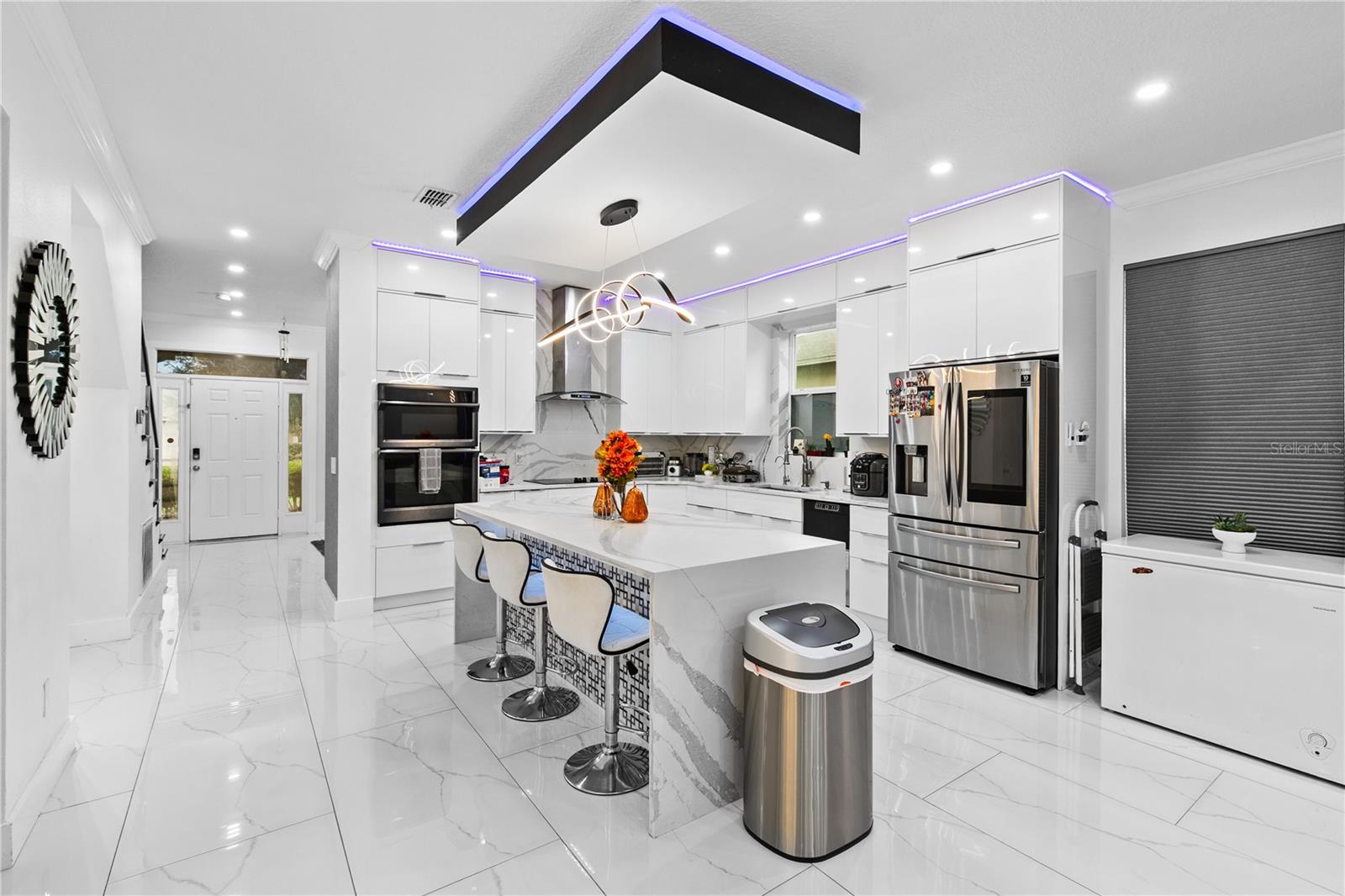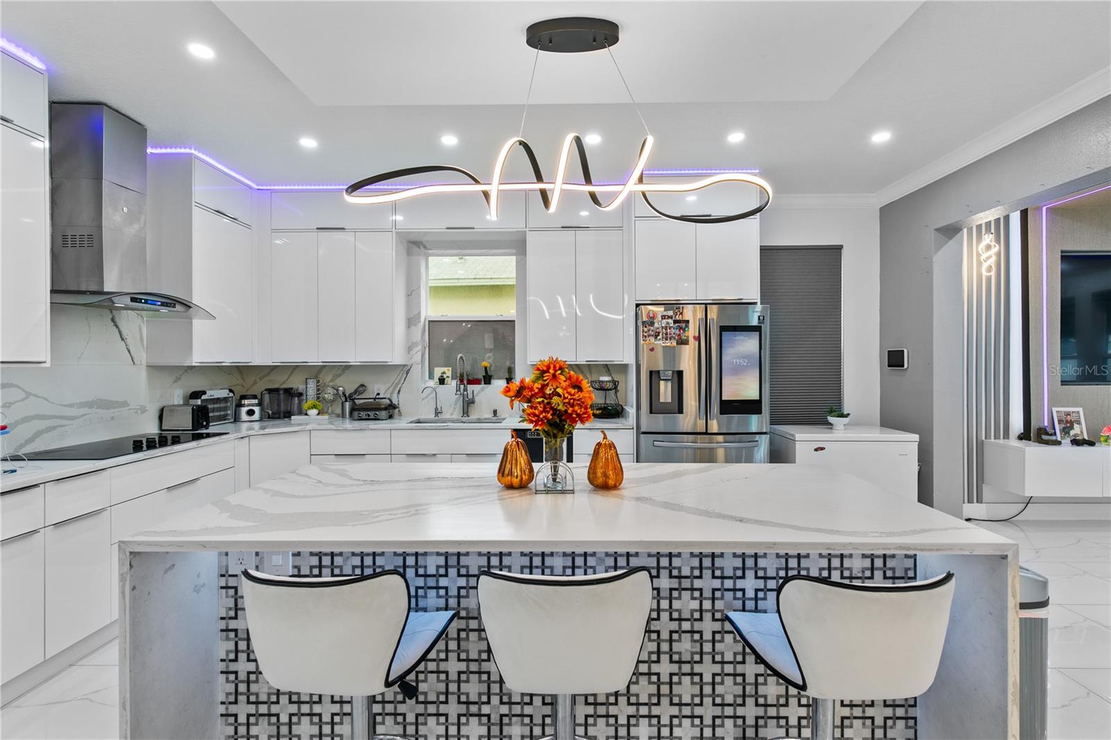 Welcome to this stunning move-in-ready home where thoughtful design, premium upgrades, and energy efficiency come together in perfect harmony. This beautifully maintained home offers the perfect balance of luxury, comfort, and convenience. From first glance, curb appeal impresses with a stone-accented front elevation, well-maintained landscaping, and a striking red brick walkway leading to a covered front porch. Step inside to a bright, airy foyer featuring polished porcelain tile, clean architectural lines, and a sleek glass-panel staircase setting the stage for the refined interior that follows. The open-concept main level is both stylish and highly functional. The family room is anchored by a custom entertainment wall with textured paneling, LED accent lighting, and a floating media console, an ideal setting for relaxed nights or elegant entertaining. Crown molding, recessed lighting, and a soft neutral palette enhance the elegant atmosphere, while wide visibility flow effortlessly into the dining area and kitchen. The kitchen is a true showpiece; a modern, sleek, and designed for both culinary performance and visual impact. High-gloss white cabinetry offers ample storage, white stunning quartz countertops with bold veining wrap around a dramatic waterfall island that doubles as a prep space and social hub. The waterfall island is anchored by a distinctive tile inlay, elevating the kitchen’s designer aesthetic., complemented by a sculptural LED pendant light overhead and ambient LED ceiling lighting throughout. Outfitted with premium stainless-steel appliances, the kitchen includes a Samsung French door smart refrigerator with digital display, double wall ovens, a smooth cooktop with a stylish range hood, and an integrated dishwasher. A continuous marble-look quartz backsplash ties the space together. Adjacent to the kitchen, the dining area is bathed in sunlight from sliding glass doors that lead directly to the backyard. Tucked beneath the staircase is a custom-designed bar nook complete with a stacked stone backsplash, glass shelving, recessed lighting, and a built-in beverage cooler, ideal for relaxing evenings or hosting guests. Nearby, a built-in display wall with individually lit niches offers a refined way to showcase art, collectibles, or personal décor. Upstairs, a spacious loft serves as a second living room or media lounge, featuring a textured accent wall, floating console, and contemporary lighting. Glass-panel railings maintain the home’s open feel while adding a modern edge. The primary suite is located on the first floor, offering privacy and comfort. The ensuite bathroom includes a built-in closet system for efficient storage, along with updated fixtures and finishes for a clean, spa-like feel. Each bedroom features porcelain tile flooring, modern ceiling fans, and ample natural light. Bathrooms are tastefully updated, with three full baths and a convenient half-bath. Step outside to your private backyard retreat. A large, covered patio with wood-beam construction offers shaded comfort, while an expansive paver patio provides plenty of space for outdoor dining, lounging, or entertaining. A curved paver walkway leads past dual HVAC units and the solar energy system. Nestled just minutes from The Loop—a vibrant open-air shopping and entertainment destination, movie theaters, 20 minutes from Orlando’s world-famous theme parks and the Orlando International Airport. Schedule your private showing today!