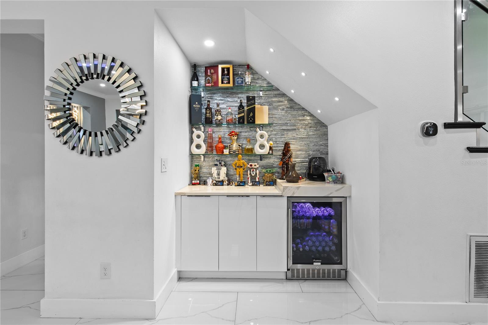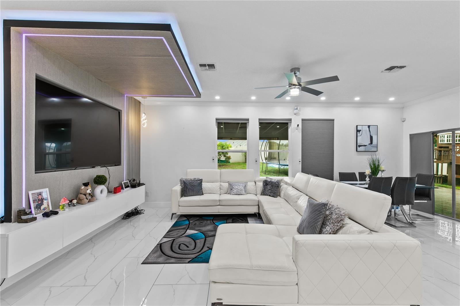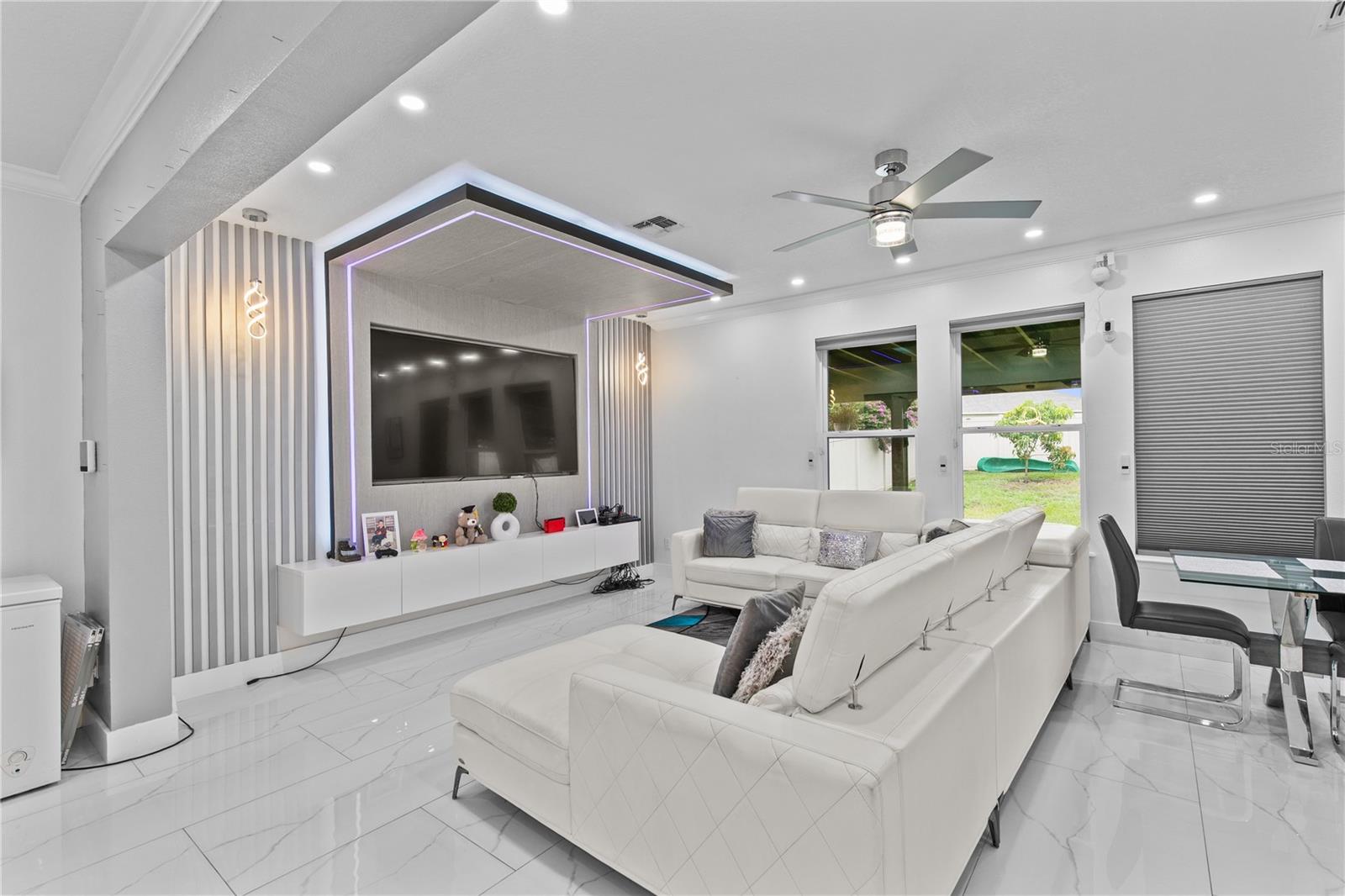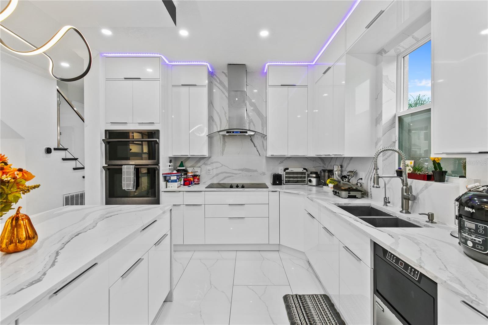 Welcome to this stunning move-in-ready home where thoughtful design, premium upgrades, and energy efficiency come together in perfect harmony. This beautifully maintained home offers the perfect balance of luxury, comfort, and convenience. From first glance, curb appeal impresses with a stone-accented front elevation, well-maintained landscaping, and a striking red brick walkway leading to a covered front porch. Step inside to a bright, airy foyer featuring polished porcelain tile, clean architectural lines, and a sleek glass-panel staircase setting the stage for the refined interior that follows. The open-concept main level is both stylish and highly functional. The family room is anchored by a custom entertainment wall with textured paneling, LED accent lighting, and a floating media console, an ideal setting for relaxed nights or elegant entertaining. Crown molding, recessed lighting, and a soft neutral palette enhance the elegant atmosphere, while wide visibility flow effortlessly into the dining area and kitchen. The kitchen is a true showpiece; a modern, sleek, and designed for both culinary performance and visual impact. High-gloss white cabinetry offers ample storage, white stunning quartz countertops with bold veining wrap around a dramatic waterfall island that doubles as a prep space and social hub. The waterfall island is anchored by a distinctive tile inlay, elevating the kitchen’s designer aesthetic., complemented by a sculptural LED pendant light overhead and ambient LED ceiling lighting throughout. Outfitted with premium stainless-steel appliances, the kitchen includes a Samsung French door smart refrigerator with digital display, double wall ovens, a smooth cooktop with a stylish range hood, and an integrated dishwasher. A continuous marble-look quartz backsplash ties the space together. Adjacent to the kitchen, the dining area is bathed in sunlight from sliding glass doors that lead directly to the backyard. Tucked beneath the staircase is a custom-designed bar nook complete with a stacked stone backsplash, glass shelving, recessed lighting, and a built-in beverage cooler, ideal for relaxing evenings or hosting guests. Nearby, a built-in display wall with individually lit niches offers a refined way to showcase art, collectibles, or personal décor. Upstairs, a spacious loft serves as a second living room or media lounge, featuring a textured accent wall, floating console, and contemporary lighting. Glass-panel railings maintain the home’s open feel while adding a modern edge. The primary suite is located on the first floor, offering privacy and comfort. The ensuite bathroom includes a built-in closet system for efficient storage, along with updated fixtures and finishes for a clean, spa-like feel. Each bedroom features porcelain tile flooring, modern ceiling fans, and ample natural light. Bathrooms are tastefully updated, with three full baths and a convenient half-bath. Step outside to your private backyard retreat. A large, covered patio with wood-beam construction offers shaded comfort, while an expansive paver patio provides plenty of space for outdoor dining, lounging, or entertaining. A curved paver walkway leads past dual HVAC units and the solar energy system. Nestled just minutes from The Loop—a vibrant open-air shopping and entertainment destination, movie theaters, 20 minutes from Orlando’s world-famous theme parks and the Orlando International Airport. Schedule your private showing today!