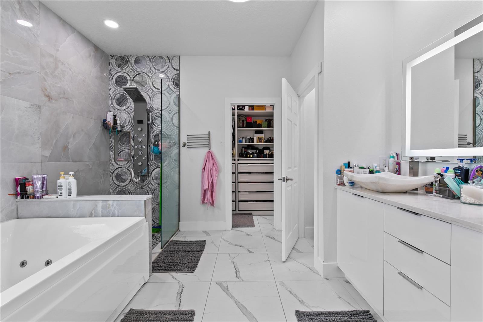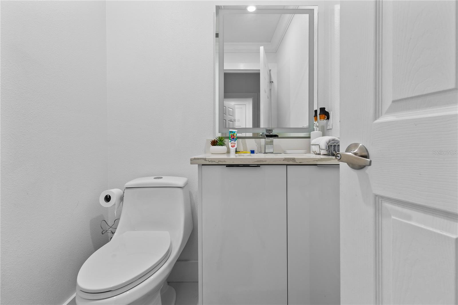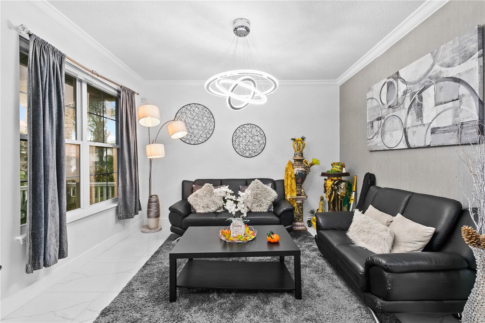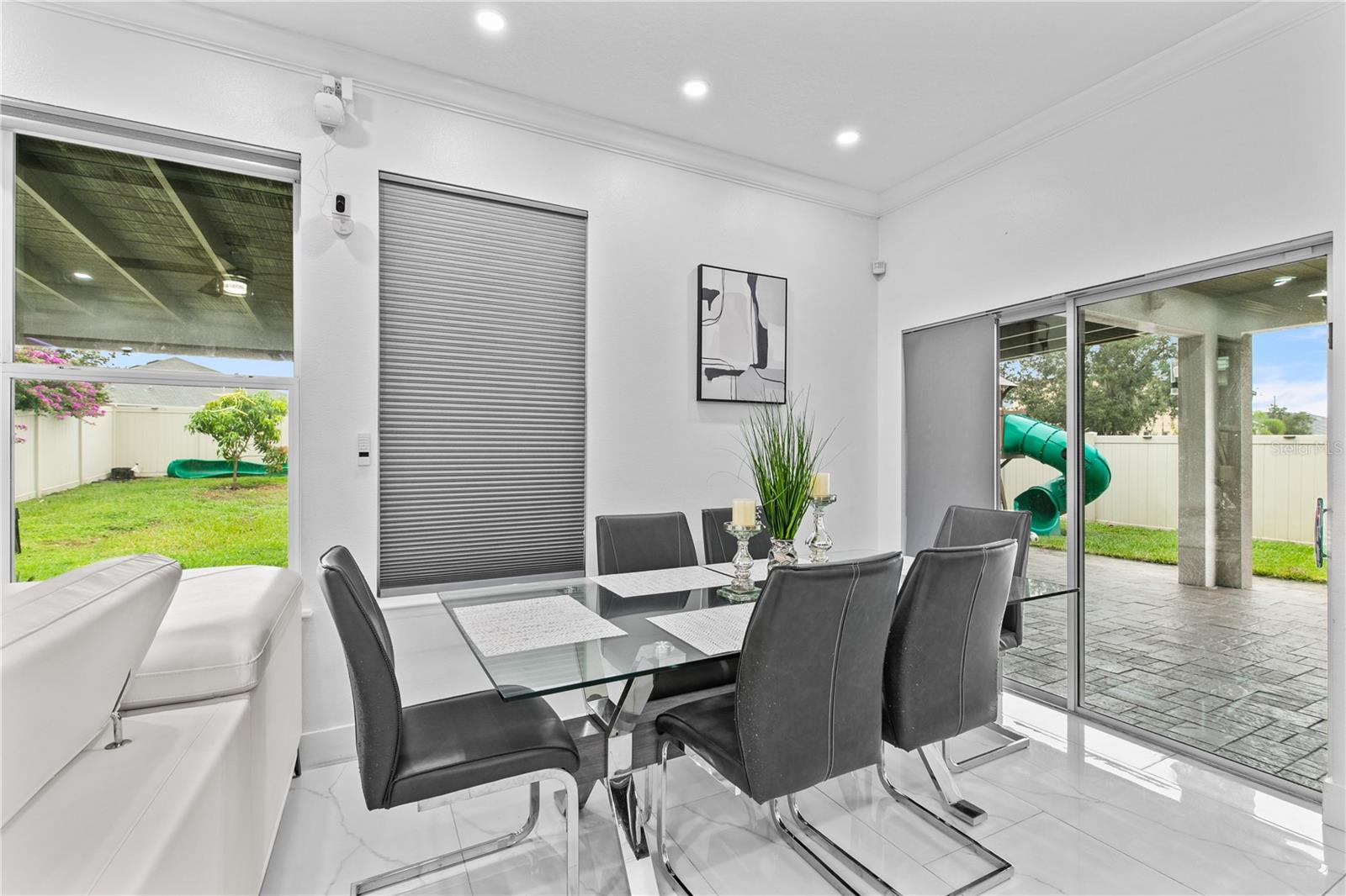 Welcome to this stunning move-in-ready home where thoughtful design, premium upgrades, and energy efficiency come together in perfect harmony. This beautifully maintained home offers the perfect balance of luxury, comfort, and convenience. From first glance, curb appeal impresses with a stone-accented front elevation, well-maintained landscaping, and a striking red brick walkway leading to a covered front porch. Step inside to a bright, airy foyer featuring polished porcelain tile, clean architectural lines, and a sleek glass-panel staircase setting the stage for the refined interior that follows. The open-concept main level is both stylish and highly functional. The family room is anchored by a custom entertainment wall with textured paneling, LED accent lighting, and a floating media console, an ideal setting for relaxed nights or elegant entertaining. Crown molding, recessed lighting, and a soft neutral palette enhance the elegant atmosphere, while wide visibility flow effortlessly into the dining area and kitchen. The kitchen is a true showpiece; a modern, sleek, and designed for both culinary performance and visual impact. High-gloss white cabinetry offers ample storage, white stunning quartz countertops with bold veining wrap around a dramatic waterfall island that doubles as a prep space and social hub. The waterfall island is anchored by a distinctive tile inlay, elevating the kitchen’s designer aesthetic., complemented by a sculptural LED pendant light overhead and ambient LED ceiling lighting throughout. Outfitted with premium stainless-steel appliances, the kitchen includes a Samsung French door smart refrigerator with digital display, double wall ovens, a smooth cooktop with a stylish range hood, and an integrated dishwasher. A continuous marble-look quartz backsplash ties the space together. Adjacent to the kitchen, the dining area is bathed in sunlight from sliding glass doors that lead directly to the backyard. Tucked beneath the staircase is a custom-designed bar nook complete with a stacked stone backsplash, glass shelving, recessed lighting, and a built-in beverage cooler, ideal for relaxing evenings or hosting guests. Nearby, a built-in display wall with individually lit niches offers a refined way to showcase art, collectibles, or personal décor. Upstairs, a spacious loft serves as a second living room or media lounge, featuring a textured accent wall, floating console, and contemporary lighting. Glass-panel railings maintain the home’s open feel while adding a modern edge. The primary suite is located on the first floor, offering privacy and comfort. The ensuite bathroom includes a built-in closet system for efficient storage, along with updated fixtures and finishes for a clean, spa-like feel. Each bedroom features porcelain tile flooring, modern ceiling fans, and ample natural light. Bathrooms are tastefully updated, with three full baths and a convenient half-bath. Step outside to your private backyard retreat. A large, covered patio with wood-beam construction offers shaded comfort, while an expansive paver patio provides plenty of space for outdoor dining, lounging, or entertaining. A curved paver walkway leads past dual HVAC units and the solar energy system. Nestled just minutes from The Loop—a vibrant open-air shopping and entertainment destination, movie theaters, 20 minutes from Orlando’s world-famous theme parks and the Orlando International Airport. Schedule your private showing today!