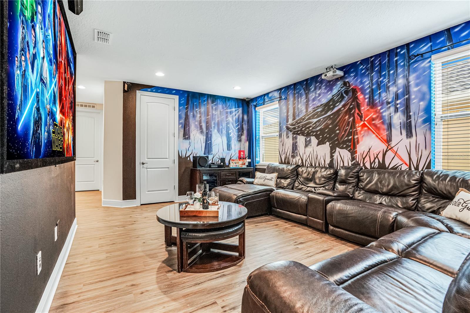 Discover this DISNEY DELIGHT VACATION VILLA where every stay feels like a CELEBRATION! This spectacular 10-BEDROOM, 10-BATHROOM property located in highly sought after ENCORE AT REUNION RESORT, minutes from Orlando's world-famous theme parks, delivers the seamless blend of MAGICAL VACATION MEMORIES and UNPARALLELED INVESTMENT OPPORTUNITY. A rare chance to acquire a high-quality asset at an exceptional price with potential for $128K in annual rental income. With IMMERSIVE MURALS, PROFESSIONALLY DESIGNED THEMED ROOMS, desirable BRIGHT COASTAL INTERIORS, and luxurious AMENITIES, this dream VACATION HOME is an upscale resort-style retreat positioned to capitalize on anticipated tourism from newly opened EPIC UNIVERSE and DISNEY PARKS significant expansions. FRESHLY PAINTED INTERIORS AND EXTERIORS (Oct2025) create a bright, refreshed atmosphere complemented by NEW FURNISHINGS, NEWLY EPOXIED GARAGE FLOOR, & FRESHLY CLEANED TILE. With its FULLY FURNISHED, TURN-KEY DESIGN, this home is ready for immediate enjoyment or effortless short-term rental success. Designed to host large gatherings, the floor plan is impressive & functional. THREE PRIMARY SUITES; two located downstairs & one upstairs, offer luxurious retreats while ENSUITE SPA-LIKE baths provide ultimate privacy. Many with dual sinks, garden tubs, & natural light. The OPEN-CONCEPT great room & dining area flow into the kitchen with GRANITE COUNTERS, 42-inch shaker style cabinetry, coffee bar, DUAL STAINLESS-STEEL REFRIGERATORS and DISHWASHERS, and Breakfast Bar. Dual Laundry Rooms upstairs & down offer further convenience. Upstairs, the experience grows even more enchanting. IMMERSIVE THEMED ROOMS bring childhood dreams to life; HARRY POTTER'S CHAMBER OF SECRETS, ELSA'S ENCHANTED LOFT, and the SUPERHERO SANCTUARY are professionally designed with 360-degree murals and custom loftstyle beds. The STAR WARS SCREENING ROOM offers a cinematic escape with projector, surround sound, and reclining leather sectional. A nearby ENTERTAINMENT LOFT with foosball and TV adds extra fun. Floor to ceiling sliding doors open to your PRIVATE OUTDOOR OASIS featuring large covered lanai, spacious paver patio and lawn, HEATED POOL AND SPA surrounded by tropical landscaping, fenced yard, NO REAR NEIGHBORS, and SERENE POND VIEWS. Whether sipping morning coffee by the pool or enjoying a sunset swim, every moment feels like a resort escape. Located a short walk from Encore's exclusive amenities, you'll enjoy access to a 10-acre waterpark with exhilarating slides, splash pad, poolside cabanas, fitness center, courts for tennis, volleyball, and basketball, a full soccer field, casual on-site dining & bar, concierge desk, and complimentary transportation to Disney, Universal & SeaWorld. The HOA covers internet, cable, landscaping, irrigation, pest control, community maintenance, and 24-hour manned security-simplifying ownership while maximizing returns. This home is COMPLETELY TURN-KEY, ready to start generating income from day one. With high occupancy potential, strong nightly rate projections, and prime location this home offers exceptional earning capacity for investors. Whether you're looking to generate income or create a personal retreat that pays for itself, this property provides the best of both worlds. Don't miss your chance to own a proven income-generating property in the heart of Orlando's thriving vacation rental market. Schedule your private showing today and start enjoying returns the day you close!
