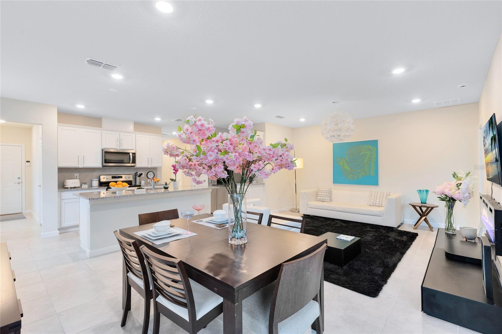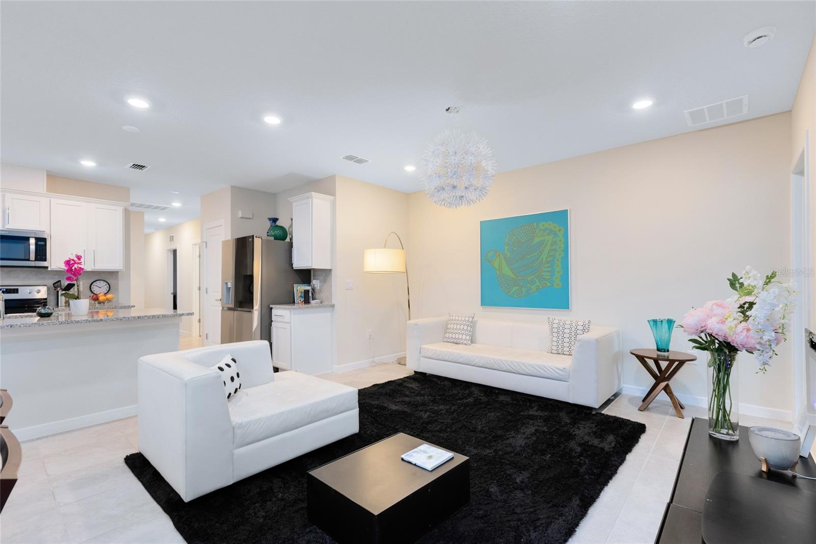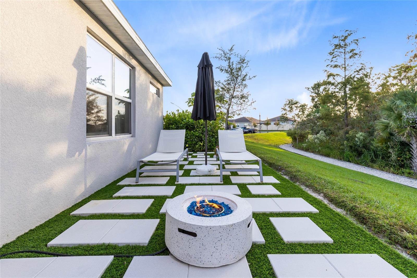 Welcome Home To Your Happy Place. This beautifully maintained 4-bedroom, 2-bath Pulte Homes Daniel model in Cypress Hammock, offering a bright open layout and a peaceful conservation backdrop with no rear neighbors. Spend days and nights in the sanctuary feel of the backyard, light the firepit and enjoy the calm, relaxing feel of nature. The main living area is filled with natural light and features large sliders that frame the private outdoor setting. The modern kitchen boasts upgrades galore, opens to the connected dining area and family room while including stone countertops, white cabinetry, a center island with seating, stainless steel appliances, a walk-in pantry, and tile flooring that continues throughout the main spaces. The family room is warm and inviting with views of the backyard and easy access to the covered lanai. The primary suite is tucked away for privacy and features a spacious bedroom, a large walk-in closet, and an en suite bathroom with a double vanity, stone counters, and a walk-in shower. Three additional bedrooms share a full bathroom on the opposite side of the home, creating a comfortable split layout. Outside, the covered lanai and upgraded patio area provide a relaxing extension of your living space with room to entertain while enjoying the natural conservation view. A community walking trail runs just behind the home, offering a peaceful path around the conservation area right outside your backyard. Built in 2023, this home offers energy-efficient features, solar panels, and modern finishes throughout. Cypress Hammock residents enjoy a resort-style pool, splash pad, clubhouse, playground, walking trails, and more—all with a low HOA and no CDD. Conveniently located off Poinciana Blvd with quick access to theme parks, shopping, dining, and major roadways.