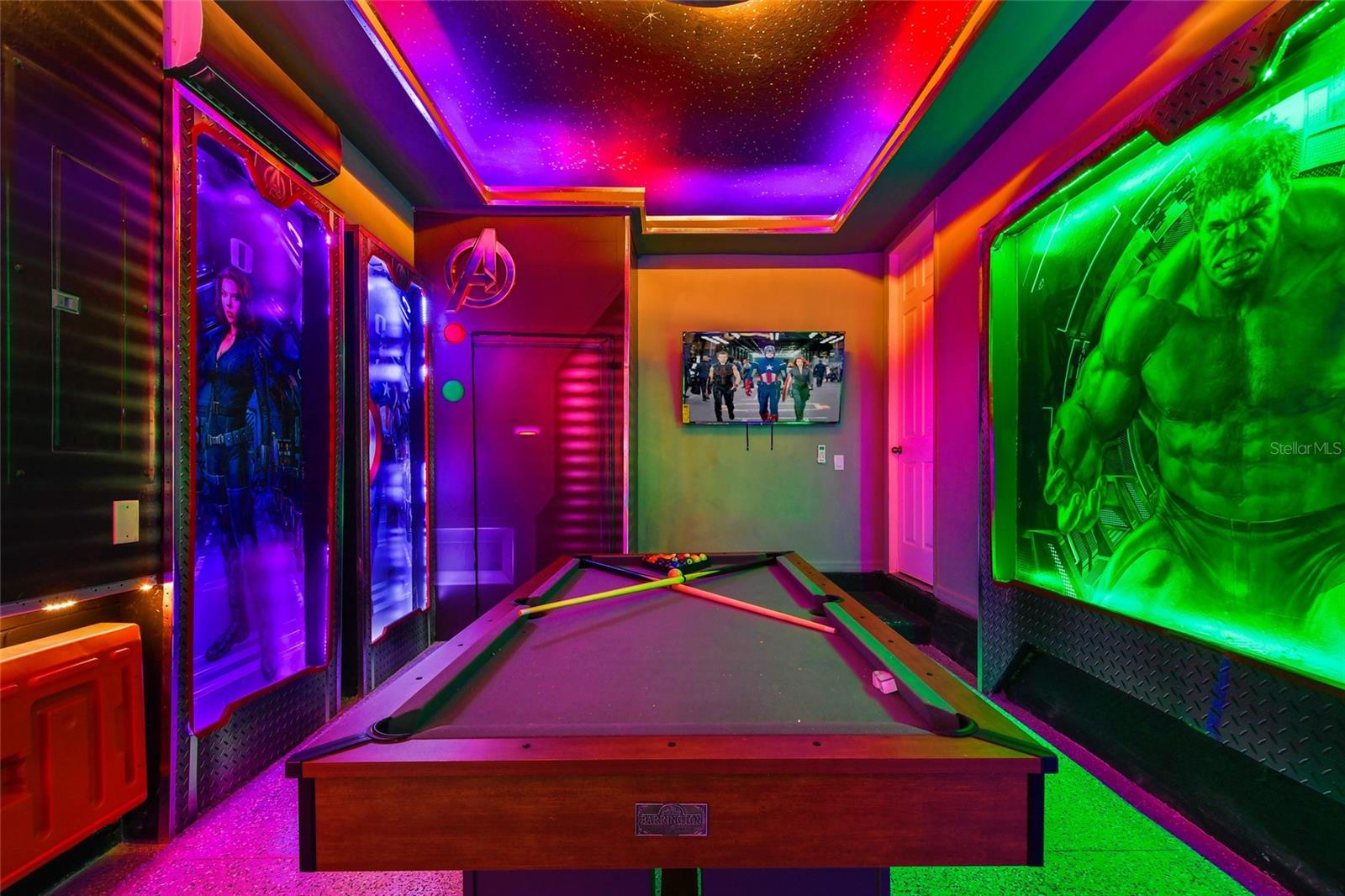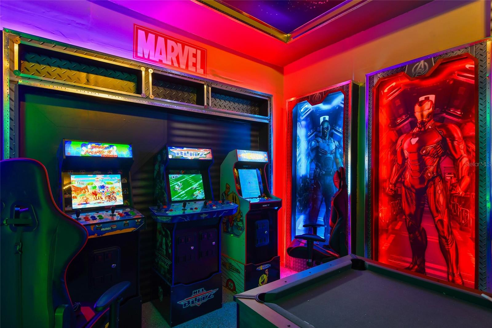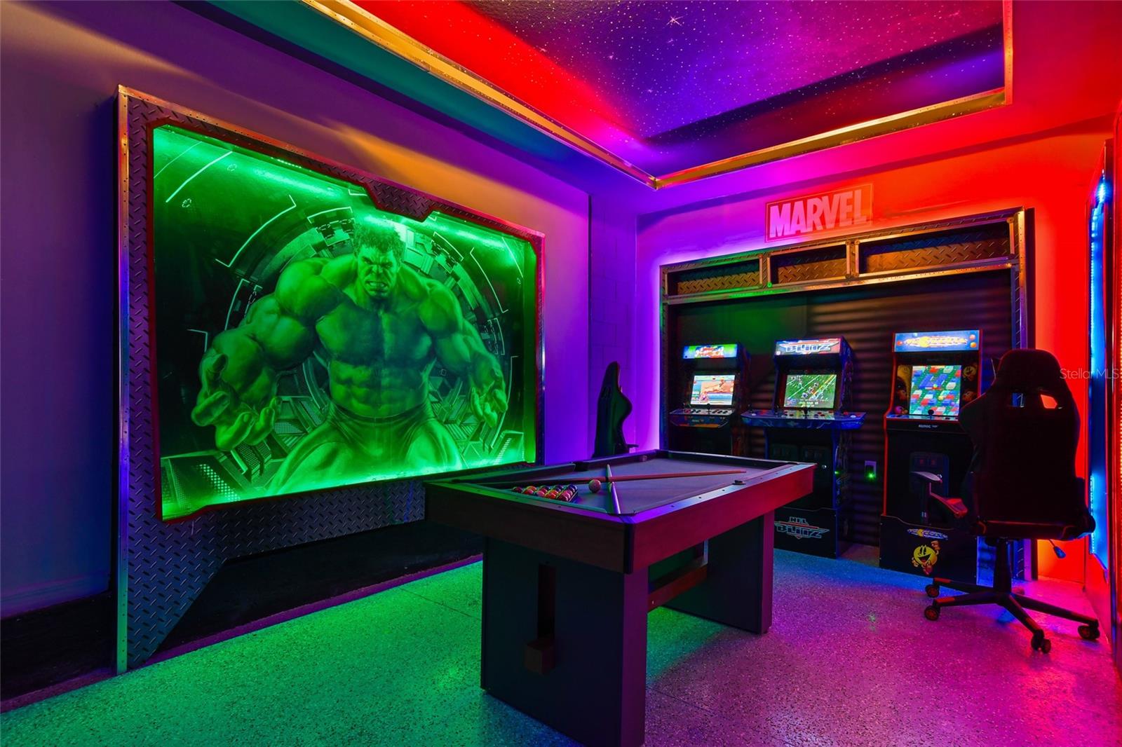 Turnkey Short-Term Rental Investment in Solara Resort! Experience the perfect blend of style, comfort, and strong rental potential with this beautifully furnished 7-bedroom vacation home in the sought-after Solara Resort. Built in 2023, this modern property features elegant tile flooring, professionally designed décor, and two primary suites—one upstairs and one downstairs—plus an additional main-floor guest suite ideal for multi-family stays. Three beautifully themed bedrooms add exceptional guest appeal, while the loft has been fully transformed into a spacious game room/movie room with new vinyl flooring. The garage is upgraded into a custom Avengers-themed arcade with split AC, maximizing entertainment value and rental performance. The open-concept kitchen showcases stainless steel appliances, granite countertops, and generous prep space, flowing seamlessly into the dining and living areas for easy entertaining. Outside, enjoy a private screened oasis with a heated pool, spa, and covered lanai—perfect for unwinding after days at the parks. Solara Resort offers world-class amenities, including a full-service restaurant, ice cream shop, coffee bar, fitness center, basketball and soccer courts, beach volleyball, a resort-style pool with cabanas, tiki bar, and splash zone. HOA fees include cable, internet, landscaping, valet trash, and common-area maintenance. Located just 8 miles from Walt Disney World and close to Universal, SeaWorld, and Orlando’s top attractions, this gated resort community delivers both a luxurious personal getaway and a high-performing rental asset. Whether you're seeking a premium investment or your own vacation retreat, this home checks all the boxes.