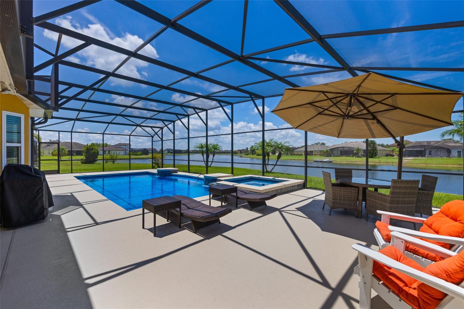 Waterfront home with a private saltwater pool & spa and 3-car garage in the Shingle Creek Reserve golf community. One of a limited number of homes with direct boat access to the 23,000-acre Lake Tohopekaglia, known worldwide for bass fishing, trophy-size fish and recreation. Brand new 2025 roof. Brand new 2025 pool equipment including new pool heater, filter, pump and lights. This home is light and bright with a modern open floor plan, 3 bedrooms with walk-in closets and 3 full bathrooms with showers, plus a den, inside laundry room and drop zone. Large windows and sliding doors across the rear of the home open onto an extended screened lanai and your private 32X14 pool with a lighted waterfall. Beyond the lanai, a landscaped yard and 124 feet of lake frontage.
