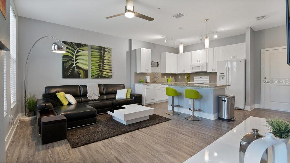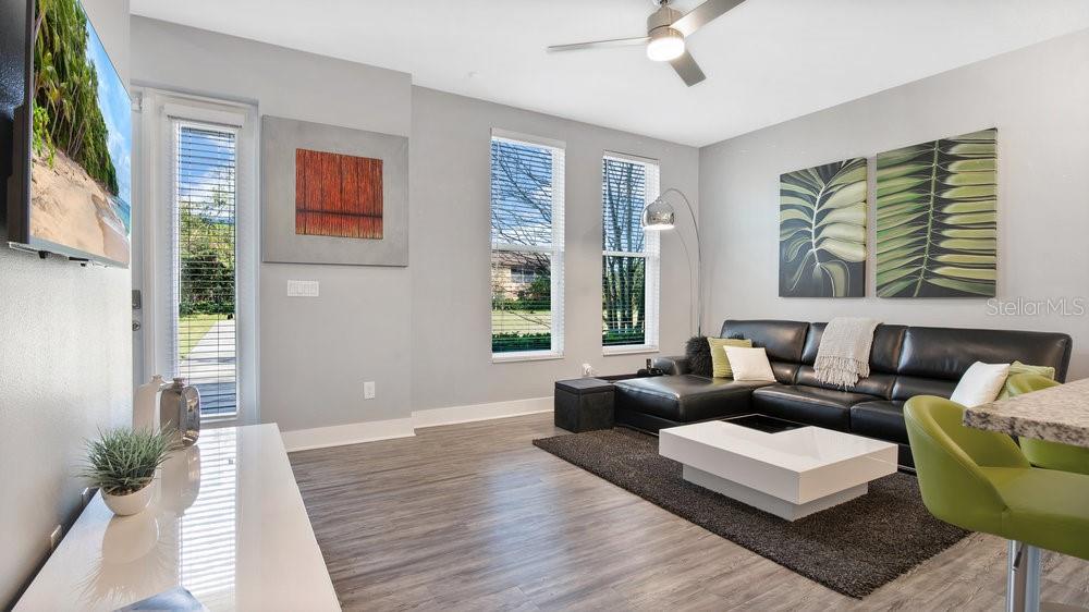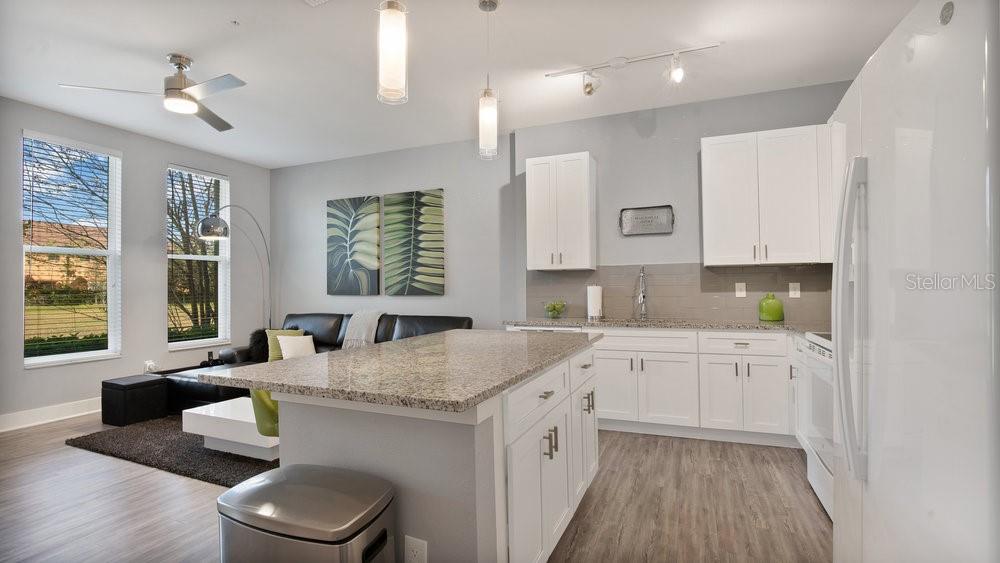 Priced to sell! Discover modern living in this contemporary end-unit townhome in Kissimmee’s SoHo at Lakeside, offering extra privacy, additional natural light, and peaceful greenbelt views. The main level features a bright, open-concept layout with wood-look flooring, large windows, and a seamless flow into the kitchen—complete with granite countertops, a spacious center island, white shaker-style cabinetry, and stylish lighting that’s perfect for everyday living and entertaining. Upstairs, unwind in the primary suite with a walk-in closet, a sleek en-suite bath, and a private balcony overlooking the trees and walking path—your own outdoor escape. Additional conveniences include modern bathrooms, an in-unit washer and dryer, and a two-car garage. Enjoy incredible HOA value with community pool access, exterior maintenance (including the roof), cable TV, internet/Wi-Fi, lawn care, and trash service included. Ideally located near Orlando International Airport and the Lake Nona/Medical City area, with easy access to shopping, dining, and major roadways.