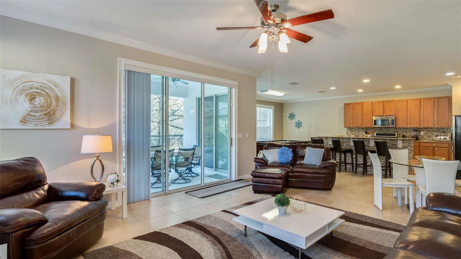 Beautifully situated 6 bed, (5) full (1) half baths, on an oversized lot features; private screened pool/spa, crown molding throughout the home including hallways, wood trimmed/framed windows. Spacious rooms, walk-in closets, and lots of windows for natural light! As you walk in, the flex room can be anything you want. The pool with spa and covered/screened-in patio is an attraction on its own. This fully furnished home can be yours. Upgraded kitchen w/granite and glass tile backsplash, breakfast bar, stainless steel appliances, washer/dryer, ceramic tile flooring on 1st floor, well maintained carpet on second level, ceiling fans, the two car garage. You can't miss out on this opportunity! Bella Vida Resort has all the best resort amenities, such as pools, playgrounds, volleyball courts, and much more! It is also just 20 minutes from Disney World. Schedule a showing today!