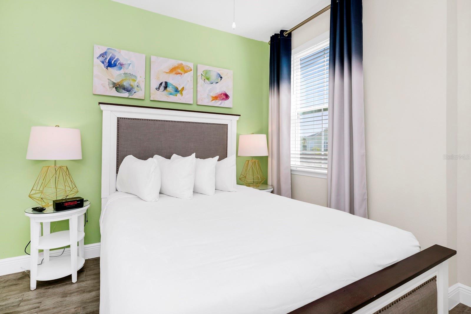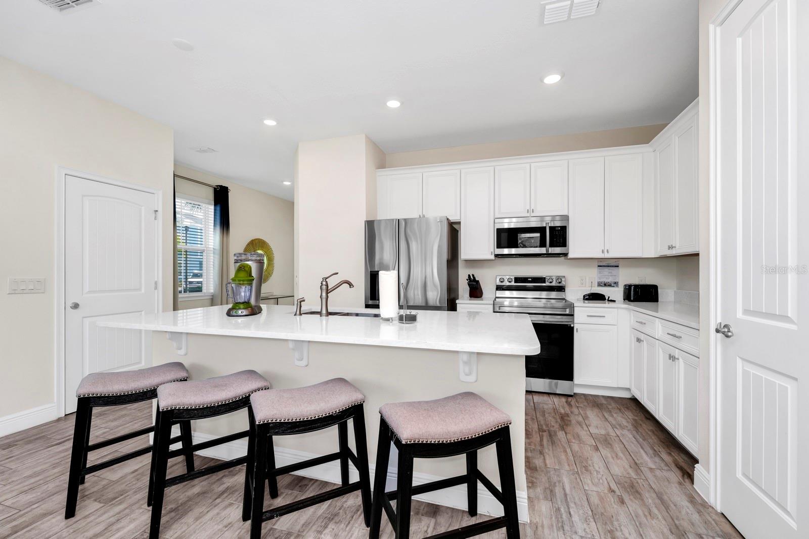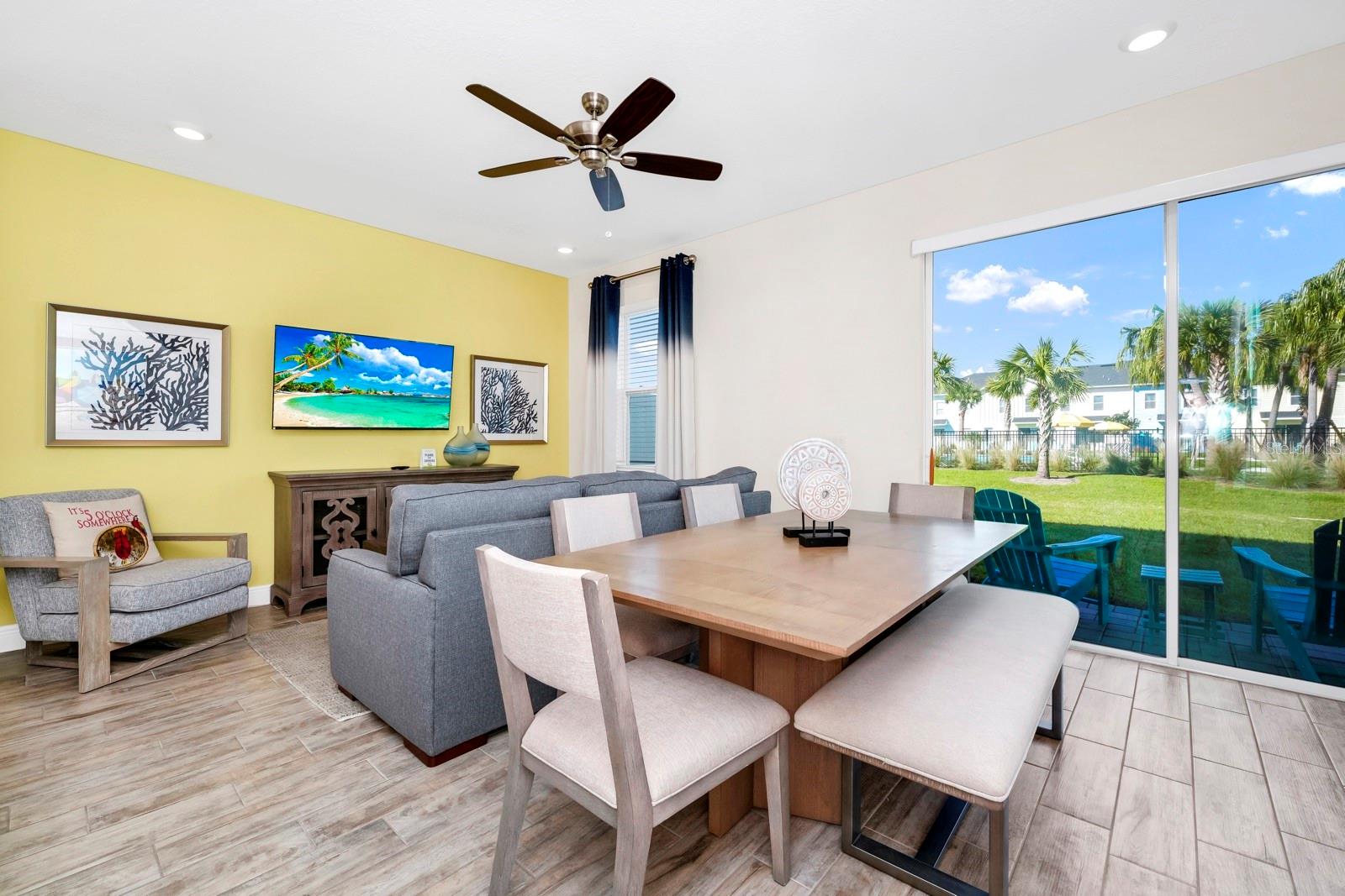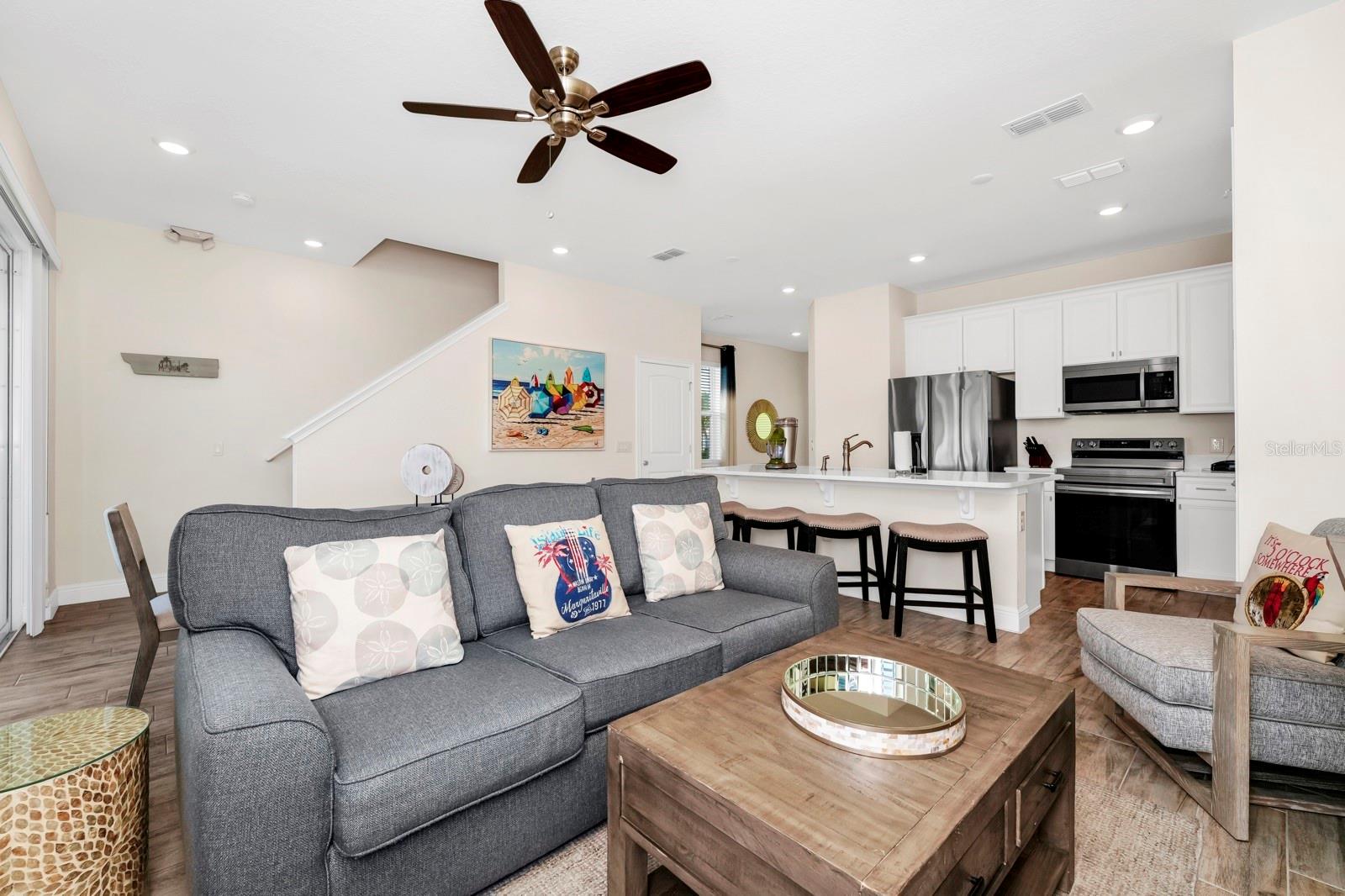 Bright and spacious 4 bedroom POOL FRONT villa located in the heart of Margaritaville Resort just 5 minutes from Disney! This spacious townhome has one bedroom downstairs, and three bedrooms upstairs - plenty of space for your family or guests. It also comes with high end wood look tile, quartz countertops, upgraded appliances, wooden stairs, private owners' closet, high ceilings, and so much more! This property can be used as a full-time residence, second home, or short-term rental property. This resort style community features three large swimming pools near the Margaritaville Resort Hotel, 4 pools just steps from the villa itself, multiple restaurants and bars, fitness center, full-service spa, lush and tranquil walking trails to all ends of the community, as well as a moments walk to all of the restaurants, bars, shops and entertainment that Sunset Walk has to offer! Low maintenance resort living includes fully maintained grounds, home exterior, lawn care, and 24/7 roaming and manned gated security entrance.