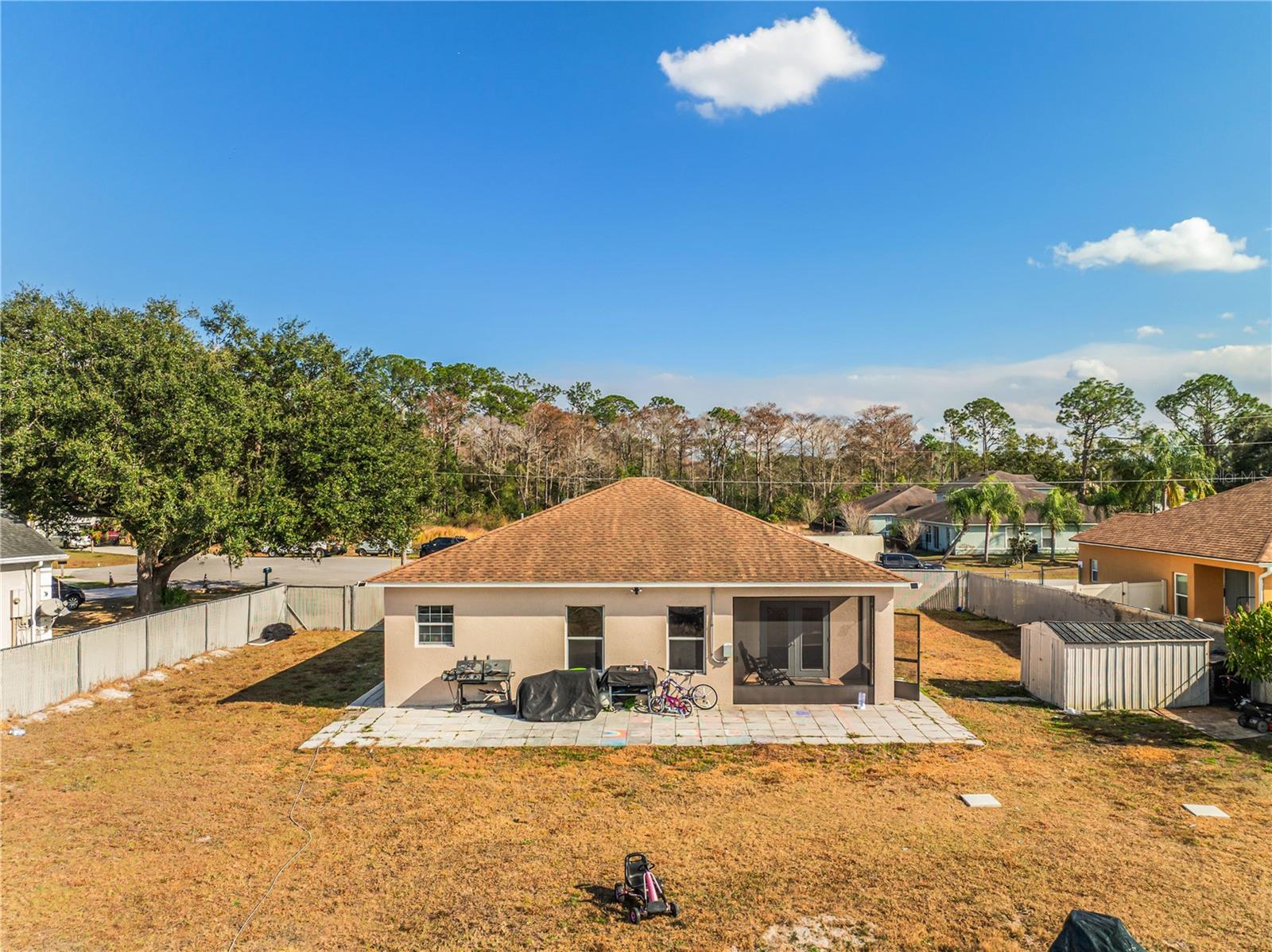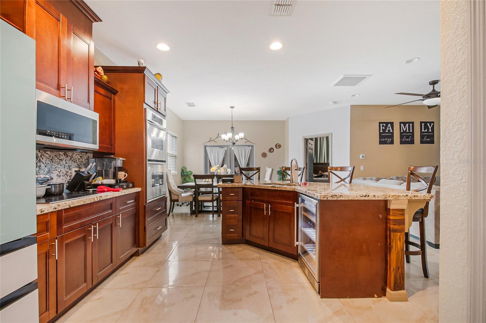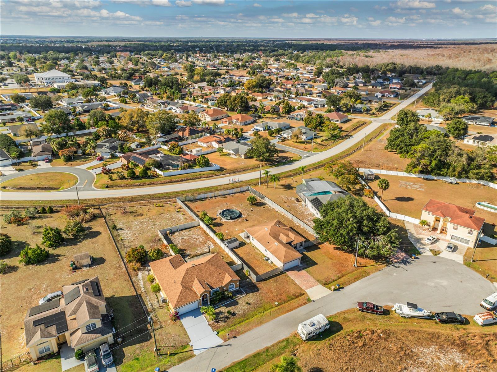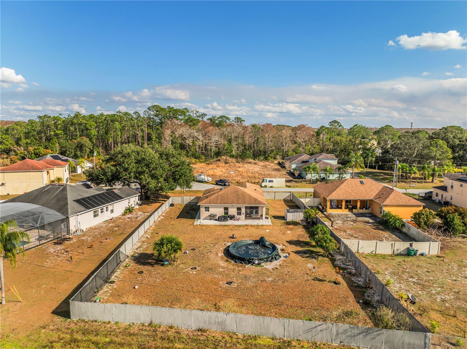 Welcome to this beautifully maintained 2020-built home located in the established Poinciana Village community. This 3-bedroom, 2-bath residence features an open-concept layout with elegant 24x24 porcelain tile throughout and abundant natural light. At the heart of the home, the spacious family room flows seamlessly into the gourmet kitchen, complete with 2-inch granite countertops, Frigidaire built-in double ovens and cooktop, a large U-shaped island with bar seating, 42-inch cabinets with crown molding, and stainless steel Samsung appliances. A walk-in pantry and adjacent dinette make this space ideal for everyday living and entertaining. The private owner’s suite is located at the rear of the home and offers a walk-in closet and a spa-like en-suite bathroom featuring an oversized walk-in shower with natural light, double vanity with granite countertops, and premium fixtures. Two additional bedrooms and a full bath with a tiled walk-in shower are thoughtfully positioned on the opposite side of the home. Additional highlights include a dedicated laundry room with Samsung washer and dryer, direct garage access, and dual French doors leading to a tiled and paver patio—perfect for enjoying peaceful sunsets. Situated on an oversized, fully fenced lot of approximately one acre with no rear neighbors, the backyard offers exceptional privacy and space for outdoor living, gardening, or a future pool. The property features mature fruit trees including papaya, plantain, mango, yucca, and bamboo. Energy-efficient upgrades include a 3-ton Carrier A/C system with UV light, along with Kuna security cameras and exterior lighting for added peace of mind. Community amenities are located within three miles and include a pool, clubhouse, basketball court, and dog park. HOA fees include cable and internet. Conveniently located near the post office and shopping center. This move-in-ready home combines modern design, privacy, and space—an exceptional opportunity in today’s market. Schedule your private showing today!