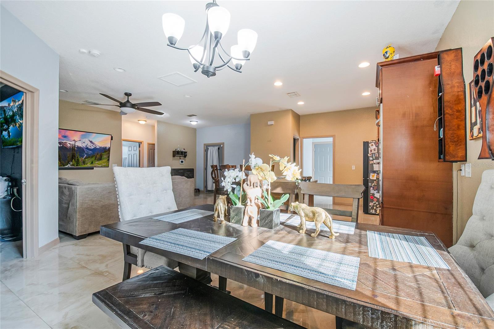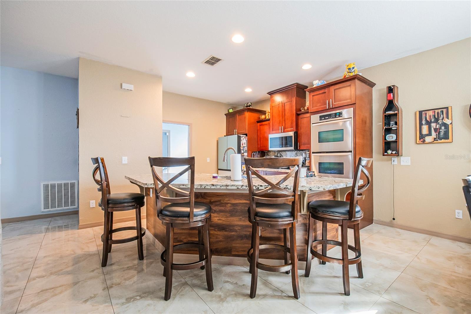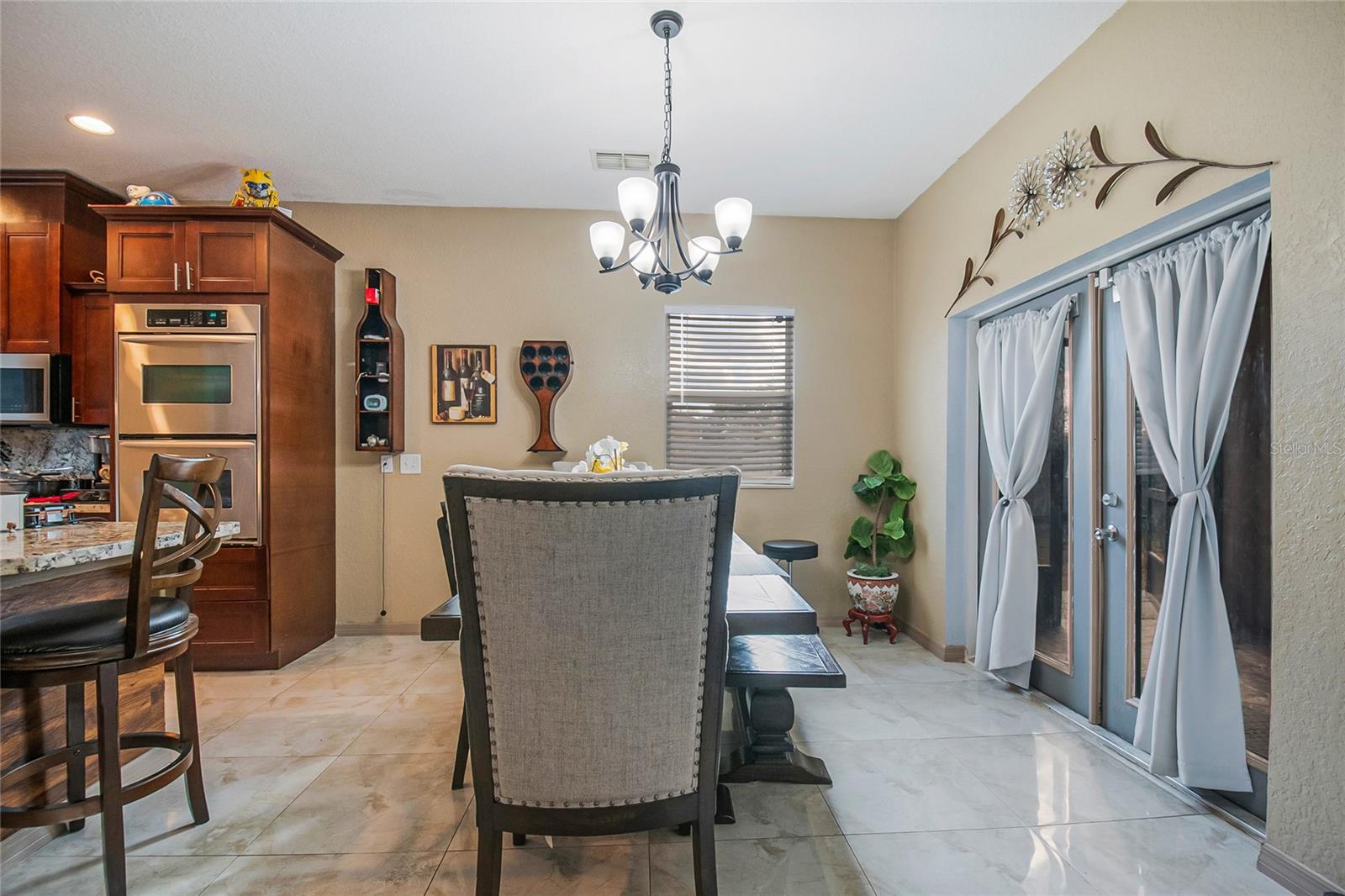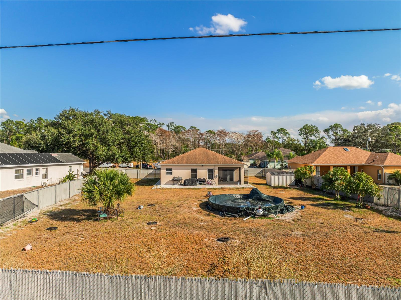 Welcome to this beautifully maintained 2020-built home located in the established Poinciana Village community. This 3-bedroom, 2-bath residence features an open-concept layout with elegant 24x24 porcelain tile throughout and abundant natural light. At the heart of the home, the spacious family room flows seamlessly into the gourmet kitchen, complete with 2-inch granite countertops, Frigidaire built-in double ovens and cooktop, a large U-shaped island with bar seating, 42-inch cabinets with crown molding, and stainless steel Samsung appliances. A walk-in pantry and adjacent dinette make this space ideal for everyday living and entertaining. The private owner’s suite is located at the rear of the home and offers a walk-in closet and a spa-like en-suite bathroom featuring an oversized walk-in shower with natural light, double vanity with granite countertops, and premium fixtures. Two additional bedrooms and a full bath with a tiled walk-in shower are thoughtfully positioned on the opposite side of the home. Additional highlights include a dedicated laundry room with Samsung washer and dryer, direct garage access, and dual French doors leading to a tiled and paver patio—perfect for enjoying peaceful sunsets. Situated on an oversized, fully fenced lot of approximately one acre with no rear neighbors, the backyard offers exceptional privacy and space for outdoor living, gardening, or a future pool. The property features mature fruit trees including papaya, plantain, mango, yucca, and bamboo. Energy-efficient upgrades include a 3-ton Carrier A/C system with UV light, along with Kuna security cameras and exterior lighting for added peace of mind. Community amenities are located within three miles and include a pool, clubhouse, basketball court, and dog park. HOA fees include cable and internet. Conveniently located near the post office and shopping center. This move-in-ready home combines modern design, privacy, and space—an exceptional opportunity in today’s market. Schedule your private showing today!