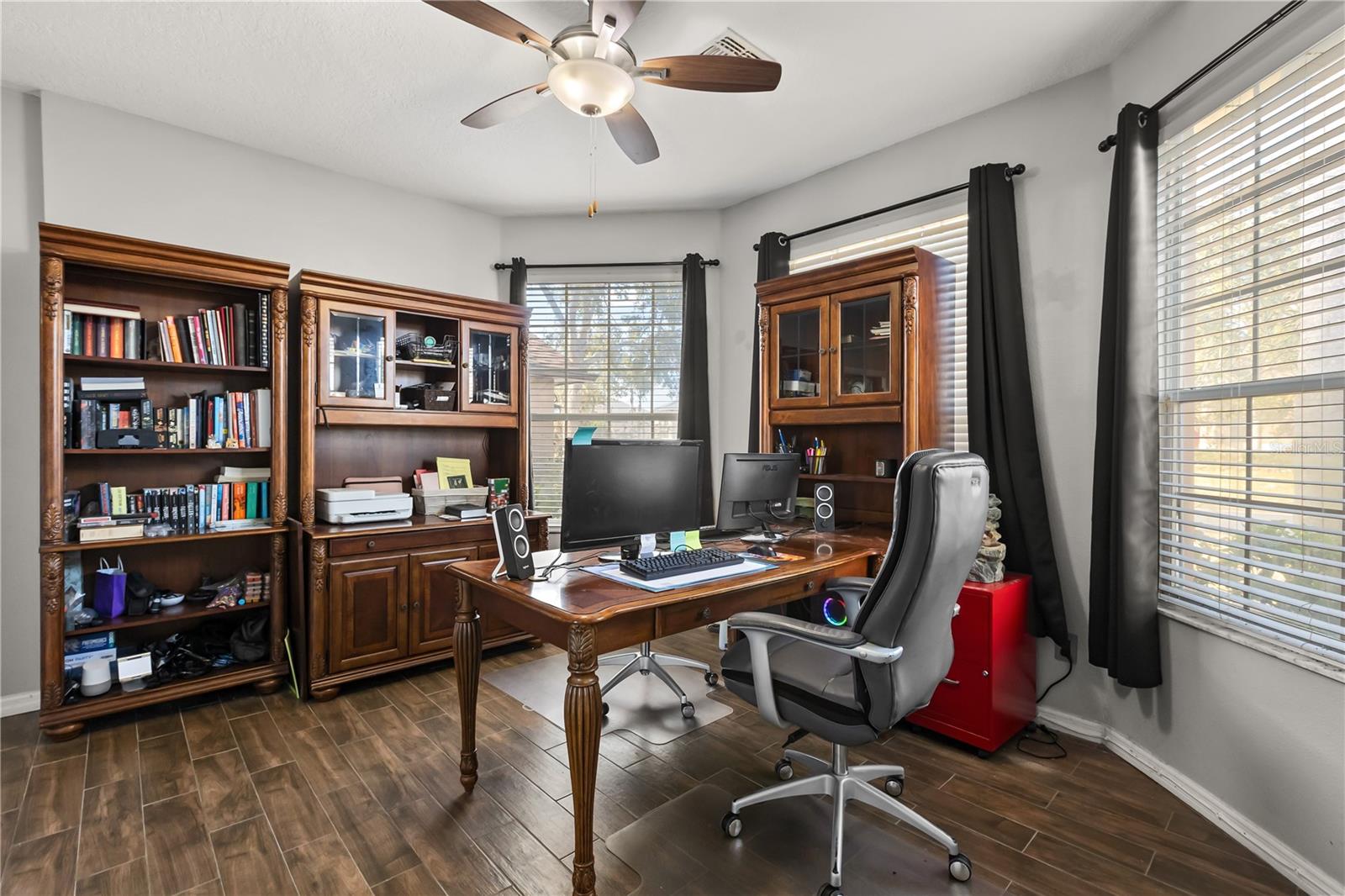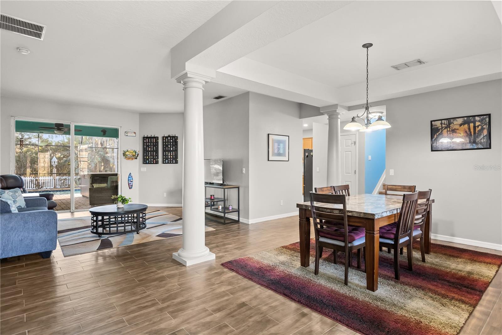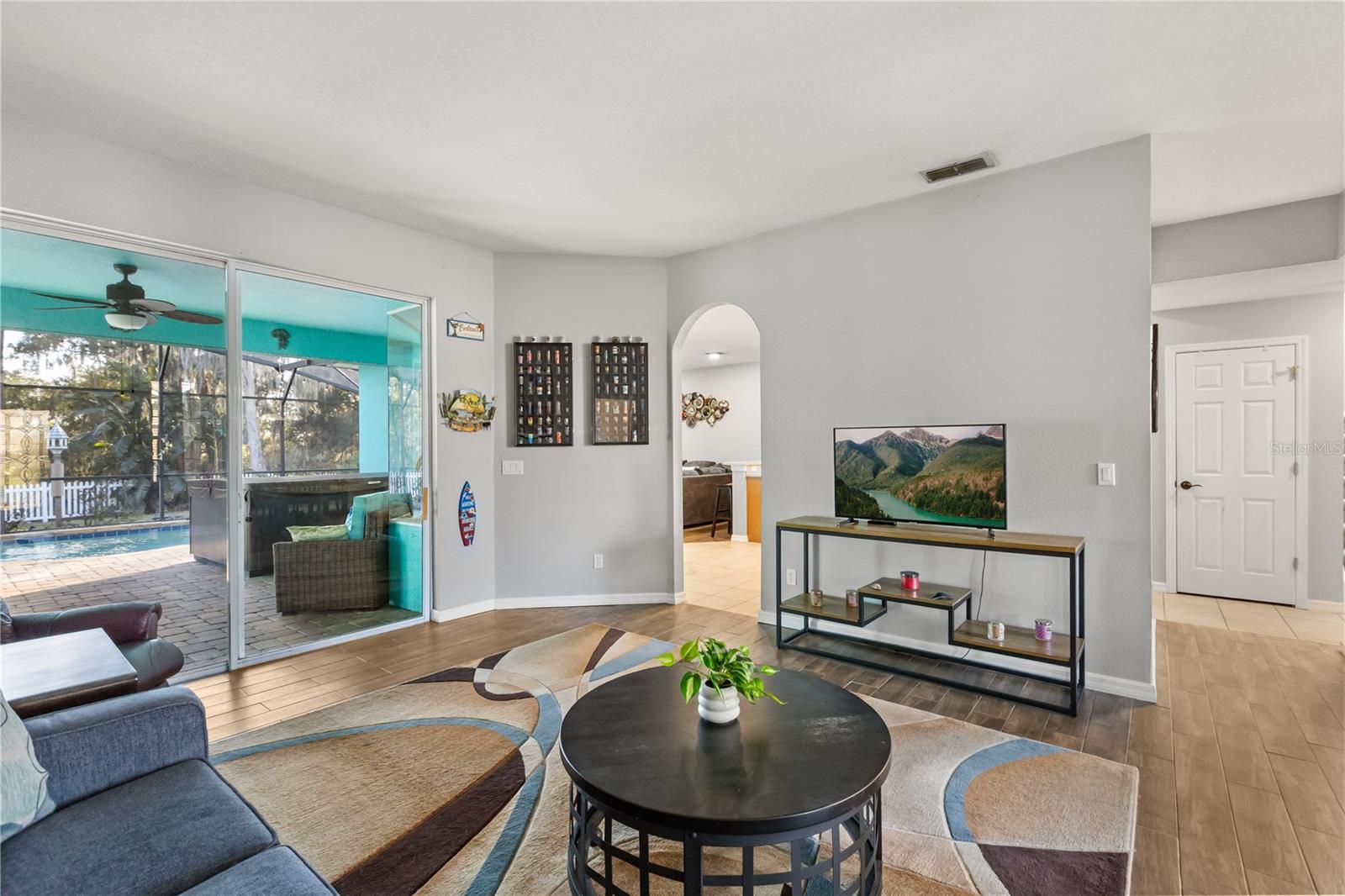Spacious 3,660 sq. ft. 5-bedroom 3 bath single-family home located in the highly desirable 34744 zip code, just minutes from Lake Nona. This well-maintained property backs to a wooded conservation area and features a fully fenced backyard a newly screened-in lanai with a heated pool and decorative fountain--ideal for privacy and outdoor living. The first-floor primary suite includes plank style porcelain tile and a 6ft sliding glass door wall with direct pool access. An additional downstairs room may be used as a bedroom or office. The large kitchen overlooks the breakfast nook and family room. Upstairs offers three large bedroom's two with flex spaces plus a spacious bonus/game room. Roof is 6 years old and A/C units are 1 year old. Well-kept landscaping, low HOA, and convenient access to Medical City, Orlando International Airport, major shopping and SR-417.