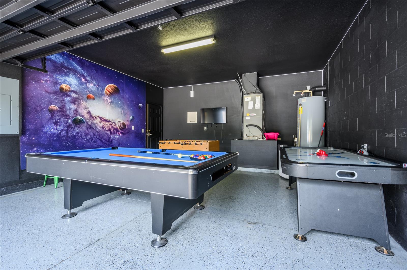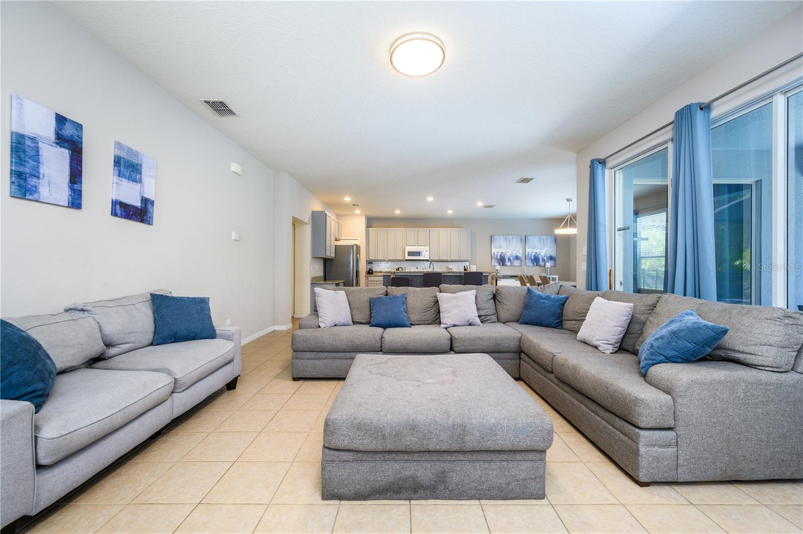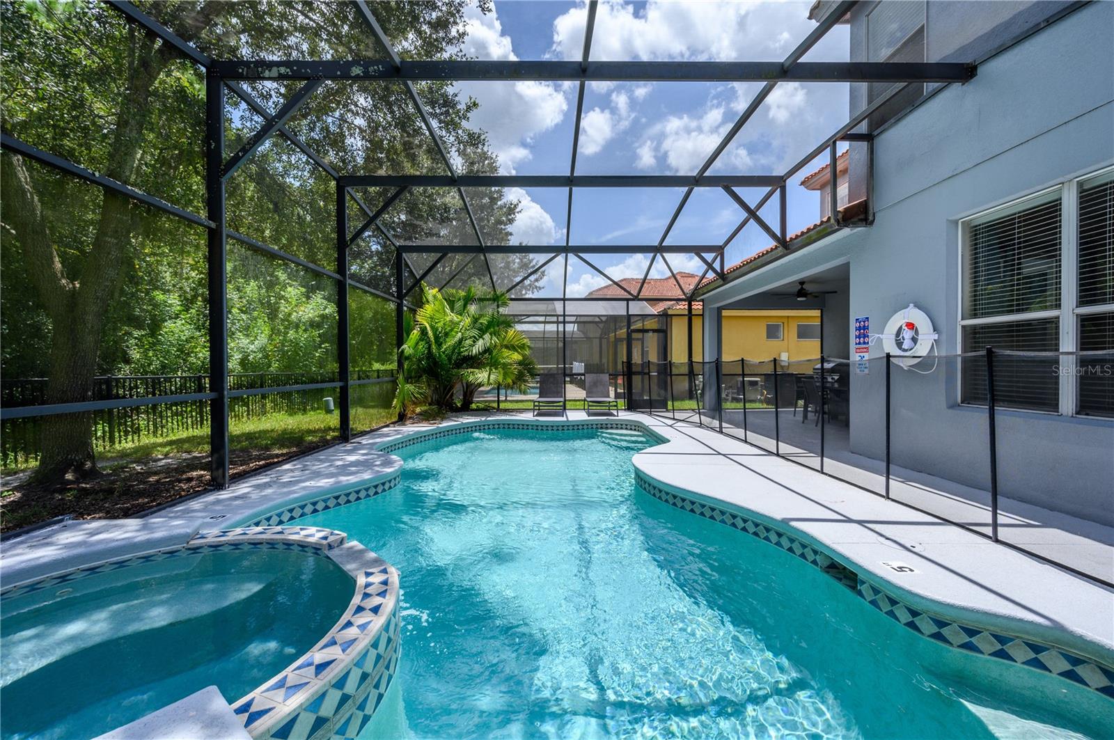 Fantastic six bedroom vacation home. Large rooms with ample closets . All bedrooms located upstairs. Five full baths upstairs, one half bath downstairs. Garage is currently converted to a game room. Conservation view to the rear (no rear neighbors) and a short walk across the street to the clubhouse. Gated community with well kept grounds and clubhouse amenities include large community pool with spa tub, workout room and reception area, playground and sand volleyball. There are sidewalks throughout the community. Convenient location to theme parks and shopping,this well maintained property is a must see. The property is offered fully furnished as a turn-key investment property