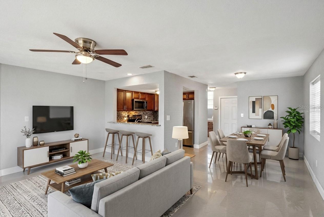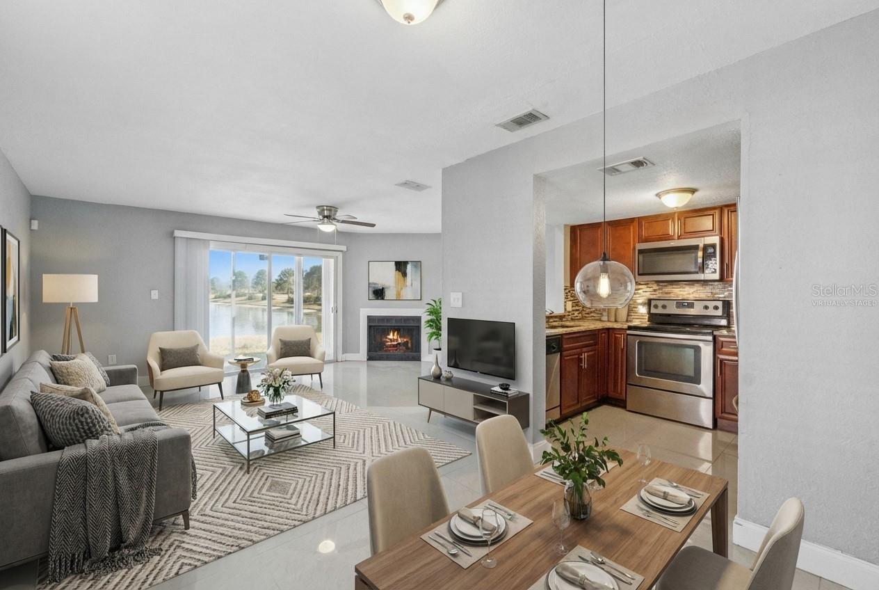 One or more photo(s) has been virtually staged. WATER VIEW! Spacious townhome END-UNIT with a private screened in patio and balcony overlooking the pond. This 2 Bedroom, 2.5 Bathroom townhome features over 1,200 square feet of living space and it's Move-In Ready. Open floor plan on the main level features a beautiful kitchen with granite countertops and stainless-steel appliances and dining room/living room with fireplace. Also on the first floor is the Guest Half Bathroom and laundry room. Porcelain tile flooring throughout the first floor and laminate flooring throughout the second floor. Two spacious bedrooms on second floor both with private bathrooms. The Primary Bedroom has a private balcony that overlooks the large POND. Updates: Roof (2018), AC (2018), Water Heater (2019). Located off of Buenaventura Boulevard within minutes to Buena Ventura Lakes and many shops & restaurants. Convenient and easy access to Florida’s turnpike, Osceola Parkway, FL 417 and approximately 25 minutes away from Orlando International Airport (MCO). This location is situated near Valencia College and major routes.