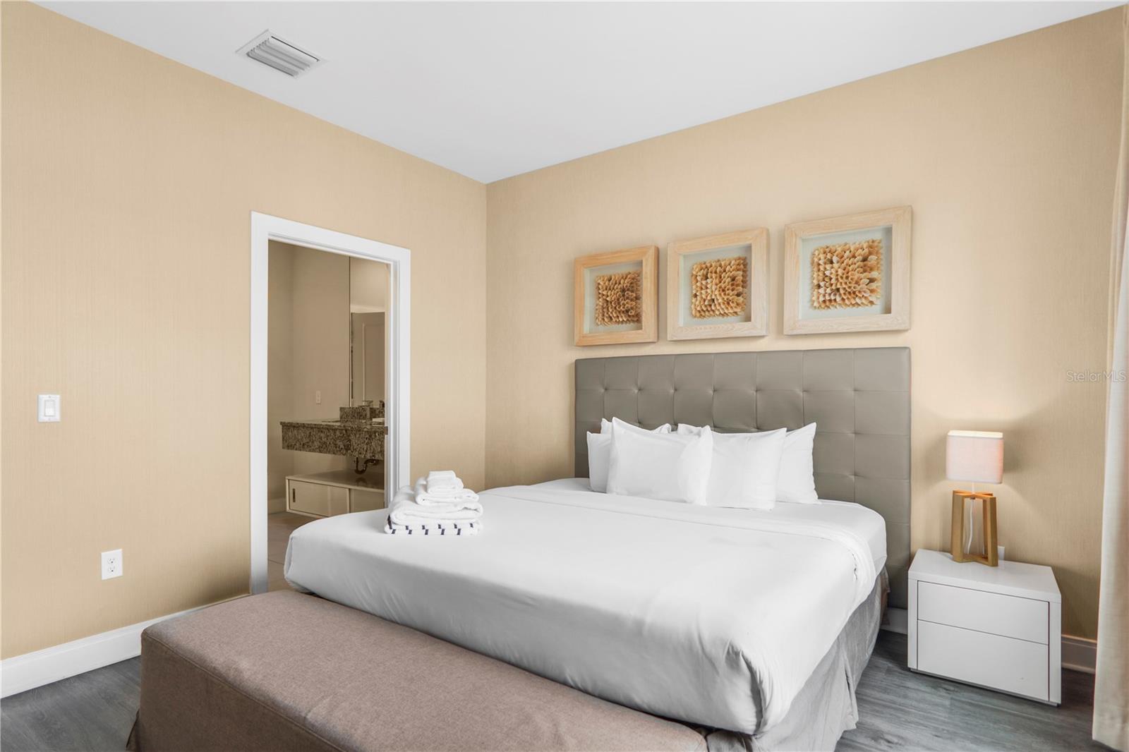 Your dream vacation home with a hotel-style concept awaits in the highly desirable Magic Village Yards community, located just minutes from Magic Kingdom and Orlando’s world-famous theme parks. This stunning and professionally designed townhome offers the perfect blend of luxury, comfort, and investment potential, making it an exceptional opportunity for those seeking a turnkey short-term rental property in one of Orlando’s most sought-after vacation home communities. Sold fully furnished with high-end décor and thoughtfully curated finishes, this property is ready to generate income from day one. Featuring hotel-quality beds and linens, flat-screen TVs, and top-of-the-line kitchen utensils, every detail has been designed to provide an elevated guest experience that attracts high occupancy and strong rental performance. The welcoming foyer leads to a functional and elegant open floor plan, highlighted by a modern kitchen equipped with stainless steel appliances, including a gas stove, and a spacious breakfast bar ideal for casual dining or entertaining. The impressive Great Room features soaring two-story ceilings, large windows, and sliding glass doors that allow natural light to fill the space, creating a bright and inviting atmosphere. One of the standout features of this home is that there is NO CARPET throughout the property. The first floor features beautiful porcelain tile flooring, while the stairs and entire second floor showcase modern luxury vinyl flooring, combining contemporary design with durability and easy maintenance. The sliding doors lead to a covered lanai designed for relaxing and entertaining. The outdoor area includes a built-in summer kitchen with sink and grill, comfortable seating space, and a PRIVATE JACCUZZI, perfect for unwinding after a full day enjoying Orlando’s theme parks. Upstairs, you will find three spacious bedrooms, each with its own ensuite bathroom, including two master suites that provide comfort and privacy for families or groups traveling together. A laundry room with full-size washer and dryer adds convenience and functionality for extended stays. Magic Village Yards offers a true resort lifestyle with premium amenities including concierge services, a 24-hour clubhouse, a fully equipped fitness center, housekeeping services, and a charming on-site restaurant. These luxury amenities make the community highly attractive to vacationers and investors alike, helping maximize rental occupancy and income potential. This exceptional property combines prime location, resort-style living, and strong investment potential in one of the most desirable vacation rental communities near Disney. Schedule your private showing today and discover the full potential of this remarkable townhome.