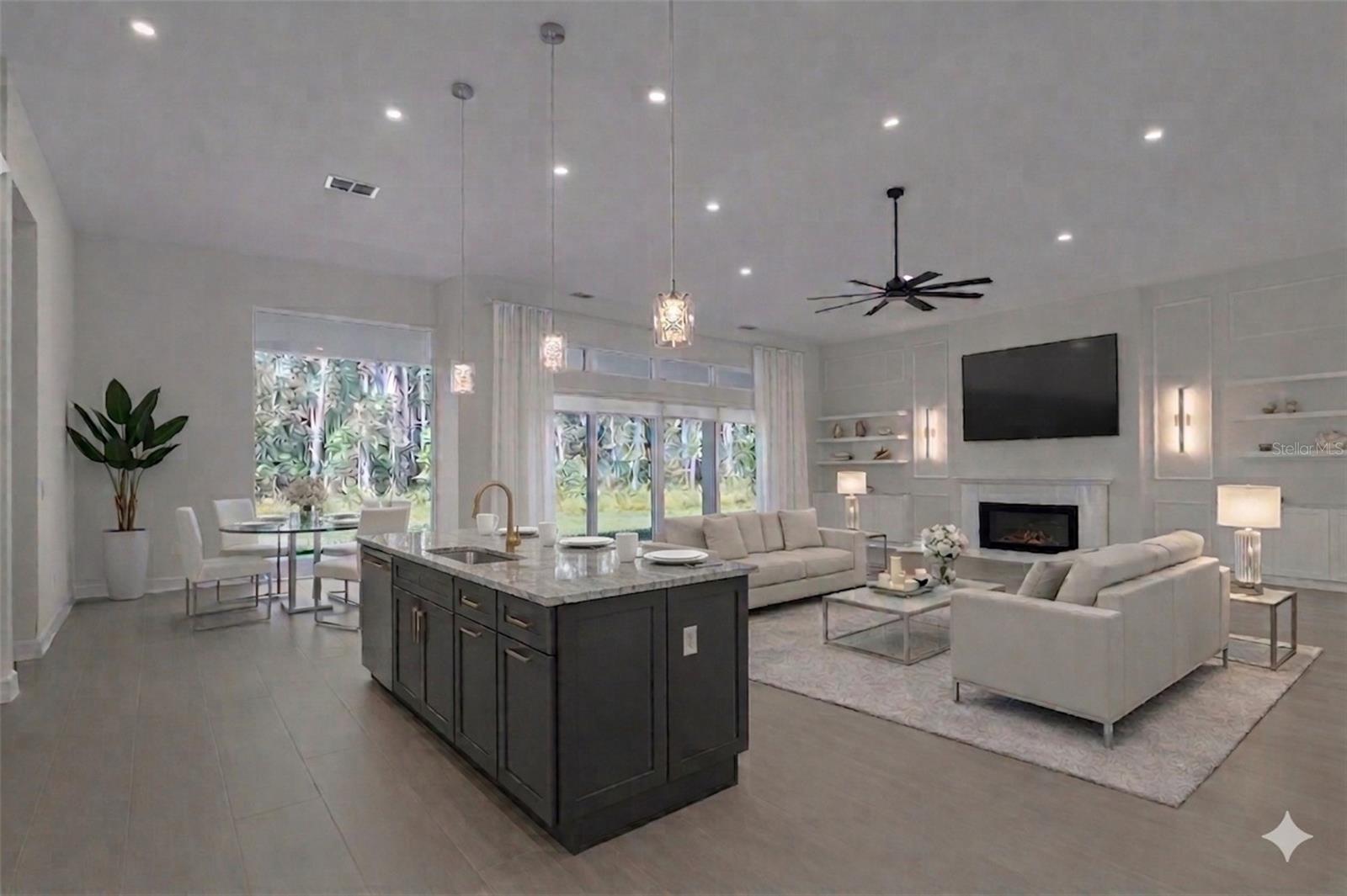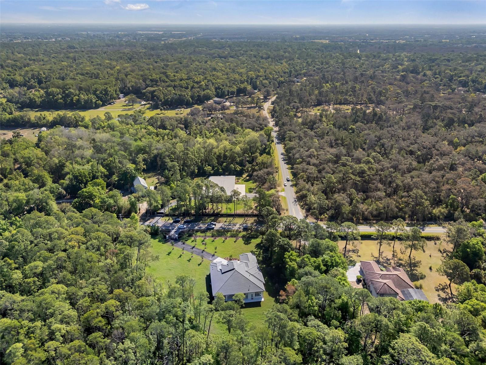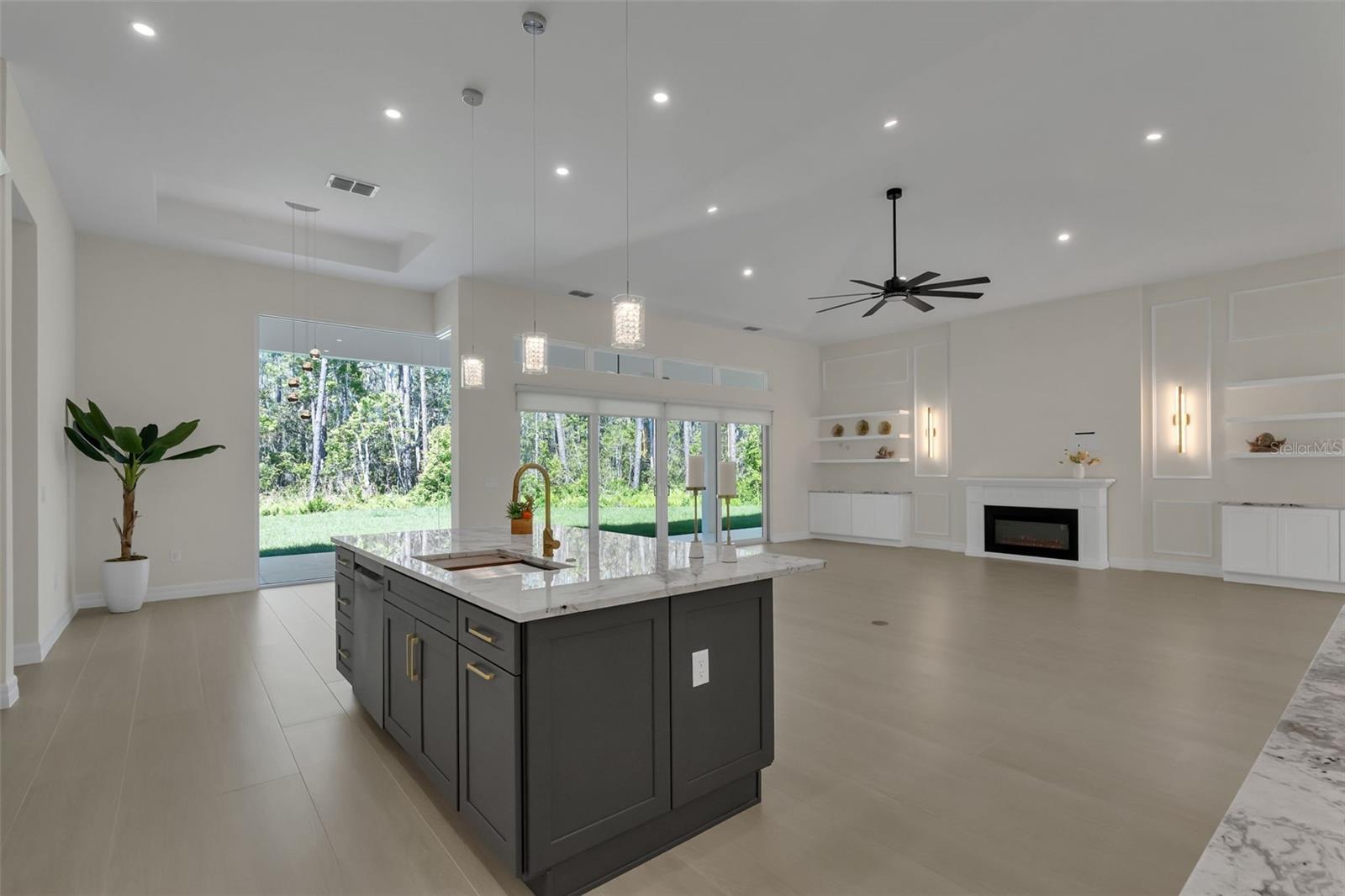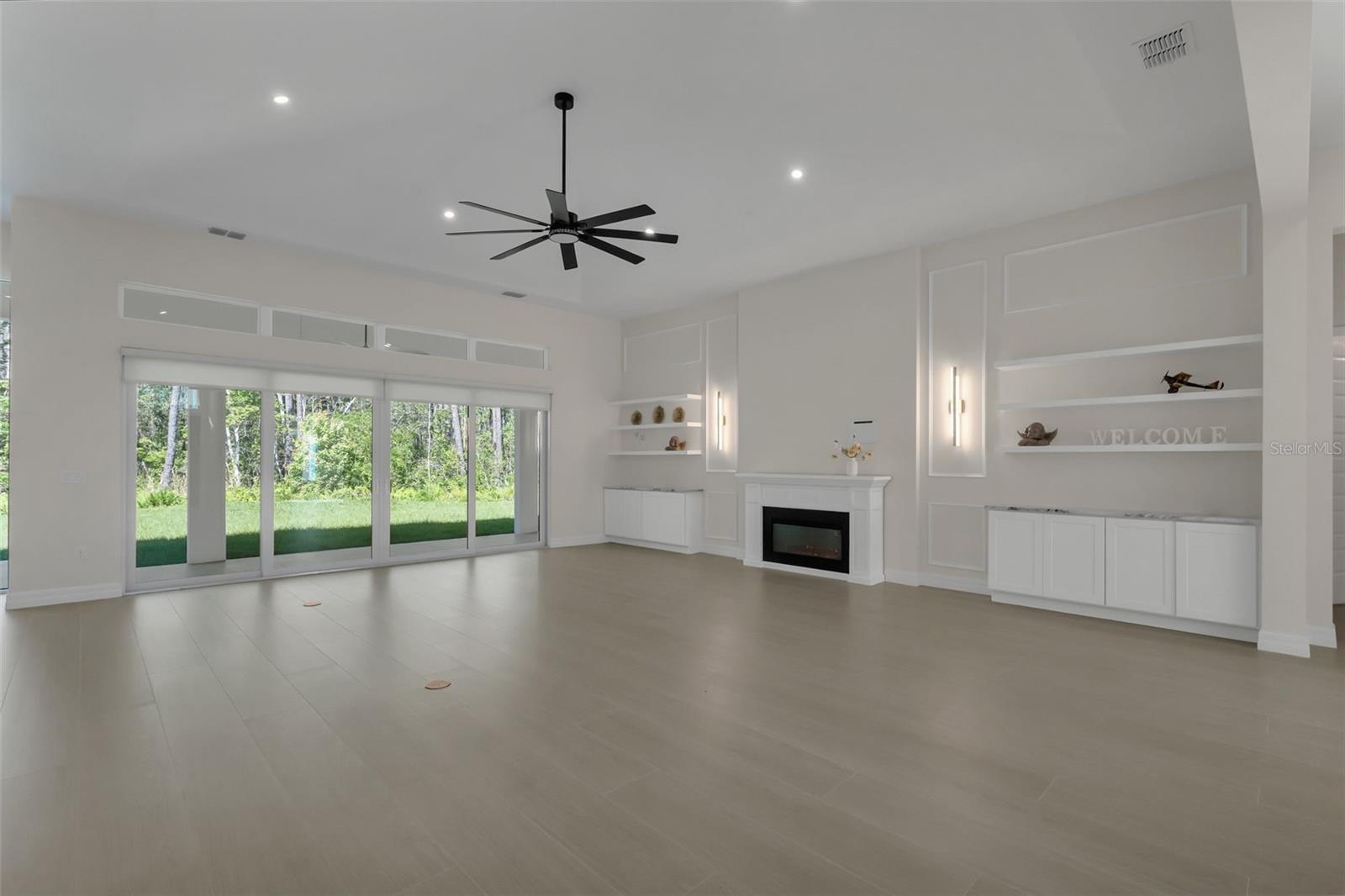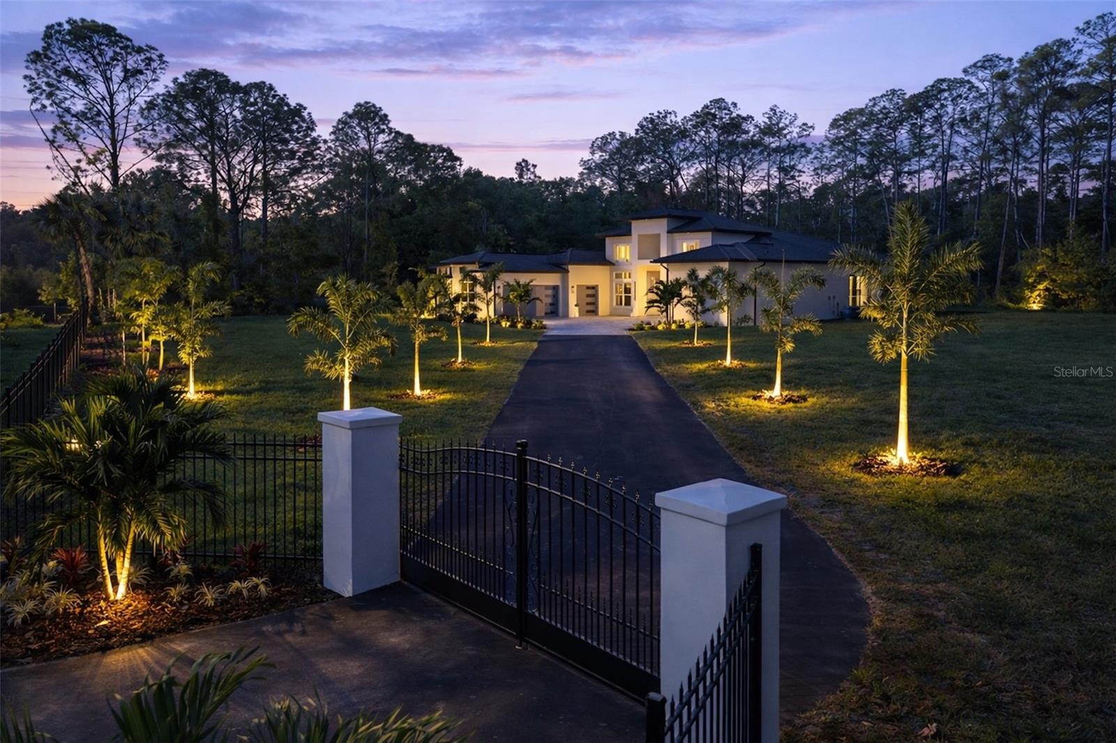One or more photo(s) has been virtually staged. Brand-new custom-built estate offering 4,179 sq ft of living space (5,558 sq ft under roof) on 5 private acres—never lived in! Ideally located in the sought-after acreage community of Happy Trails, just minutes from Celebration, Reunion, and Walt Disney World, this exceptional property offers the perfect blend of luxury, privacy, and convenience with no HOA restrictions and ample space for horses, recreation, and enjoying your private setting. Step inside to experience impressive architectural design, highlighted by 24-foot coffered ceilings in the grand foyer and formal dining room, a vaulted ceiling reaching 14 feet in the main living area, and 12–13 foot ceilings throughout, creating a bright, open, and expansive atmosphere. At the heart of the home is a stunning designer kitchen featuring an oversized island topped with Italian Mona Lisa granite, creating a true centerpiece for entertaining and everyday living. The kitchen is further enhanced by floor-to-ceiling custom cabinetry with illuminated upper display cabinets, a wet bar with wine cooler, and elegant finishes throughout. The open-concept layout flows seamlessly into the main living space, complemented by premium porcelain tile flooring throughout. The spacious living area features a modern electric fireplace with mantel surround, beautifully complemented by custom built-in cabinetry and designer wall shelving, adding warmth and architectural elegance to the space. The thoughtfully designed floor plan includes a central living area with a kitchen/family room combo and a desirable split-bedroom layout for added privacy. The luxurious primary suite is a true retreat, featuring an elegant double-door entry and dual oversized walk-in closets, including a custom “hers” closet measuring approximately 20’8” x 5’6” and a generous “his” closet at 13’8” x 5’8”, both designed with quality wood shelving and mirrored sliding doors. Additional highlights include Energy Star® certified windows, step-free access throughout, and a beautifully finished paver driveway, walkways, and outdoor living areas. The home is also equipped with a private well system, providing a reliable water source and eliminating monthly water utility costs. This rare 5-acre estate offers exceptional privacy and space while being conveniently located near world-class dining, shopping, and entertainment.