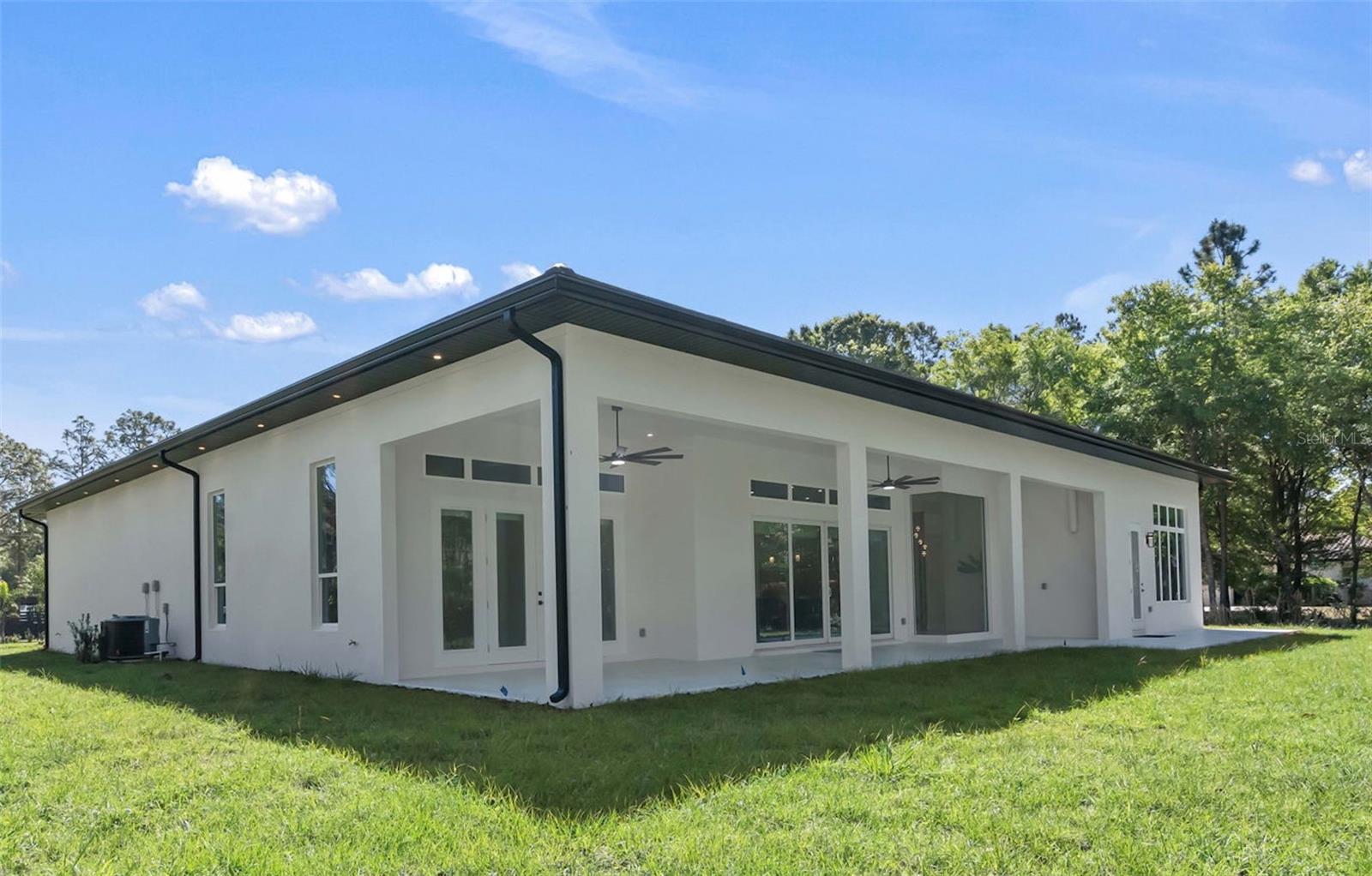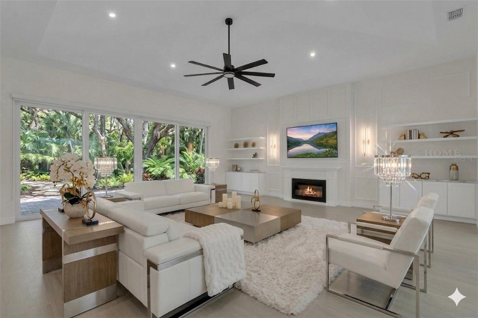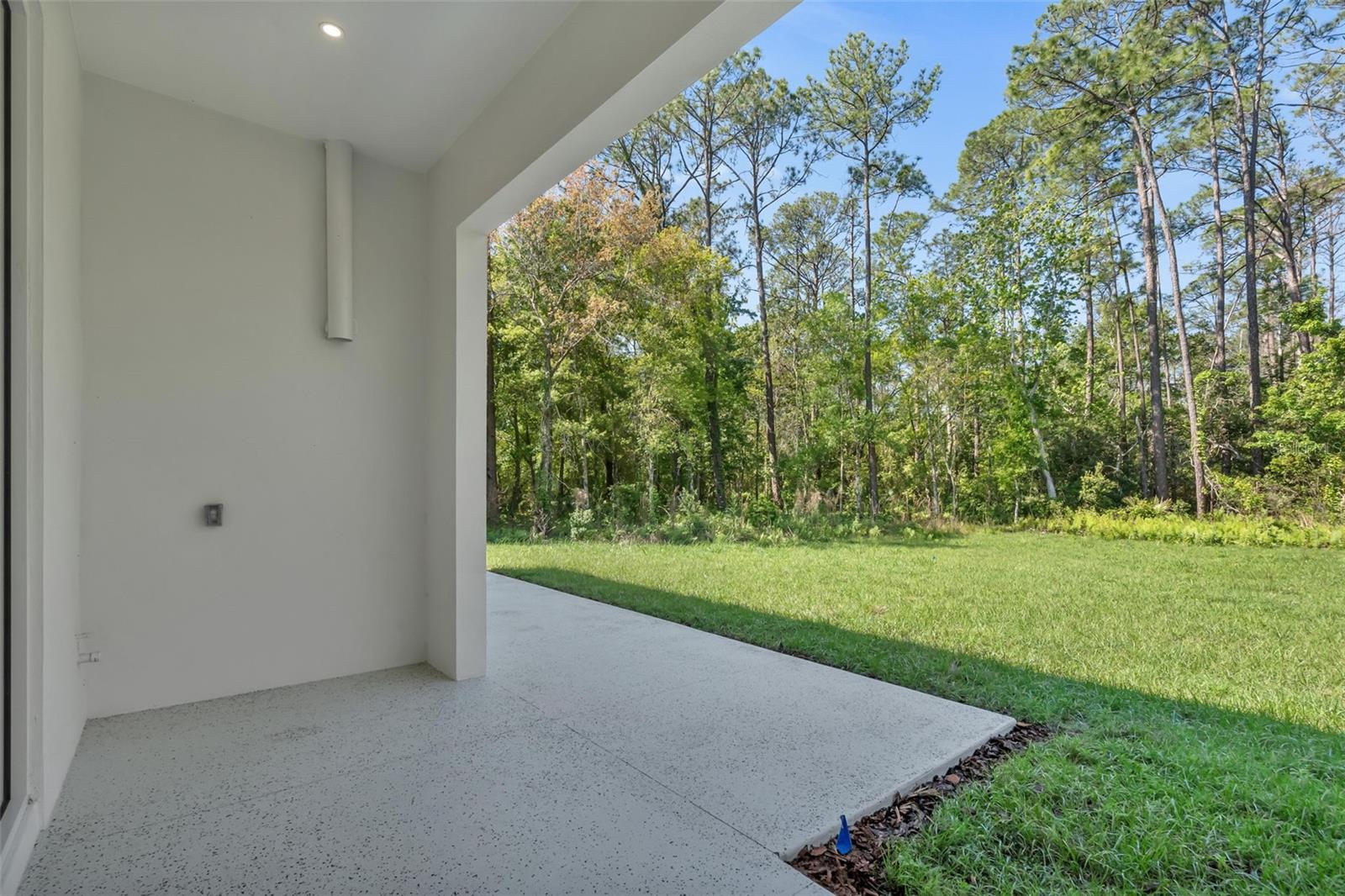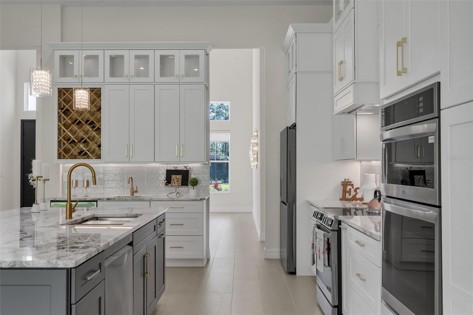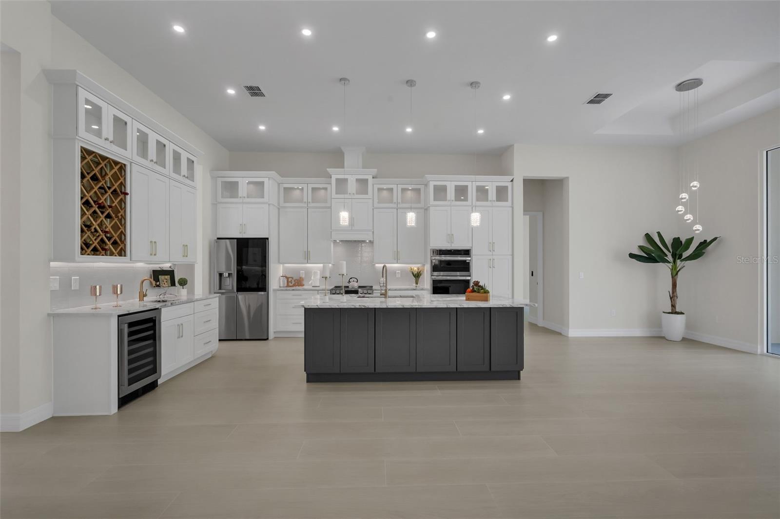 One or more photo(s) has been virtually staged. Brand-new custom-built estate offering 4,179 sq ft of living space (5,558 sq ft under roof) on 5 private acres—never lived in! Ideally located in the sought-after acreage community of Happy Trails, just minutes from Celebration, Reunion, and Walt Disney World, this exceptional property offers the perfect blend of luxury, privacy, and convenience with no HOA restrictions and ample space for horses, recreation, and enjoying your private setting. Step inside to experience impressive architectural design, highlighted by 24-foot coffered ceilings in the grand foyer and formal dining room, a vaulted ceiling reaching 14 feet in the main living area, and 12–13 foot ceilings throughout, creating a bright, open, and expansive atmosphere. At the heart of the home is a stunning designer kitchen featuring an oversized island topped with Italian Mona Lisa granite, creating a true centerpiece for entertaining and everyday living. The kitchen is further enhanced by floor-to-ceiling custom cabinetry with illuminated upper display cabinets, a wet bar with wine cooler, and elegant finishes throughout. The open-concept layout flows seamlessly into the main living space, complemented by premium porcelain tile flooring throughout. The spacious living area features a modern electric fireplace with mantel surround, beautifully complemented by custom built-in cabinetry and designer wall shelving, adding warmth and architectural elegance to the space. The thoughtfully designed floor plan includes a central living area with a kitchen/family room combo and a desirable split-bedroom layout for added privacy. The luxurious primary suite is a true retreat, featuring an elegant double-door entry and dual oversized walk-in closets, including a custom “hers” closet measuring approximately 20’8” x 5’6” and a generous “his” closet at 13’8” x 5’8”, both designed with quality wood shelving and mirrored sliding doors. Additional highlights include Energy Star® certified windows, step-free access throughout, and a beautifully finished paver driveway, walkways, and outdoor living areas. The home is also equipped with a private well system, providing a reliable water source and eliminating monthly water utility costs. This rare 5-acre estate offers exceptional privacy and space while being conveniently located near world-class dining, shopping, and entertainment.