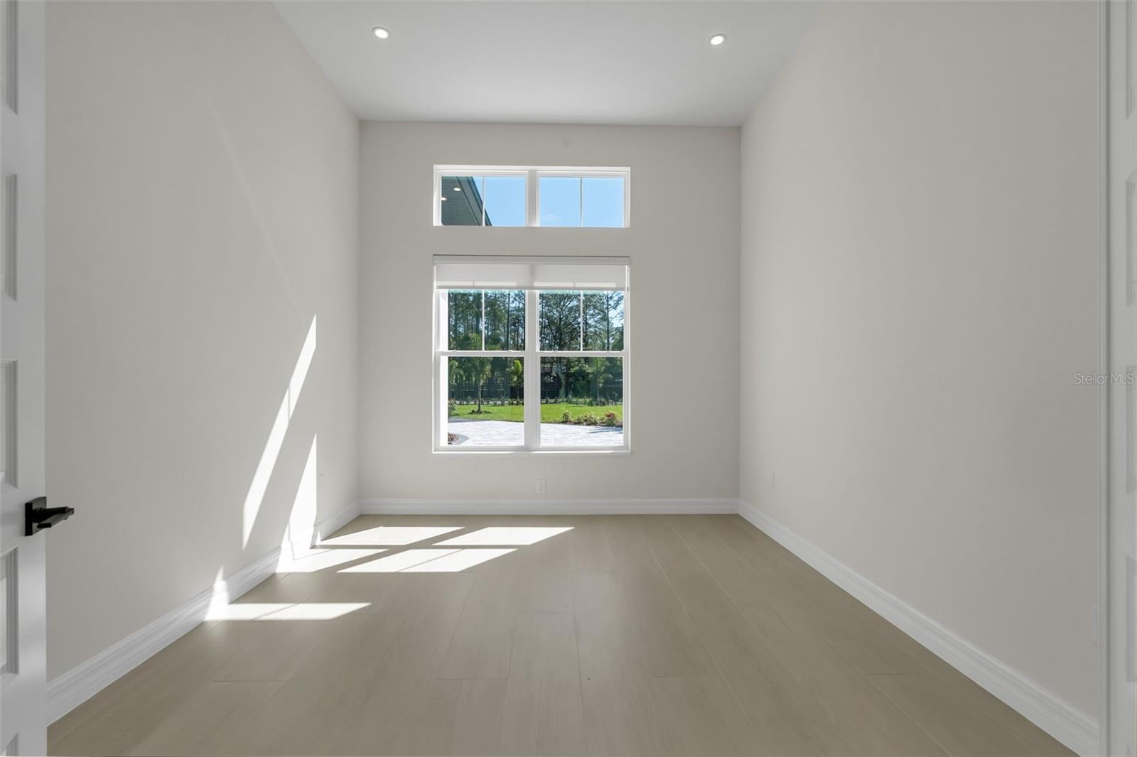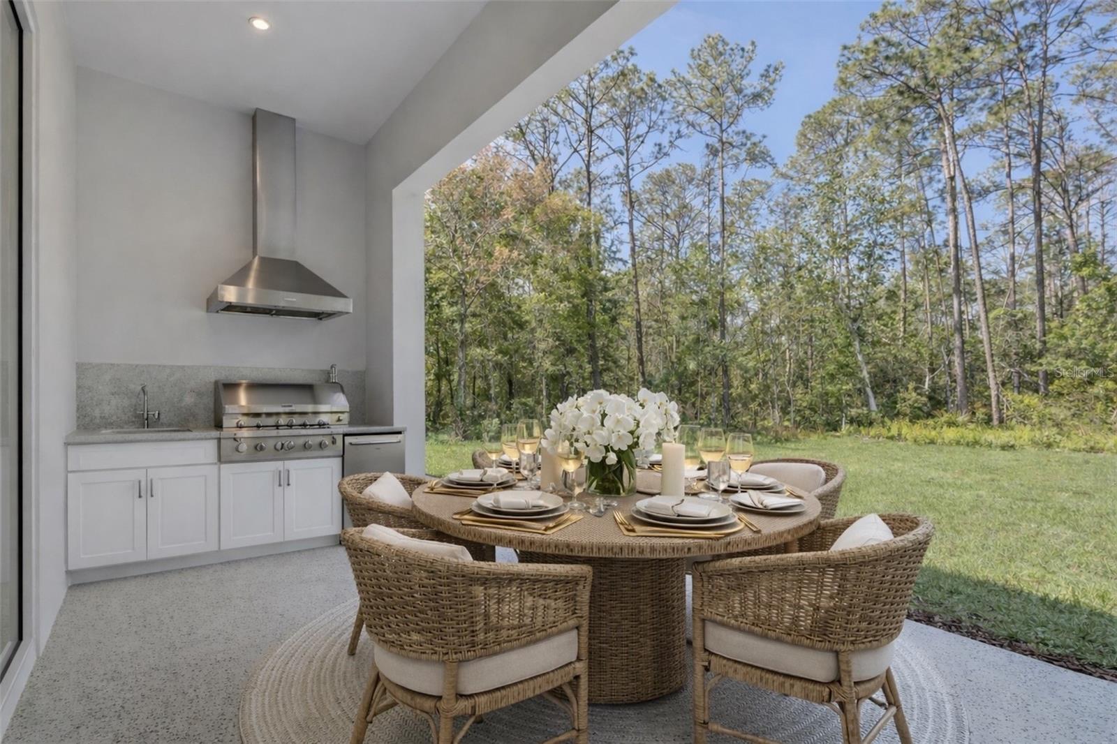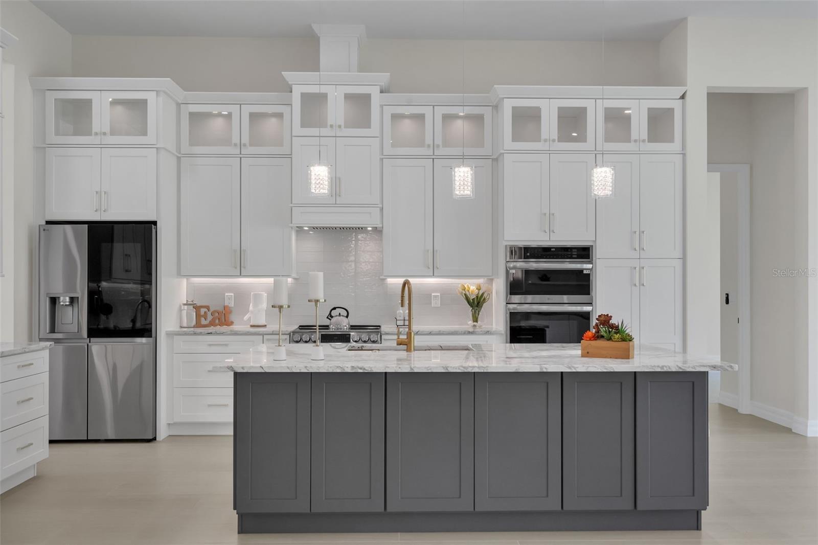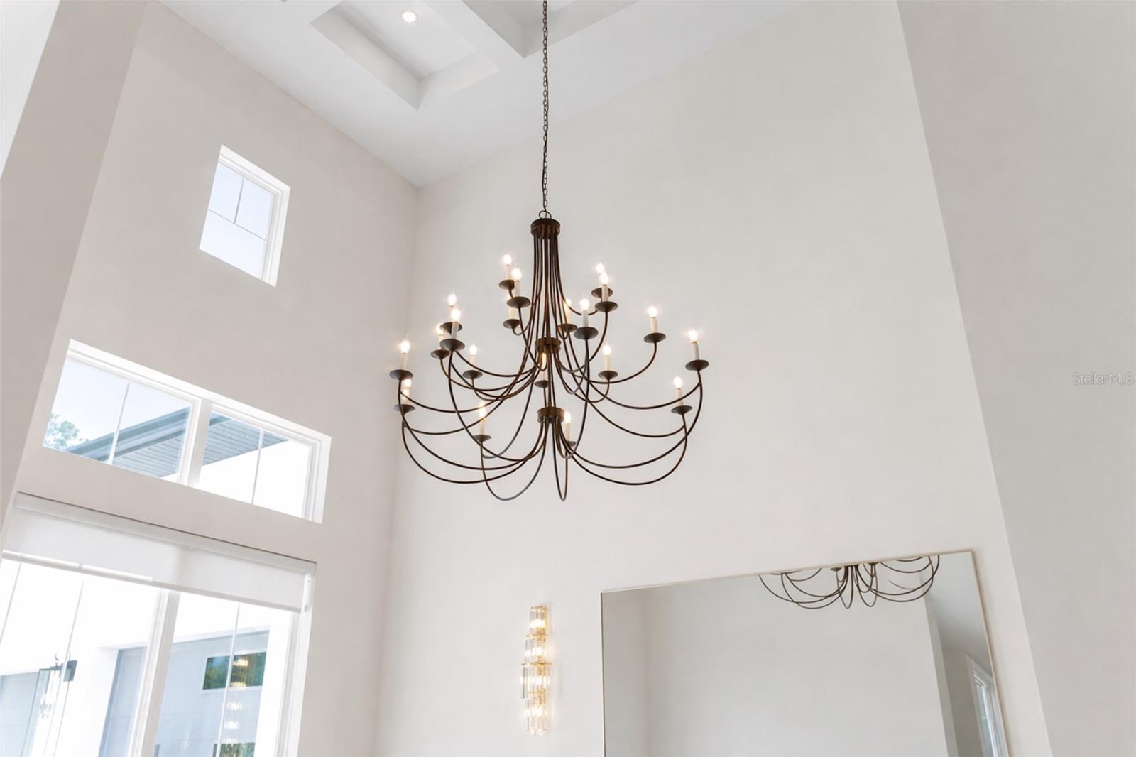 One or more photo(s) has been virtually staged. Brand-new custom-built estate offering 4,179 sq ft of living space (5,558 sq ft under roof) on 5 private acres—never lived in! Ideally located in the sought-after acreage community of Happy Trails, just minutes from Celebration, Reunion, and Walt Disney World, this exceptional property offers the perfect blend of luxury, privacy, and convenience with no HOA restrictions and ample space for horses, recreation, and enjoying your private setting. Step inside to experience impressive architectural design, highlighted by 24-foot coffered ceilings in the grand foyer and formal dining room, a vaulted ceiling reaching 14 feet in the main living area, and 12–13 foot ceilings throughout, creating a bright, open, and expansive atmosphere. At the heart of the home is a stunning designer kitchen featuring an oversized island topped with Italian Mona Lisa granite, creating a true centerpiece for entertaining and everyday living. The kitchen is further enhanced by floor-to-ceiling custom cabinetry with illuminated upper display cabinets, a wet bar with wine cooler, and elegant finishes throughout. The open-concept layout flows seamlessly into the main living space, complemented by premium porcelain tile flooring throughout. The spacious living area features a modern electric fireplace with mantel surround, beautifully complemented by custom built-in cabinetry and designer wall shelving, adding warmth and architectural elegance to the space. The thoughtfully designed floor plan includes a central living area with a kitchen/family room combo and a desirable split-bedroom layout for added privacy. The luxurious primary suite is a true retreat, featuring an elegant double-door entry and dual oversized walk-in closets, including a custom “hers” closet measuring approximately 20’8” x 5’6” and a generous “his” closet at 13’8” x 5’8”, both designed with quality wood shelving and mirrored sliding doors. Additional highlights include Energy Star® certified windows, step-free access throughout, and a beautifully finished paver driveway, walkways, and outdoor living areas. The home is also equipped with a private well system, providing a reliable water source and eliminating monthly water utility costs. This rare 5-acre estate offers exceptional privacy and space while being conveniently located near world-class dining, shopping, and entertainment.