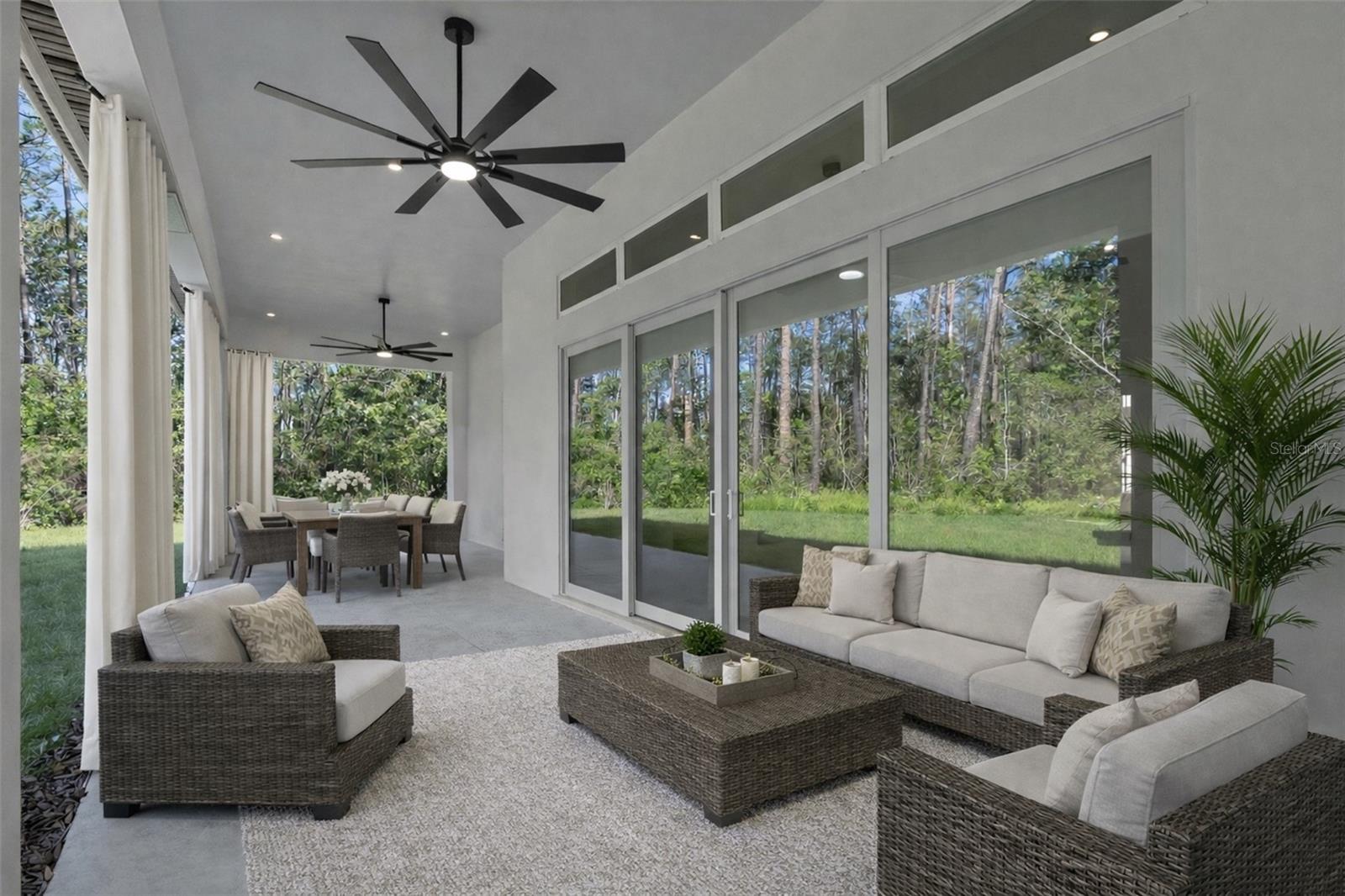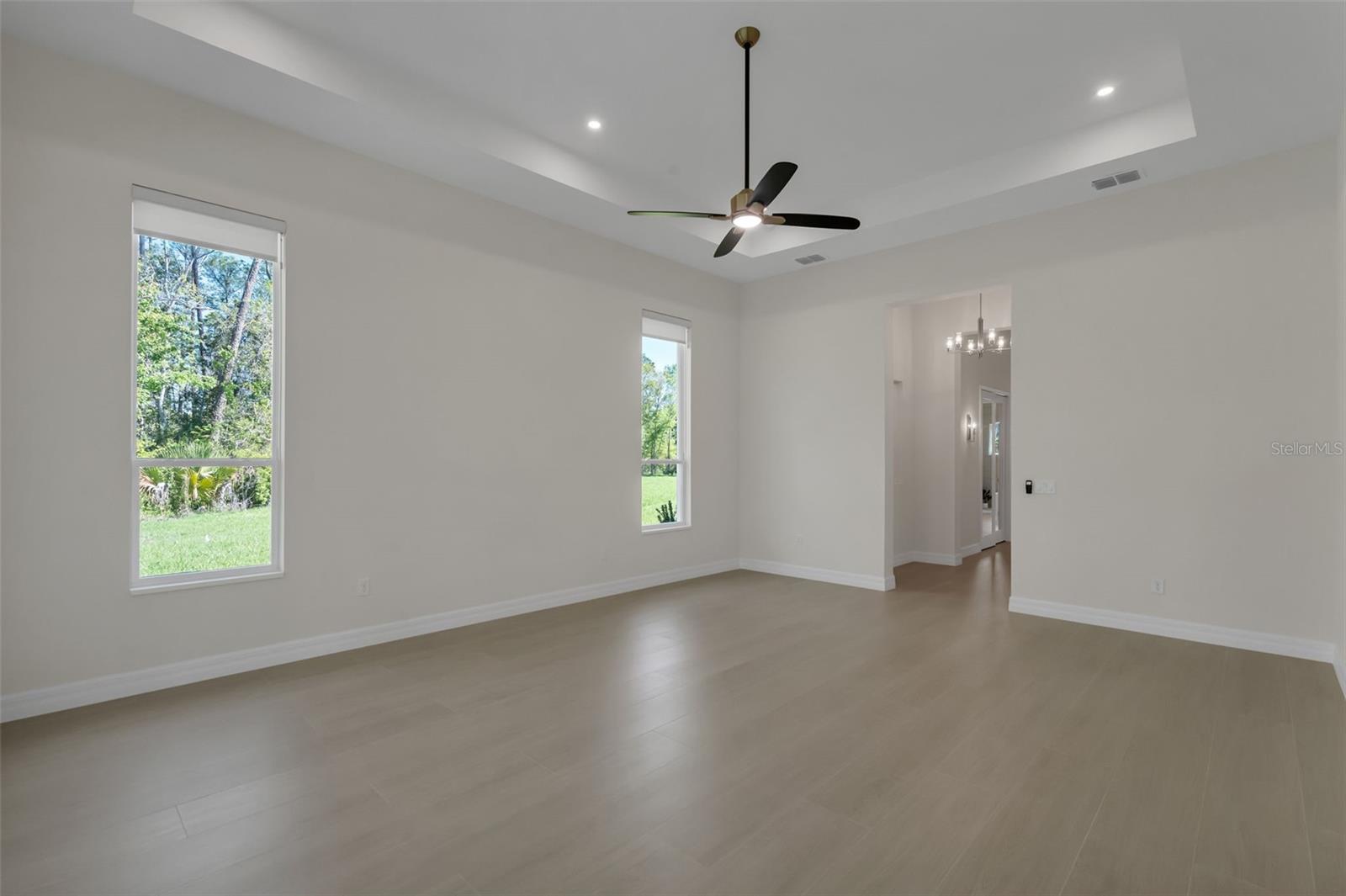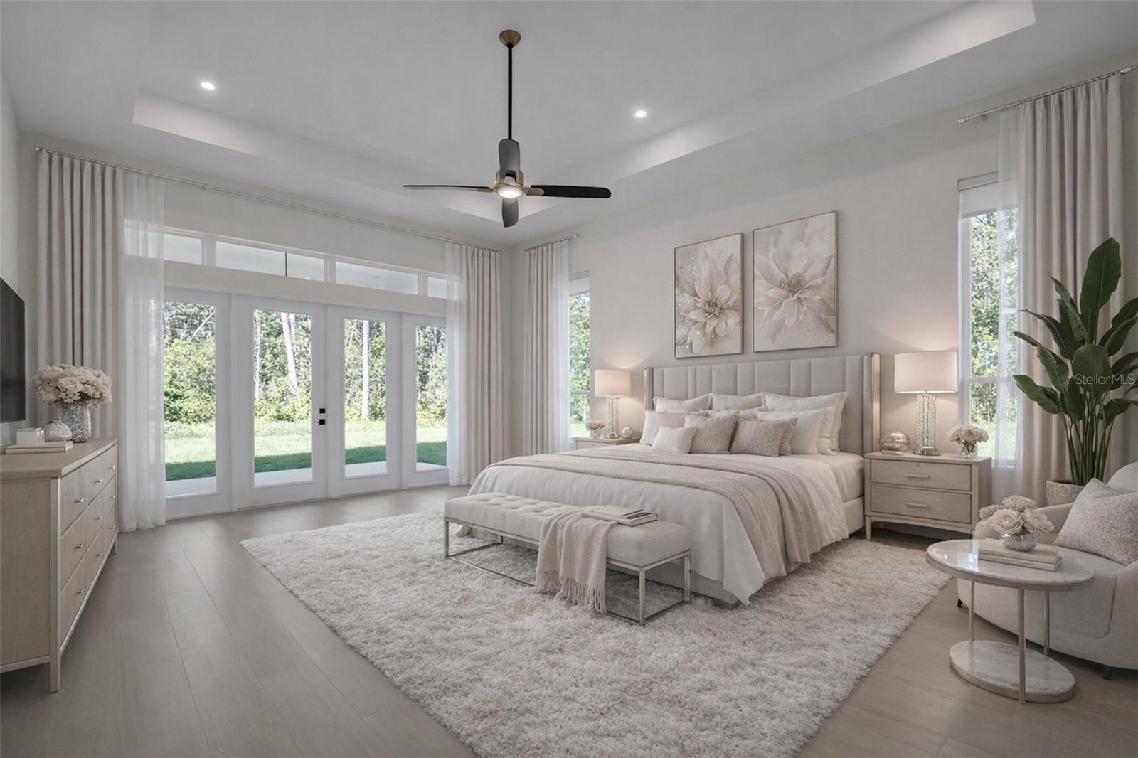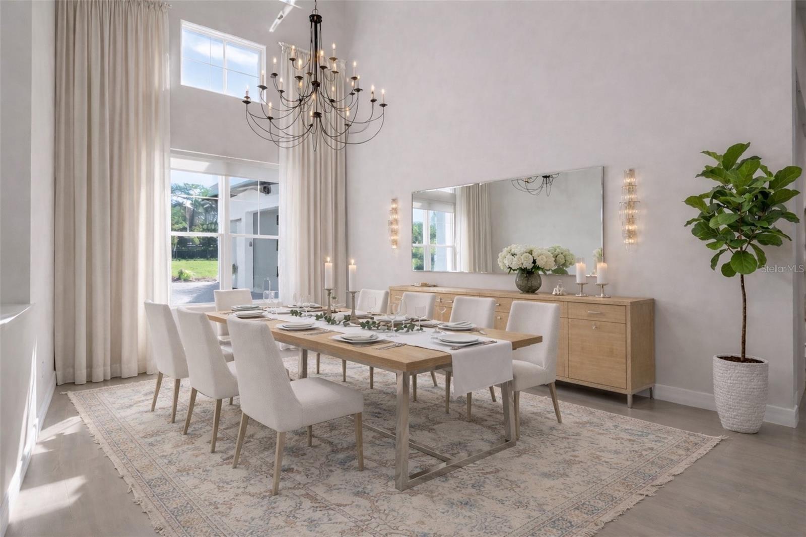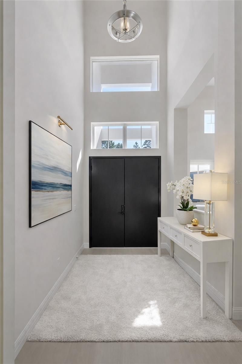 One or more photo(s) has been virtually staged. Brand-new custom-built estate offering 4,179 sq ft of living space (5,558 sq ft under roof) on 5 private acres—never lived in! Ideally located in the sought-after acreage community of Happy Trails, just minutes from Celebration, Reunion, and Walt Disney World, this exceptional property offers the perfect blend of luxury, privacy, and convenience with no HOA restrictions and ample space for horses, recreation, and enjoying your private setting. Step inside to experience impressive architectural design, highlighted by 24-foot coffered ceilings in the grand foyer and formal dining room, a vaulted ceiling reaching 14 feet in the main living area, and 12–13 foot ceilings throughout, creating a bright, open, and expansive atmosphere. At the heart of the home is a stunning designer kitchen featuring an oversized island topped with Italian Mona Lisa granite, creating a true centerpiece for entertaining and everyday living. The kitchen is further enhanced by floor-to-ceiling custom cabinetry with illuminated upper display cabinets, a wet bar with wine cooler, and elegant finishes throughout. The open-concept layout flows seamlessly into the main living space, complemented by premium porcelain tile flooring throughout. The spacious living area features a modern electric fireplace with mantel surround, beautifully complemented by custom built-in cabinetry and designer wall shelving, adding warmth and architectural elegance to the space. The thoughtfully designed floor plan includes a central living area with a kitchen/family room combo and a desirable split-bedroom layout for added privacy. The luxurious primary suite is a true retreat, featuring an elegant double-door entry and dual oversized walk-in closets, including a custom “hers” closet measuring approximately 20’8” x 5’6” and a generous “his” closet at 13’8” x 5’8”, both designed with quality wood shelving and mirrored sliding doors. Additional highlights include Energy Star® certified windows, step-free access throughout, and a beautifully finished paver driveway, walkways, and outdoor living areas. The home is also equipped with a private well system, providing a reliable water source and eliminating monthly water utility costs. This rare 5-acre estate offers exceptional privacy and space while being conveniently located near world-class dining, shopping, and entertainment.