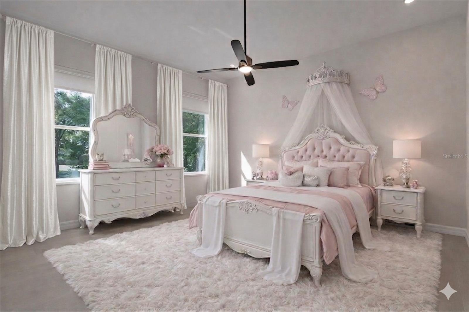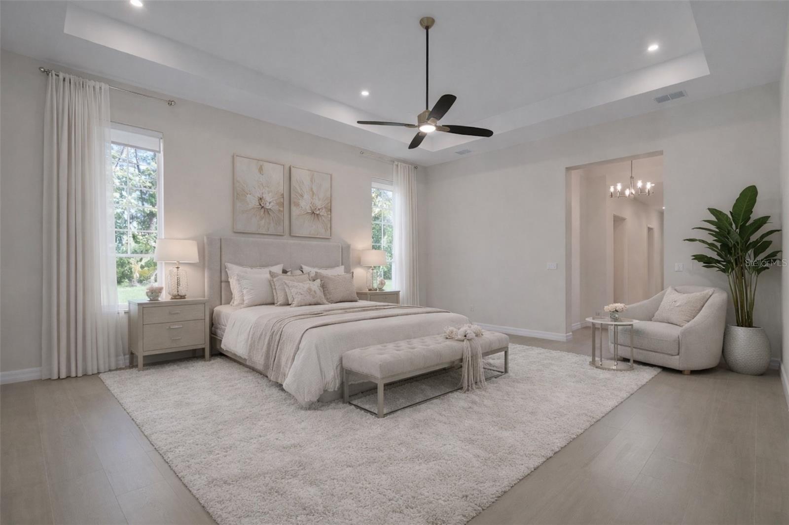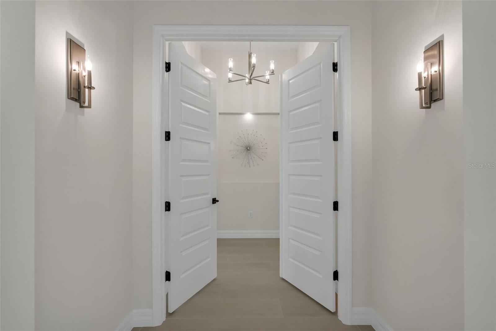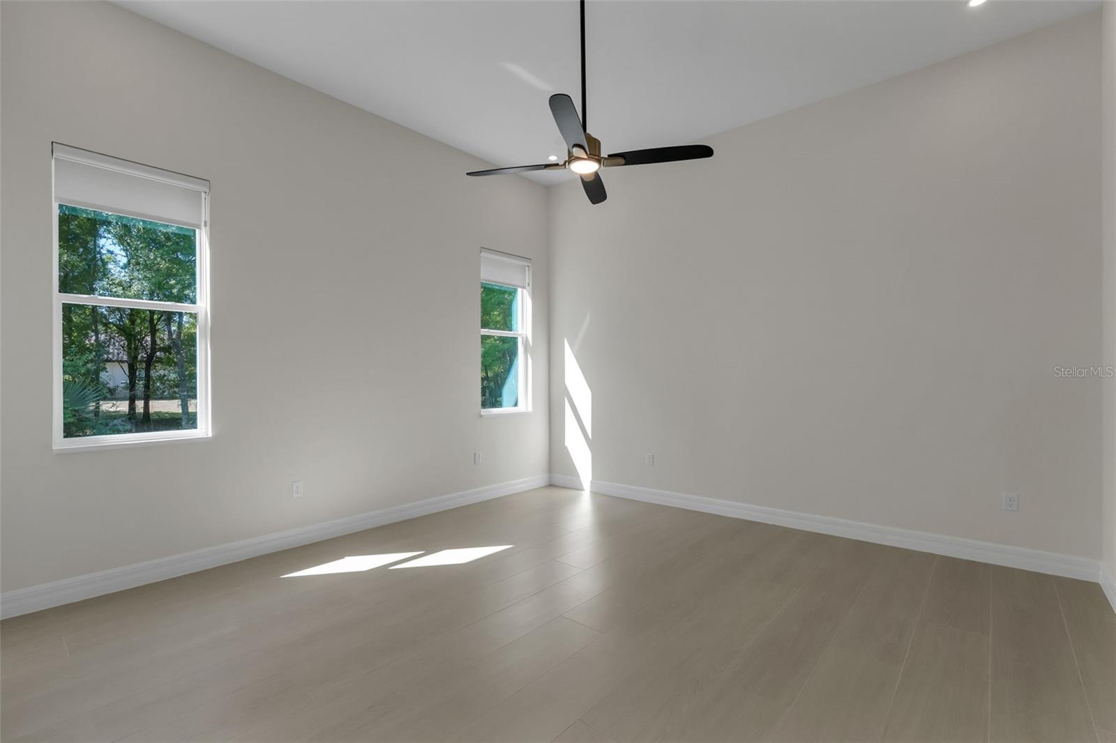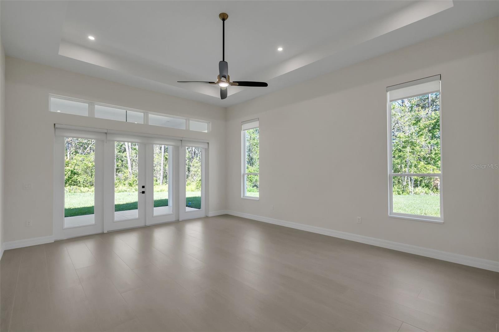 One or more photo(s) has been virtually staged. Brand-new custom-built estate offering 4,179 sq ft of living space (5,558 sq ft under roof) on 5 private acres—never lived in! Ideally located in the sought-after acreage community of Happy Trails, just minutes from Celebration, Reunion, and Walt Disney World, this exceptional property offers the perfect blend of luxury, privacy, and convenience with no HOA restrictions and ample space for horses, recreation, and enjoying your private setting. Step inside to experience impressive architectural design, highlighted by 24-foot coffered ceilings in the grand foyer and formal dining room, a vaulted ceiling reaching 14 feet in the main living area, and 12–13 foot ceilings throughout, creating a bright, open, and expansive atmosphere. At the heart of the home is a stunning designer kitchen featuring an oversized island topped with Italian Mona Lisa granite, creating a true centerpiece for entertaining and everyday living. The kitchen is further enhanced by floor-to-ceiling custom cabinetry with illuminated upper display cabinets, a wet bar with wine cooler, and elegant finishes throughout. The open-concept layout flows seamlessly into the main living space, complemented by premium porcelain tile flooring throughout. The spacious living area features a modern electric fireplace with mantel surround, beautifully complemented by custom built-in cabinetry and designer wall shelving, adding warmth and architectural elegance to the space. The thoughtfully designed floor plan includes a central living area with a kitchen/family room combo and a desirable split-bedroom layout for added privacy. The luxurious primary suite is a true retreat, featuring an elegant double-door entry and dual oversized walk-in closets, including a custom “hers” closet measuring approximately 20’8” x 5’6” and a generous “his” closet at 13’8” x 5’8”, both designed with quality wood shelving and mirrored sliding doors. Additional highlights include Energy Star® certified windows, step-free access throughout, and a beautifully finished paver driveway, walkways, and outdoor living areas. The home is also equipped with a private well system, providing a reliable water source and eliminating monthly water utility costs. This rare 5-acre estate offers exceptional privacy and space while being conveniently located near world-class dining, shopping, and entertainment.