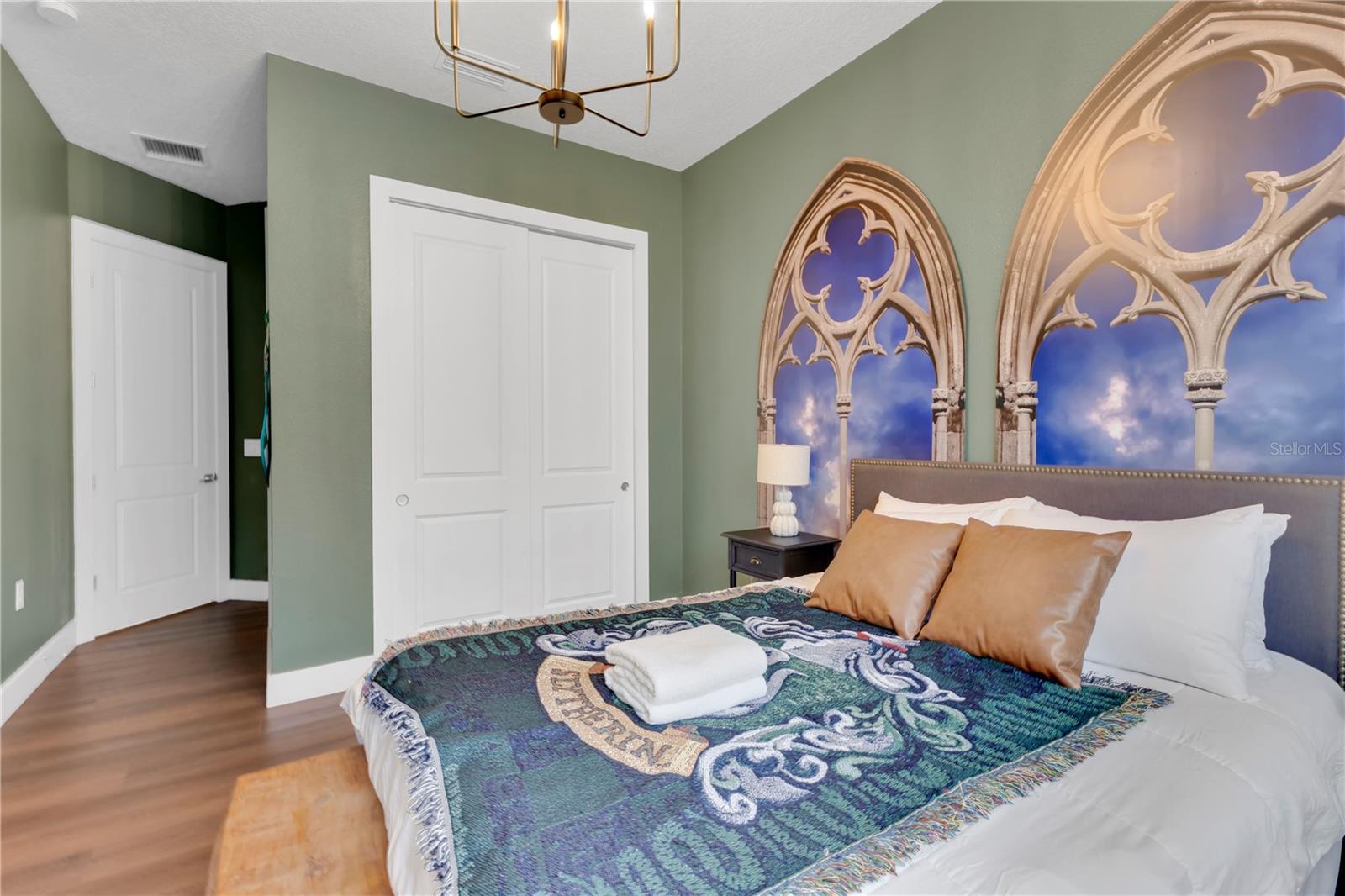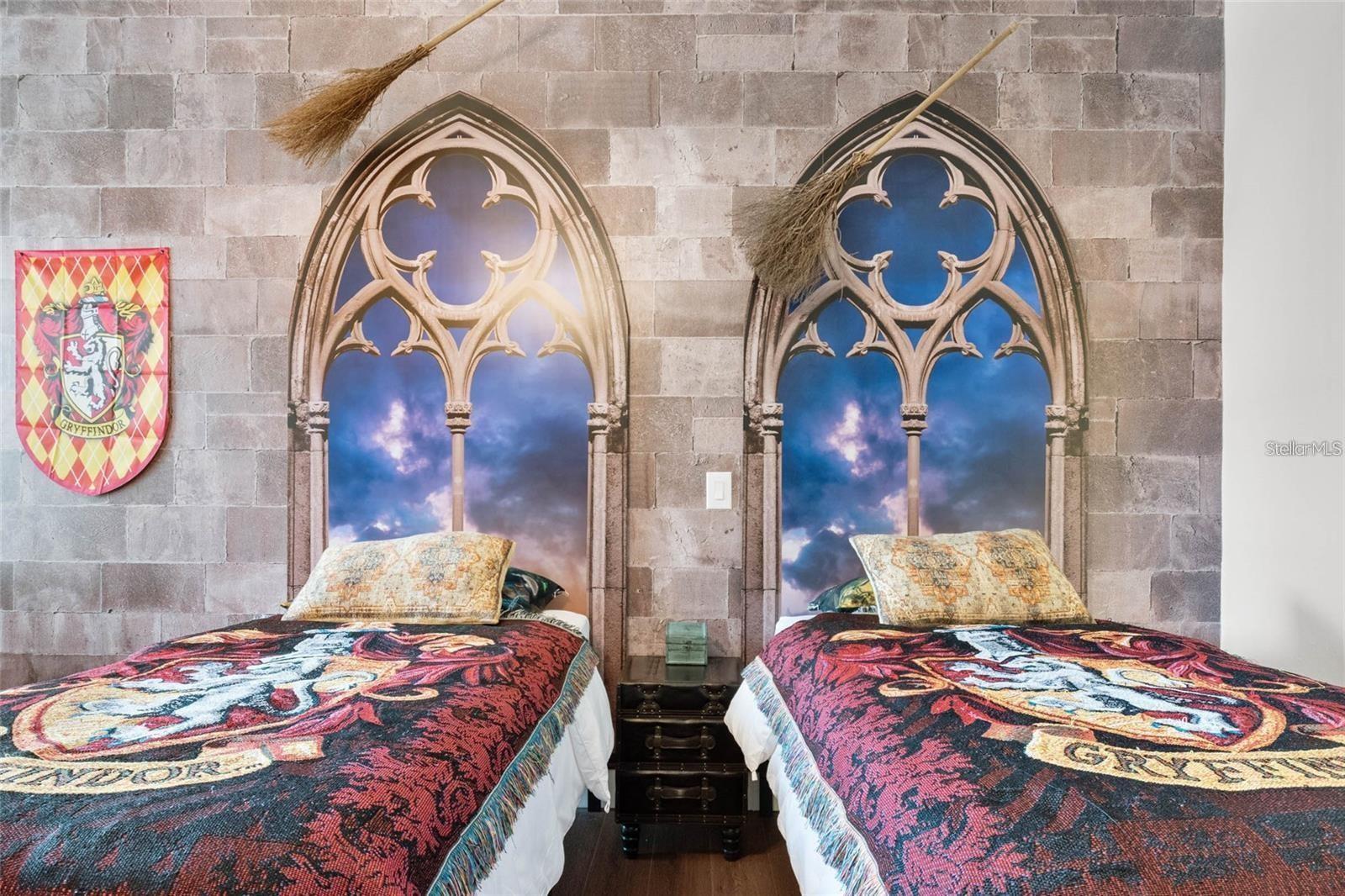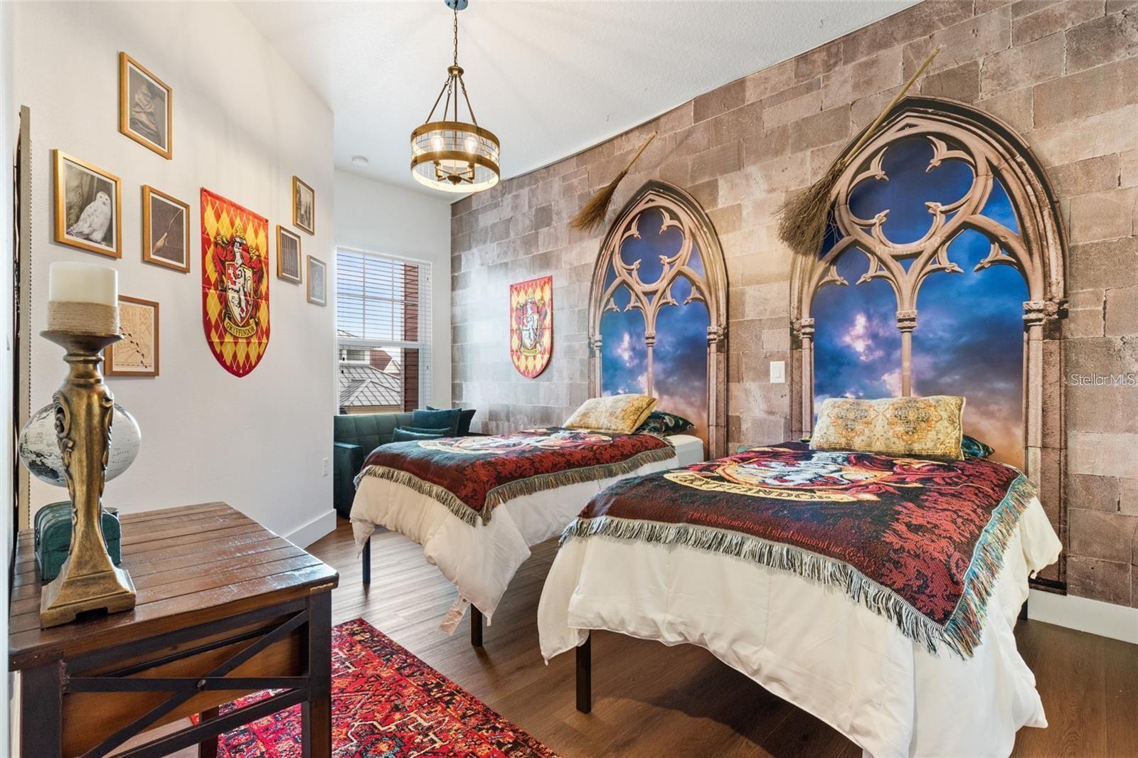 Turnkey short term rental, fully furnished, fully themed, and already booked. Walk in, take over the calendar, keep the income going. Four bedrooms, four and a half baths, every room pulled into one wizarding world. Cathedral window murals, house banners, potion shelves, and details guests will photograph from the second they walk in. This is not a townhome with theming, it is an experience guests book specifically to stay in. The main level is built for groups. Open kitchen with a large center island, bar seating for six, a dining table that handles the whole party, and a living room that flows straight into the outdoor space. Out back, a private paver patio with a full outdoor kitchen, grill, and dining setup under a shade tree. This is where the five star reviews come from. Rare for a townhome, the main floor primary suite is a booking magnet for groups that need single level access; the kind of detail guests filter for. A half bath off the main living area keeps the bedrooms private. Upstairs, every bedroom has its own dedicated bath. No one is negotiating over showers, no one is waiting in line. Summerville Resort is gated, zoned for short term rental, and loaded with amenities guests expect. Resort style pool and spa, fitness center, clubhouse, and a game room with foosball. Minutes to the theme parks, shopping, dining, and easy access to the highway. HOA covers cable, internet, trash, pool, grounds, and exterior maintenance, so the operating side stays clean. Sold fully furnished with existing bookings in place. Turnkey, producing, ready for the next owner to step in.