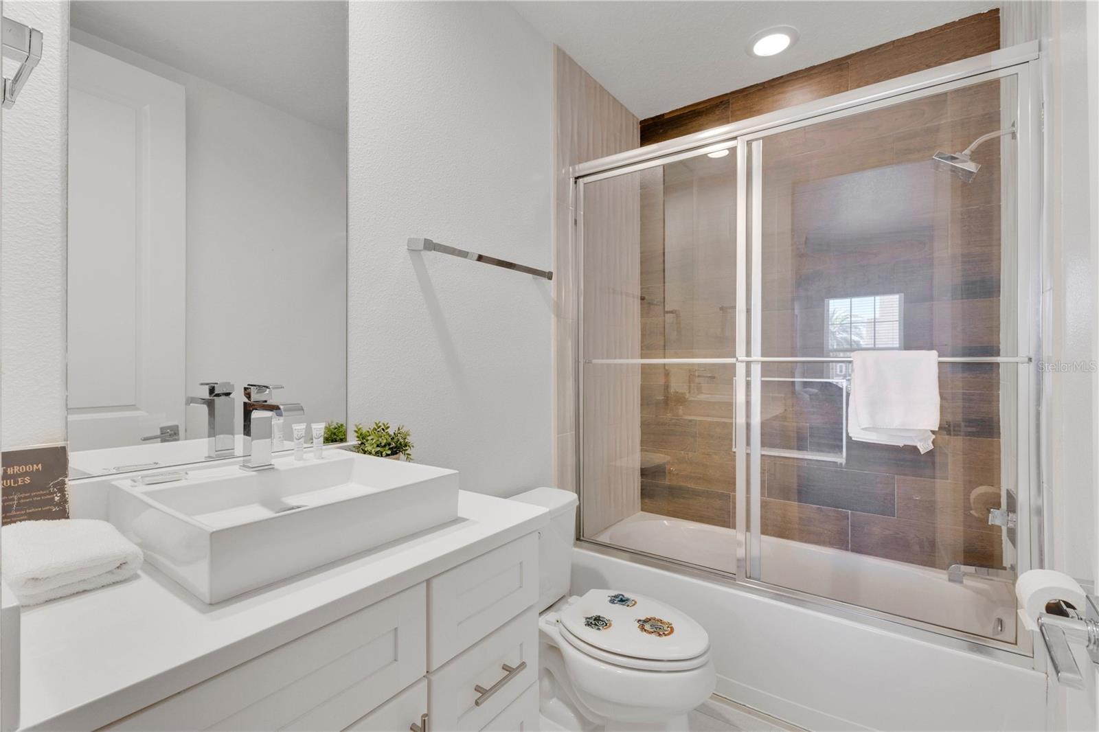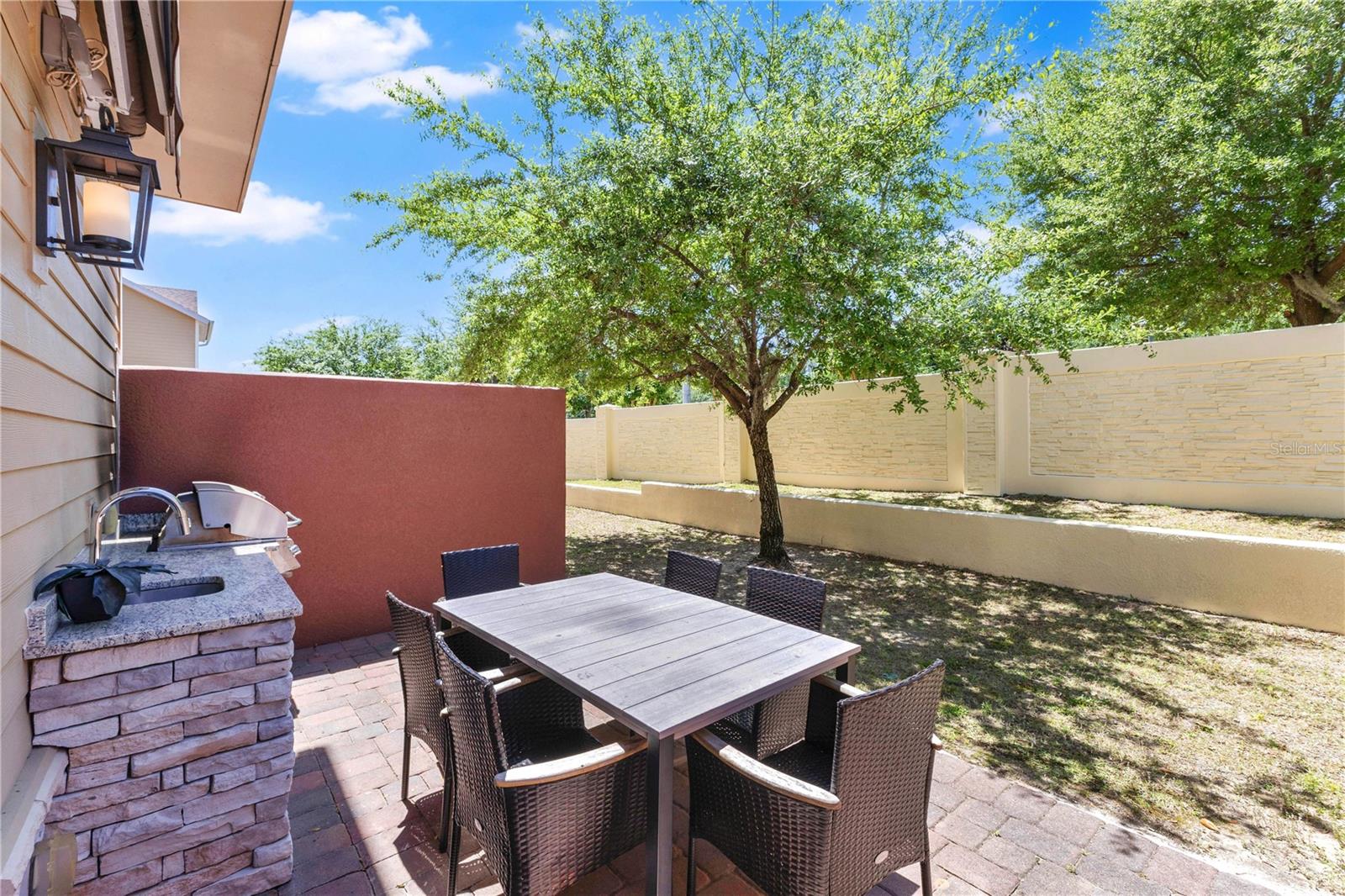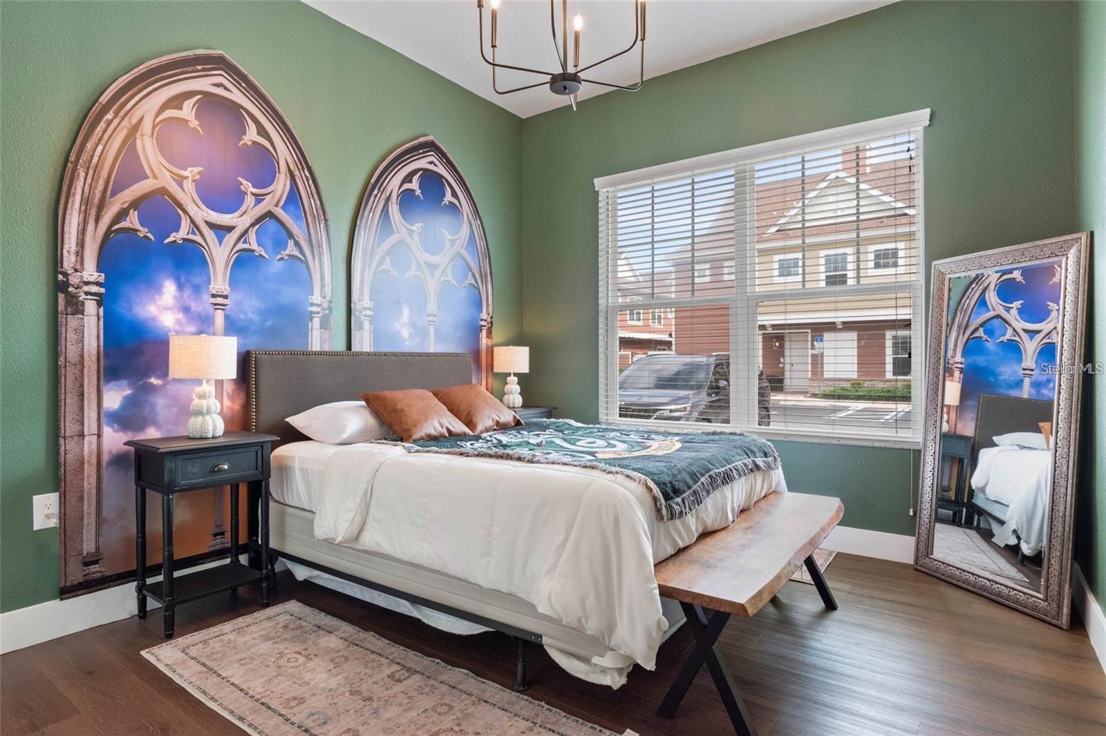 Turnkey short term rental, fully furnished, fully themed, and already booked. Walk in, take over the calendar, keep the income going. Four bedrooms, four and a half baths, every room pulled into one wizarding world. Cathedral window murals, house banners, potion shelves, and details guests will photograph from the second they walk in. This is not a townhome with theming, it is an experience guests book specifically to stay in. The main level is built for groups. Open kitchen with a large center island, bar seating for six, a dining table that handles the whole party, and a living room that flows straight into the outdoor space. Out back, a private paver patio with a full outdoor kitchen, grill, and dining setup under a shade tree. This is where the five star reviews come from. Rare for a townhome, the main floor primary suite is a booking magnet for groups that need single level access; the kind of detail guests filter for. A half bath off the main living area keeps the bedrooms private. Upstairs, every bedroom has its own dedicated bath. No one is negotiating over showers, no one is waiting in line. Summerville Resort is gated, zoned for short term rental, and loaded with amenities guests expect. Resort style pool and spa, fitness center, clubhouse, and a game room with foosball. Minutes to the theme parks, shopping, dining, and easy access to the highway. HOA covers cable, internet, trash, pool, grounds, and exterior maintenance, so the operating side stays clean. Sold fully furnished with existing bookings in place. Turnkey, producing, ready for the next owner to step in.