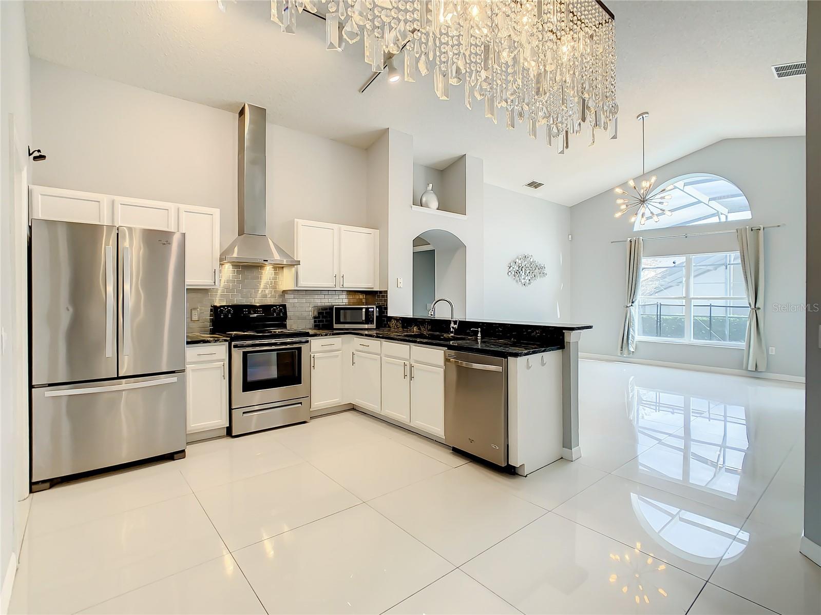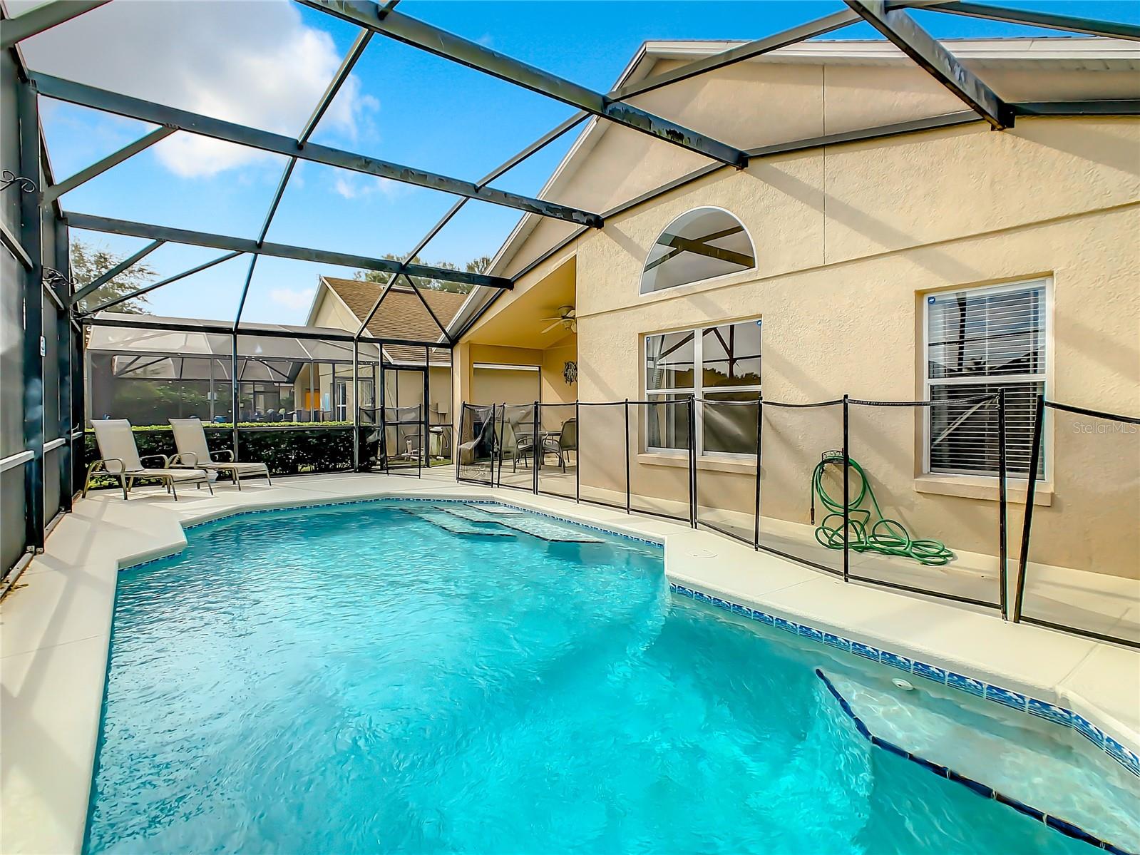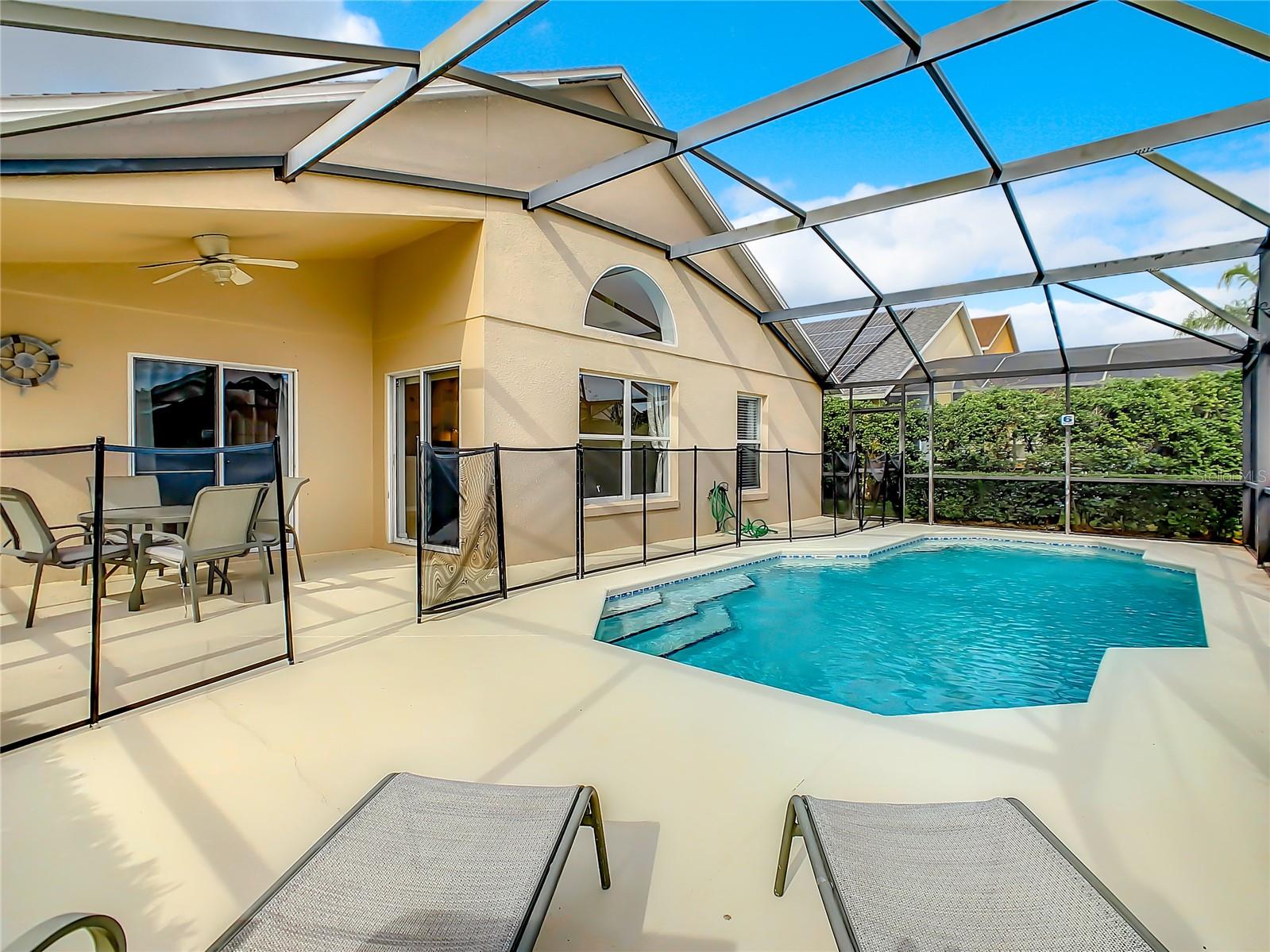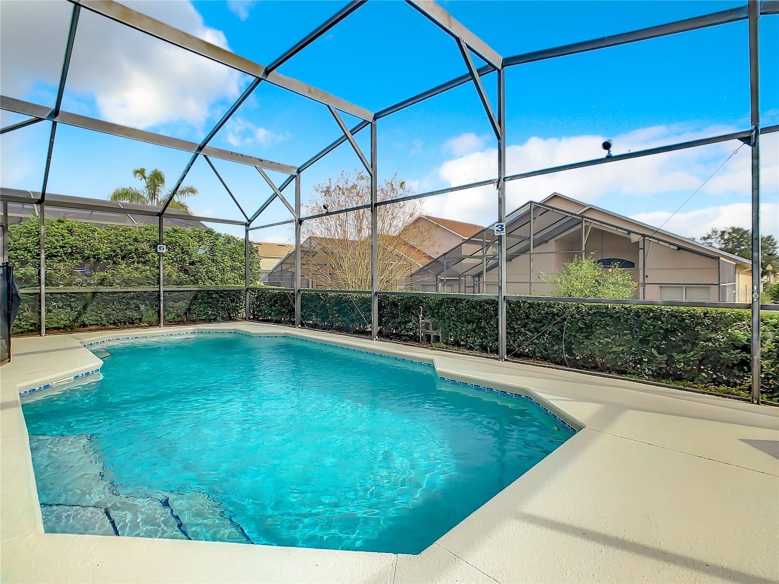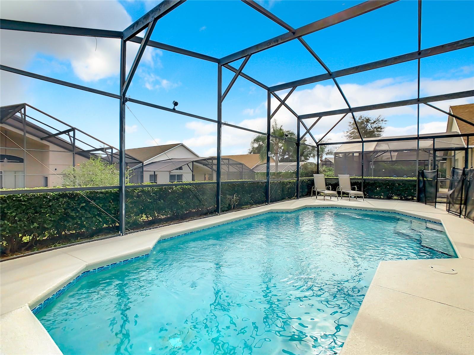 One or more photo(s) has been virtually staged. Meticulously maintained and updated pool home showcases Florida living at its finest. With a new roof in 2017, new hot water heater in 2018 and a new high efficiency Trane A/C unit with heat pump in 2023 this residence boasts an array of high-quality upgrades and a prime location in proximity to the renowned Disney Parks, upscale shopping, and exquisite dining experiences. Step inside to discover a thoughtfully designed floor plan that harmoniously combines modern elegance with functionality. Vaulted ceilings seamlessly connecting open living spaces, ideal for both everyday family life and the potential for a lucrative vacation rental venture. As you enter, be greeted by the sophisticated allure of high-polished 36x36 Kertiles porcelain tile flooring that adorns the spacious foyer, dining room, kitchen, and family room, setting a tone of refined luxury. The intelligently crafted split floor plan offers privacy and convenience, featuring two bedrooms with en-suite bathrooms—one situated at the front and the other at the rear. Newly installed plush carpeting graces all four bedrooms, enhancing comfort and style. The fully renovated kitchen showcases contemporary upgrades. Dark Brazilian granite countertops complement the stylish backsplash, harmonizing flawlessly with stainless steel Cavaliere range hood and Whirlpool appliances, including a French door refrigerator. The kitchen exudes modernity with new cabinet hardware, a pull-down spray Moen faucet, and a dark dual sink that adds a touch of sophistication. This home is adorned with chic crystal light fixtures thoughtfully placed throughout, accentuating its inherent beauty. Step outside to the private screened pool area with plenty of space to enjoy the Florida sunshine or relax under the covered patio, complete with a ceiling fan for added comfort, while lush hedges envelop the screen enclosure, providing an extra layer of privacy to enjoy moments of serenity and leisure.