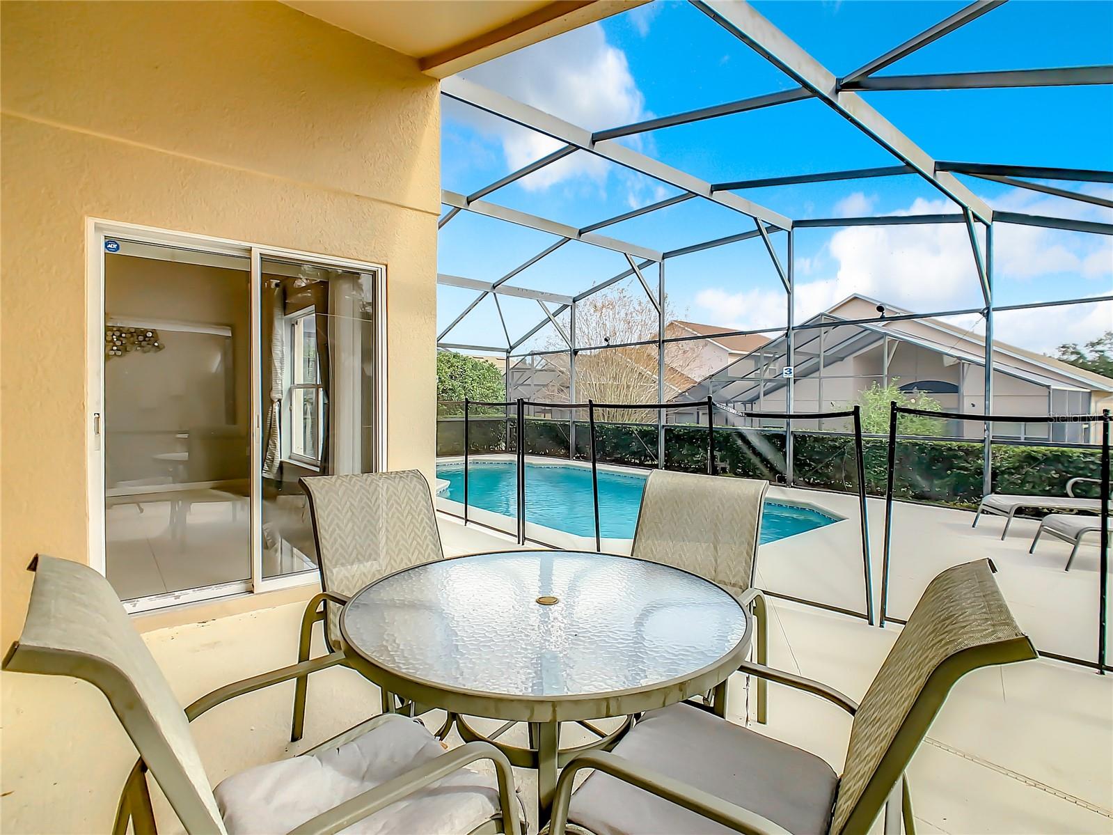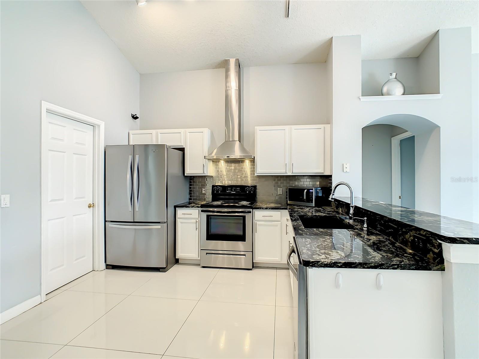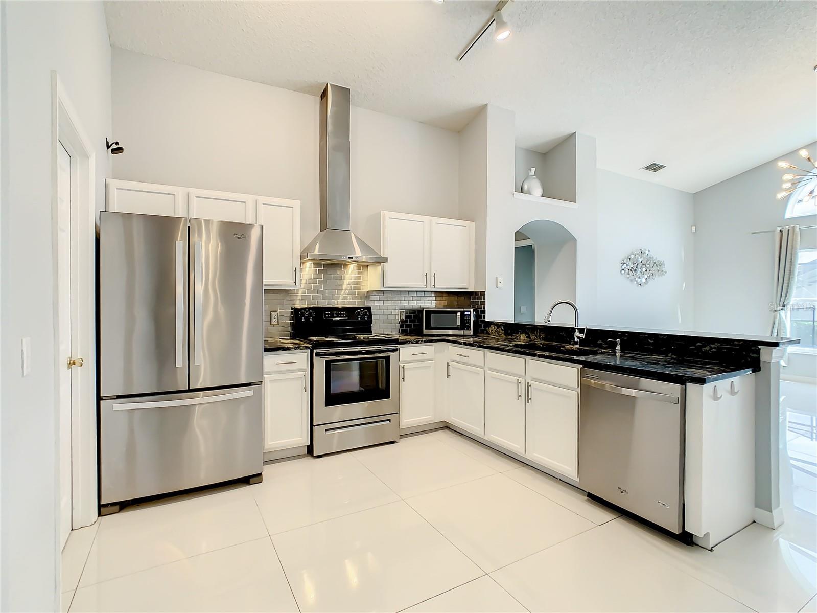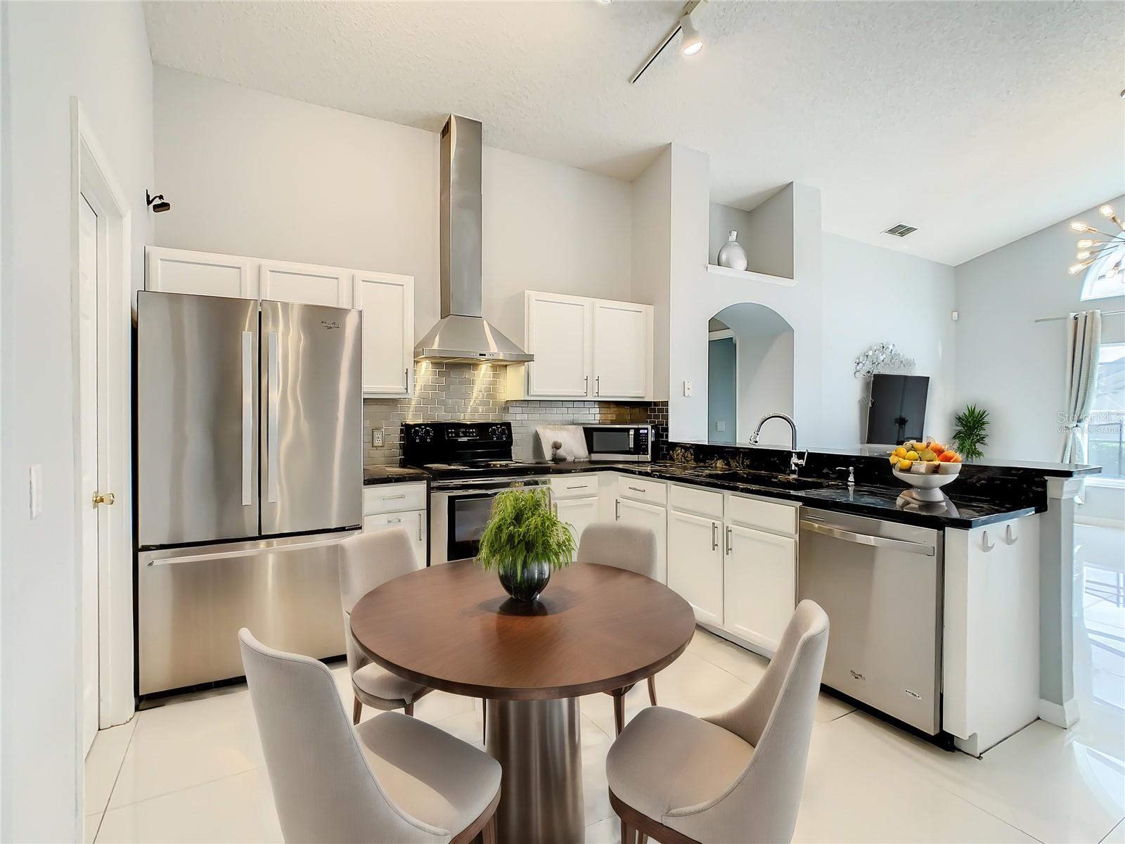 One or more photo(s) has been virtually staged. Meticulously maintained and updated pool home showcases Florida living at its finest. With a new roof in 2017, new hot water heater in 2018 and a new high efficiency Trane A/C unit with heat pump in 2023 this residence boasts an array of high-quality upgrades and a prime location in proximity to the renowned Disney Parks, upscale shopping, and exquisite dining experiences. Step inside to discover a thoughtfully designed floor plan that harmoniously combines modern elegance with functionality. Vaulted ceilings seamlessly connecting open living spaces, ideal for both everyday family life and the potential for a lucrative vacation rental venture. As you enter, be greeted by the sophisticated allure of high-polished 36x36 Kertiles porcelain tile flooring that adorns the spacious foyer, dining room, kitchen, and family room, setting a tone of refined luxury. The intelligently crafted split floor plan offers privacy and convenience, featuring two bedrooms with en-suite bathrooms—one situated at the front and the other at the rear. Newly installed plush carpeting graces all four bedrooms, enhancing comfort and style. The fully renovated kitchen showcases contemporary upgrades. Dark Brazilian granite countertops complement the stylish backsplash, harmonizing flawlessly with stainless steel Cavaliere range hood and Whirlpool appliances, including a French door refrigerator. The kitchen exudes modernity with new cabinet hardware, a pull-down spray Moen faucet, and a dark dual sink that adds a touch of sophistication. This home is adorned with chic crystal light fixtures thoughtfully placed throughout, accentuating its inherent beauty. Step outside to the private screened pool area with plenty of space to enjoy the Florida sunshine or relax under the covered patio, complete with a ceiling fan for added comfort, while lush hedges envelop the screen enclosure, providing an extra layer of privacy to enjoy moments of serenity and leisure.