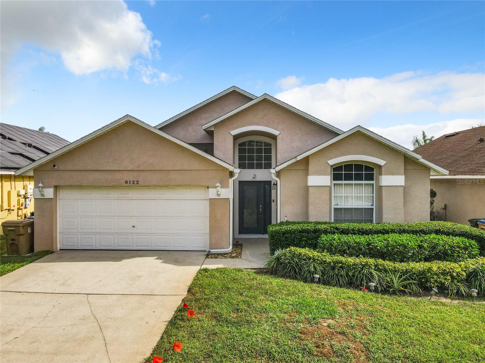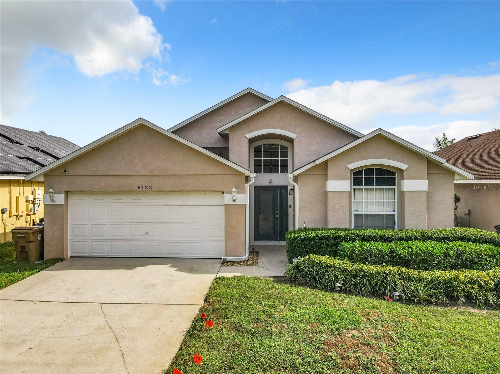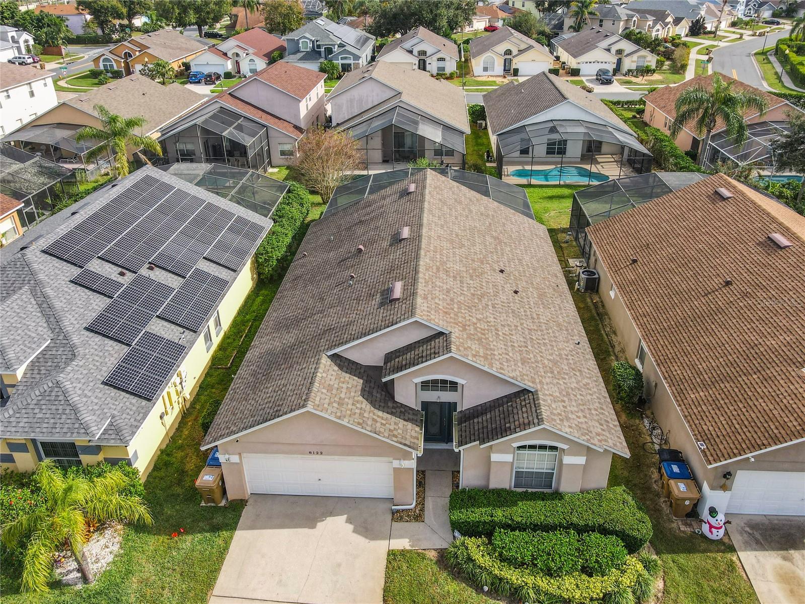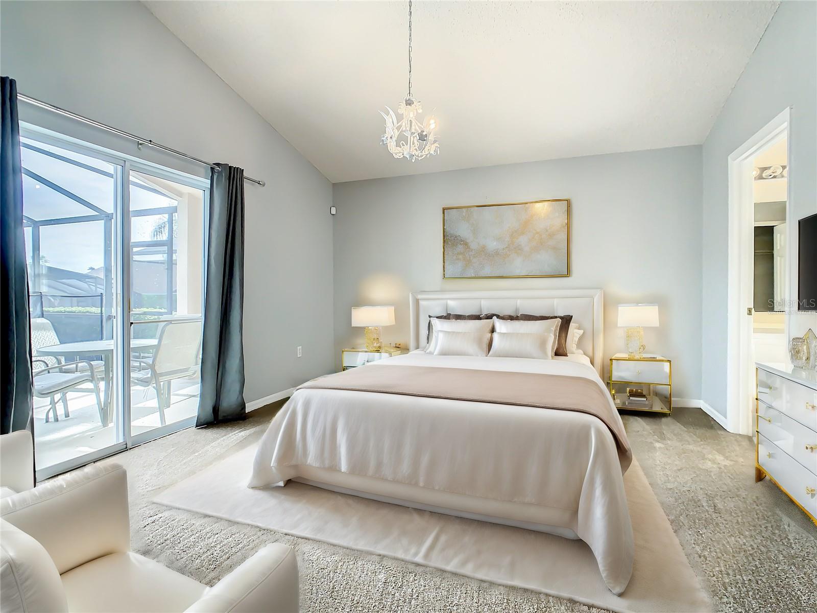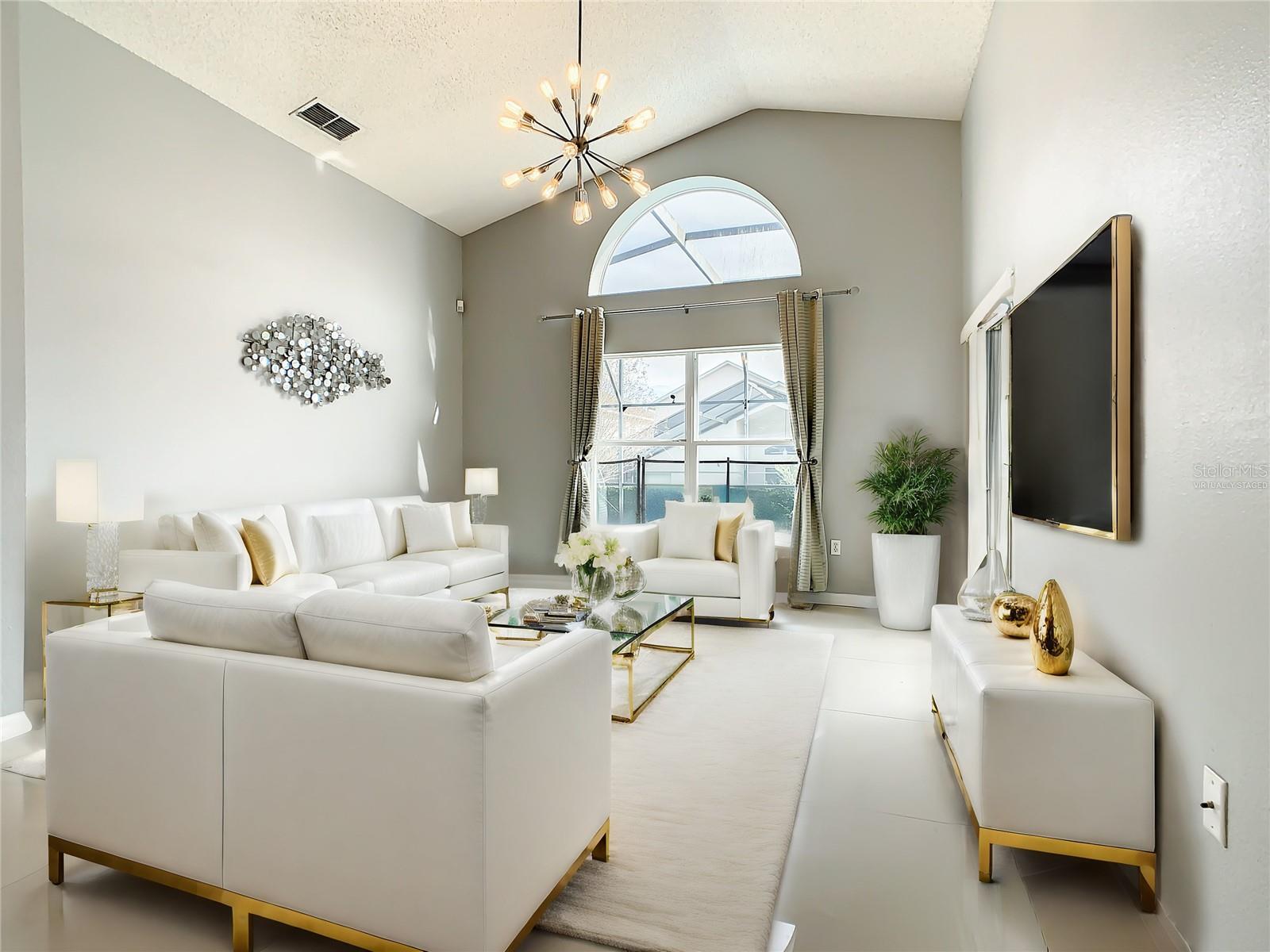 One or more photo(s) has been virtually staged. Meticulously maintained and updated pool home showcases Florida living at its finest. With a new roof in 2017, new hot water heater in 2018 and a new high efficiency Trane A/C unit with heat pump in 2023 this residence boasts an array of high-quality upgrades and a prime location in proximity to the renowned Disney Parks, upscale shopping, and exquisite dining experiences. Step inside to discover a thoughtfully designed floor plan that harmoniously combines modern elegance with functionality. Vaulted ceilings seamlessly connecting open living spaces, ideal for both everyday family life and the potential for a lucrative vacation rental venture. As you enter, be greeted by the sophisticated allure of high-polished 36x36 Kertiles porcelain tile flooring that adorns the spacious foyer, dining room, kitchen, and family room, setting a tone of refined luxury. The intelligently crafted split floor plan offers privacy and convenience, featuring two bedrooms with en-suite bathrooms—one situated at the front and the other at the rear. Newly installed plush carpeting graces all four bedrooms, enhancing comfort and style. The fully renovated kitchen showcases contemporary upgrades. Dark Brazilian granite countertops complement the stylish backsplash, harmonizing flawlessly with stainless steel Cavaliere range hood and Whirlpool appliances, including a French door refrigerator. The kitchen exudes modernity with new cabinet hardware, a pull-down spray Moen faucet, and a dark dual sink that adds a touch of sophistication. This home is adorned with chic crystal light fixtures thoughtfully placed throughout, accentuating its inherent beauty. Step outside to the private screened pool area with plenty of space to enjoy the Florida sunshine or relax under the covered patio, complete with a ceiling fan for added comfort, while lush hedges envelop the screen enclosure, providing an extra layer of privacy to enjoy moments of serenity and leisure.