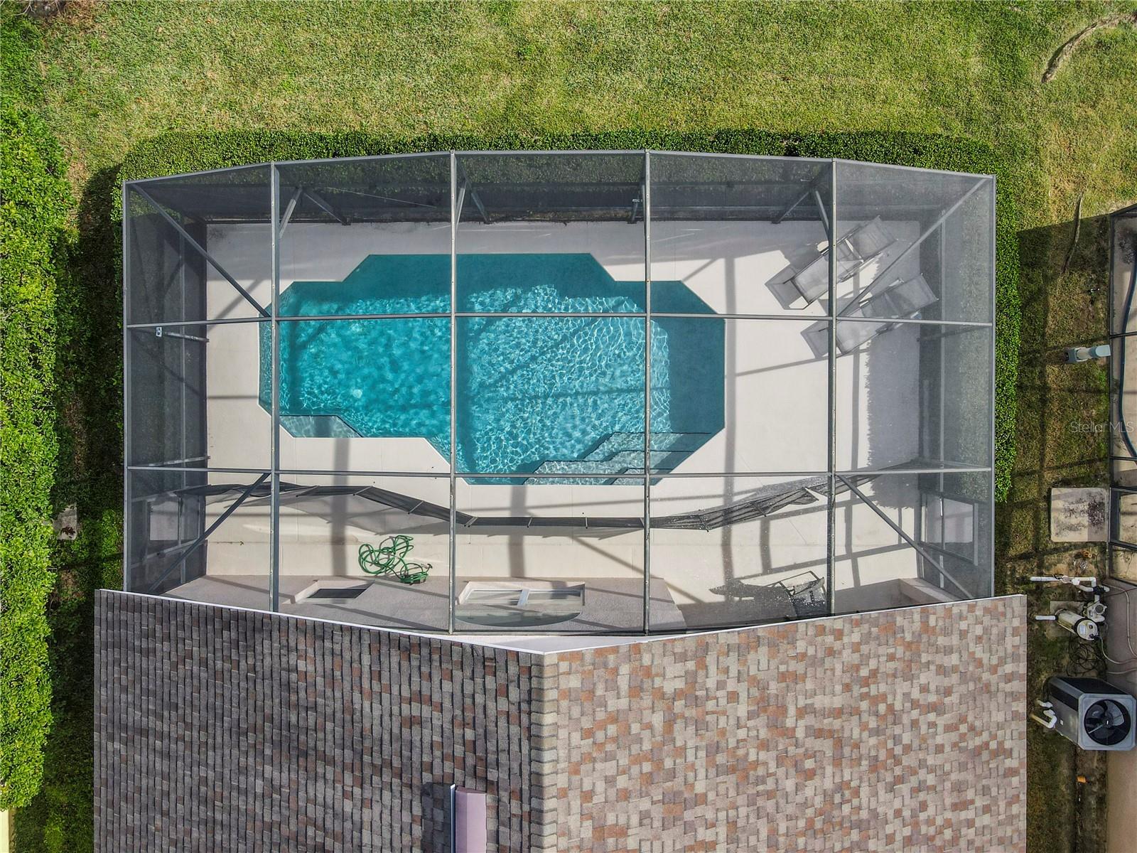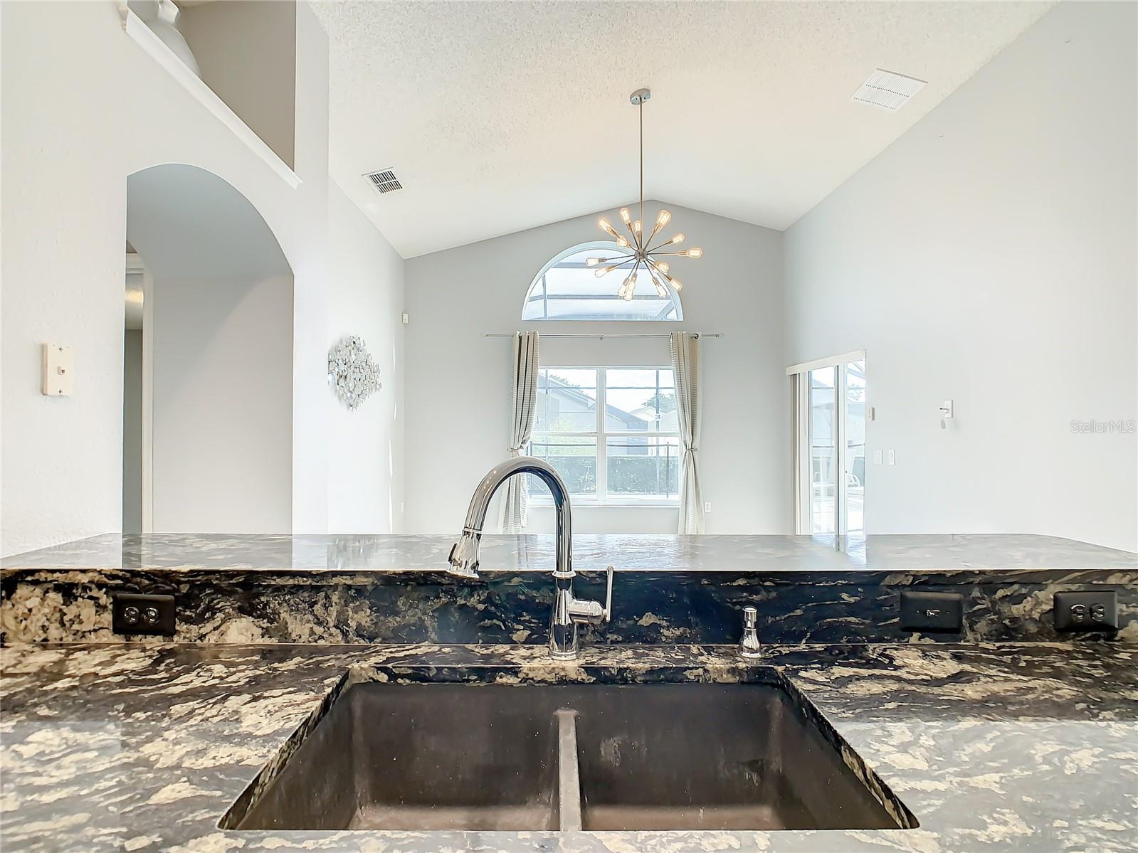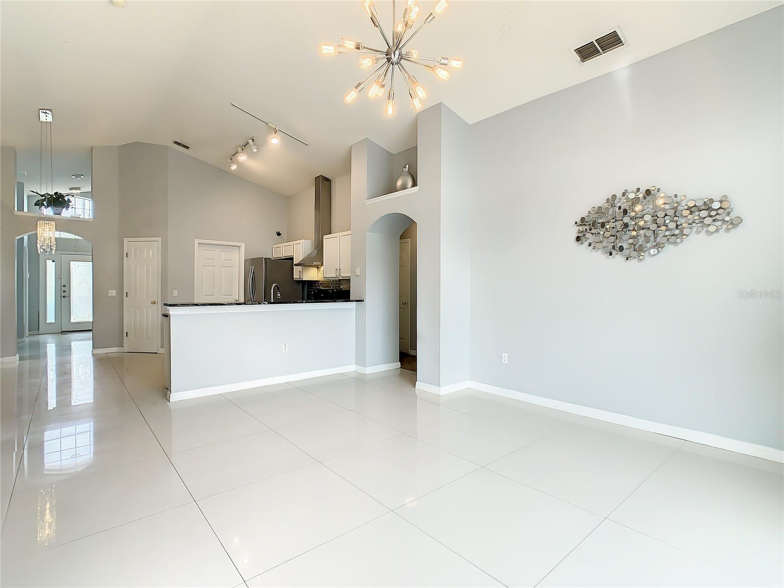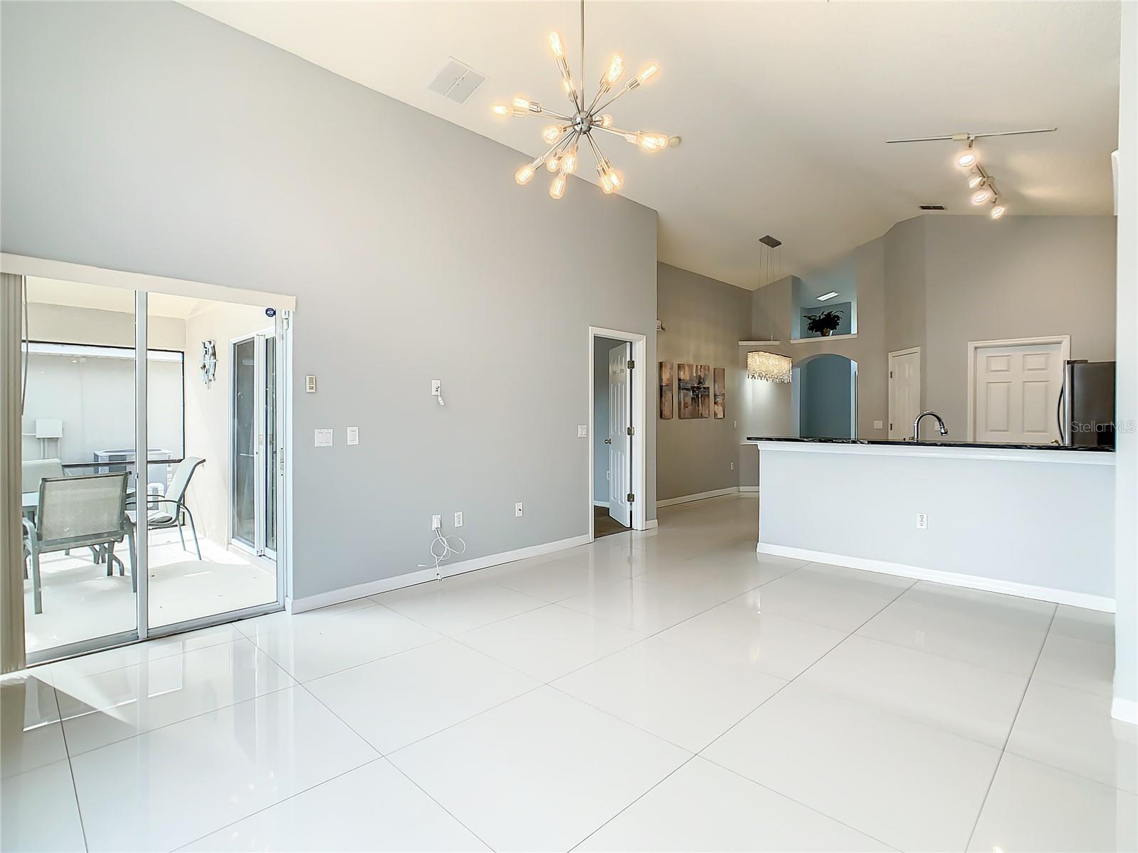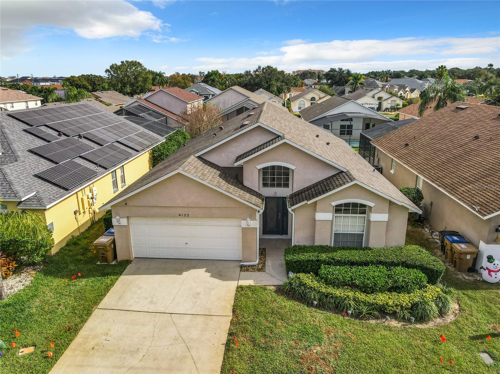 One or more photo(s) has been virtually staged. Meticulously maintained and updated pool home showcases Florida living at its finest. With a new roof in 2017, new hot water heater in 2018 and a new high efficiency Trane A/C unit with heat pump in 2023 this residence boasts an array of high-quality upgrades and a prime location in proximity to the renowned Disney Parks, upscale shopping, and exquisite dining experiences. Step inside to discover a thoughtfully designed floor plan that harmoniously combines modern elegance with functionality. Vaulted ceilings seamlessly connecting open living spaces, ideal for both everyday family life and the potential for a lucrative vacation rental venture. As you enter, be greeted by the sophisticated allure of high-polished 36x36 Kertiles porcelain tile flooring that adorns the spacious foyer, dining room, kitchen, and family room, setting a tone of refined luxury. The intelligently crafted split floor plan offers privacy and convenience, featuring two bedrooms with en-suite bathrooms—one situated at the front and the other at the rear. Newly installed plush carpeting graces all four bedrooms, enhancing comfort and style. The fully renovated kitchen showcases contemporary upgrades. Dark Brazilian granite countertops complement the stylish backsplash, harmonizing flawlessly with stainless steel Cavaliere range hood and Whirlpool appliances, including a French door refrigerator. The kitchen exudes modernity with new cabinet hardware, a pull-down spray Moen faucet, and a dark dual sink that adds a touch of sophistication. This home is adorned with chic crystal light fixtures thoughtfully placed throughout, accentuating its inherent beauty. Step outside to the private screened pool area with plenty of space to enjoy the Florida sunshine or relax under the covered patio, complete with a ceiling fan for added comfort, while lush hedges envelop the screen enclosure, providing an extra layer of privacy to enjoy moments of serenity and leisure.