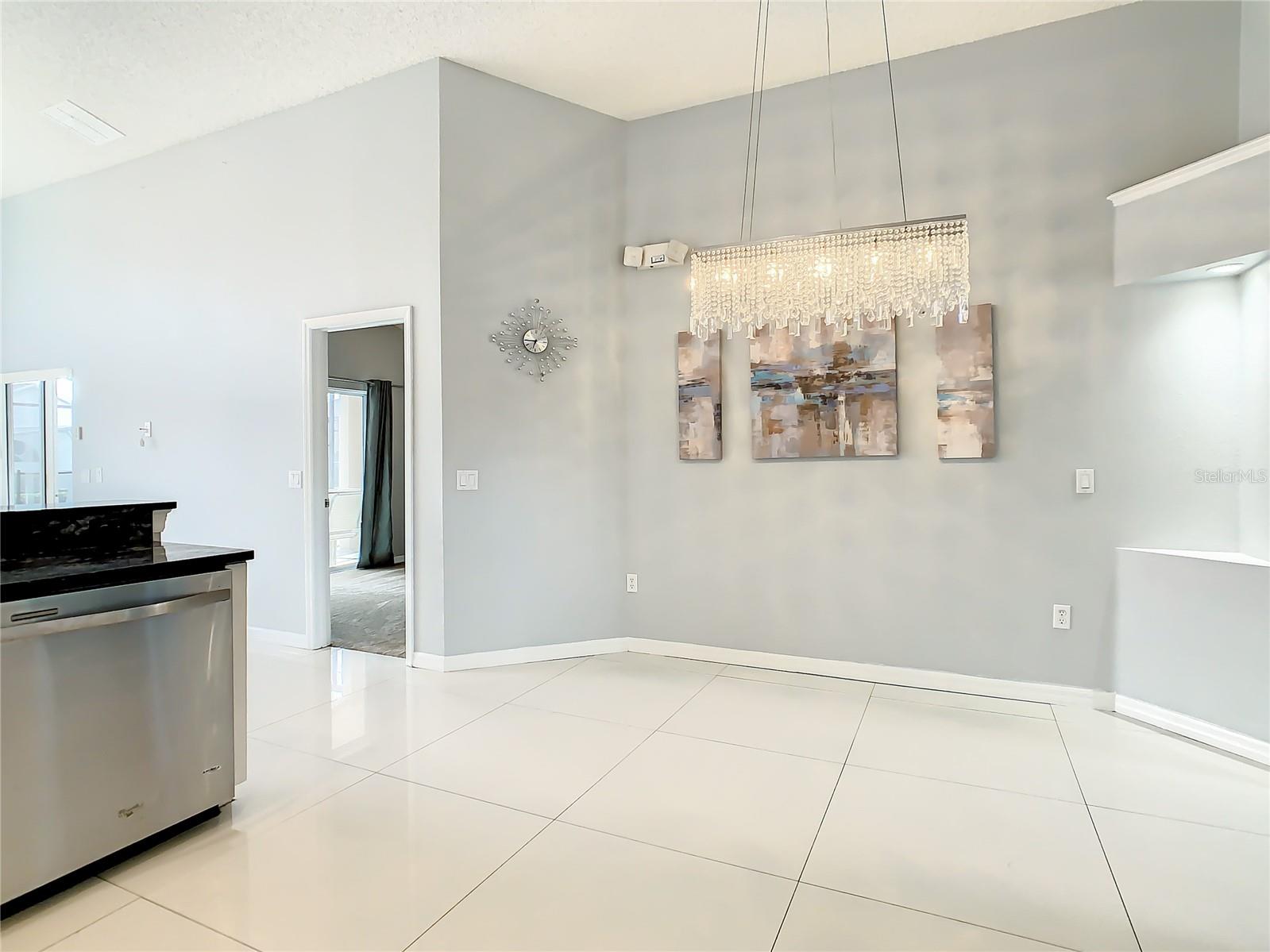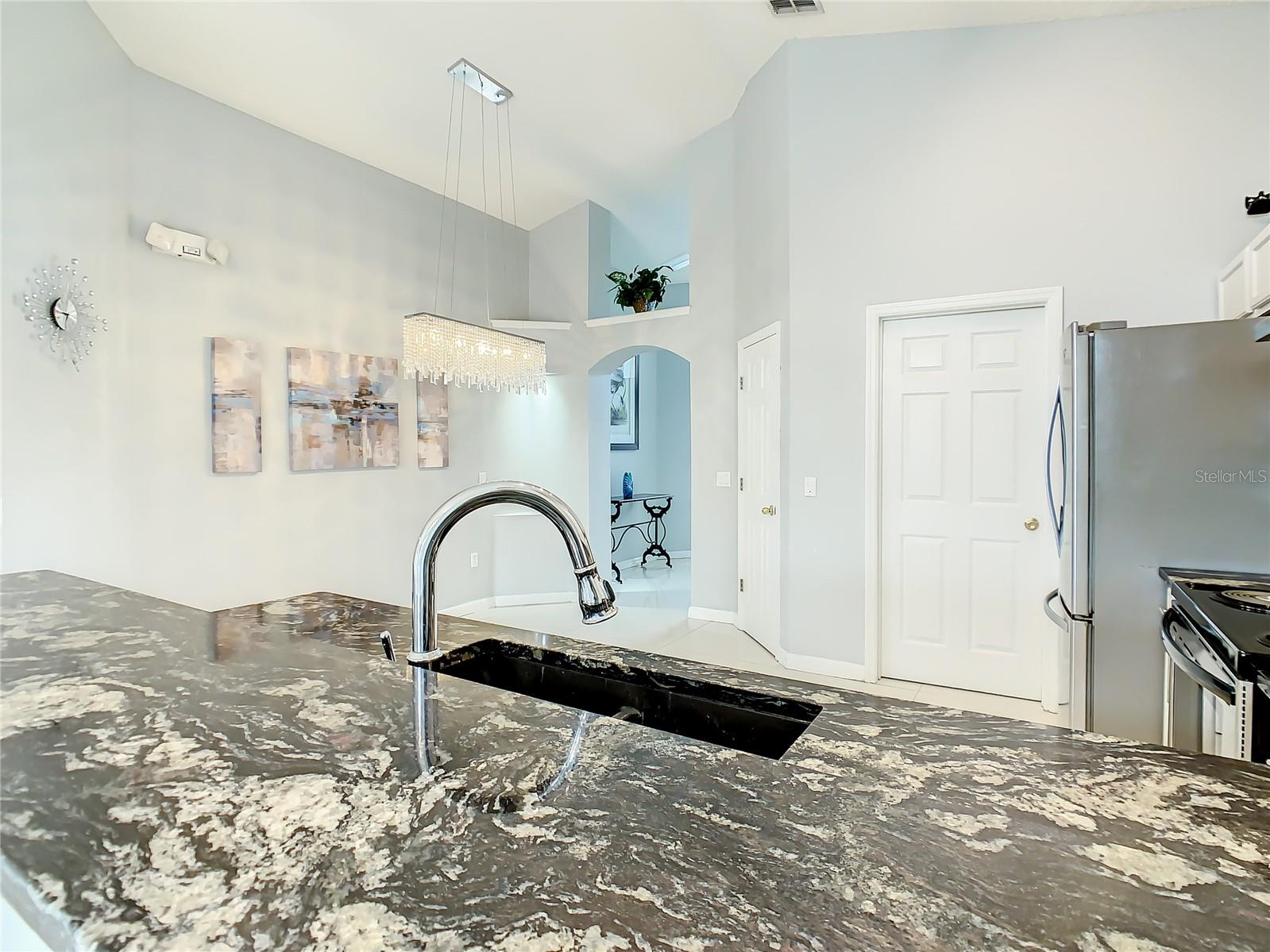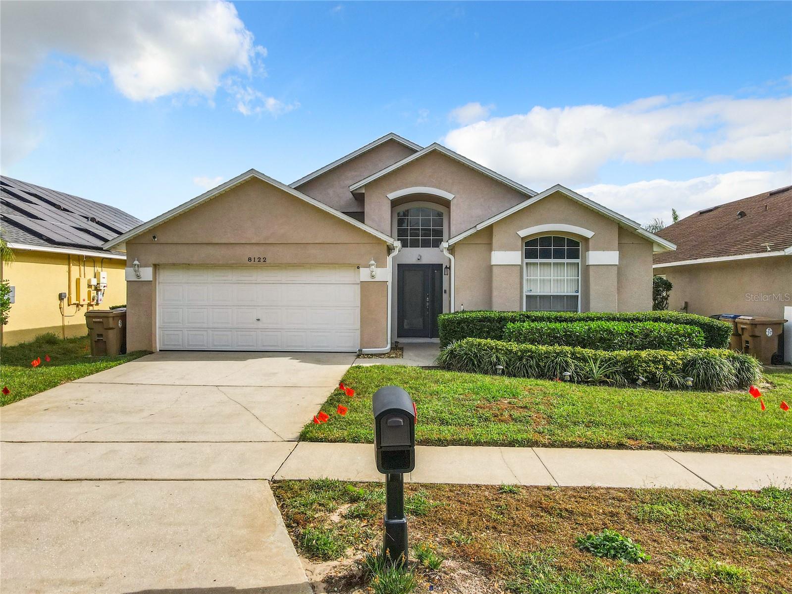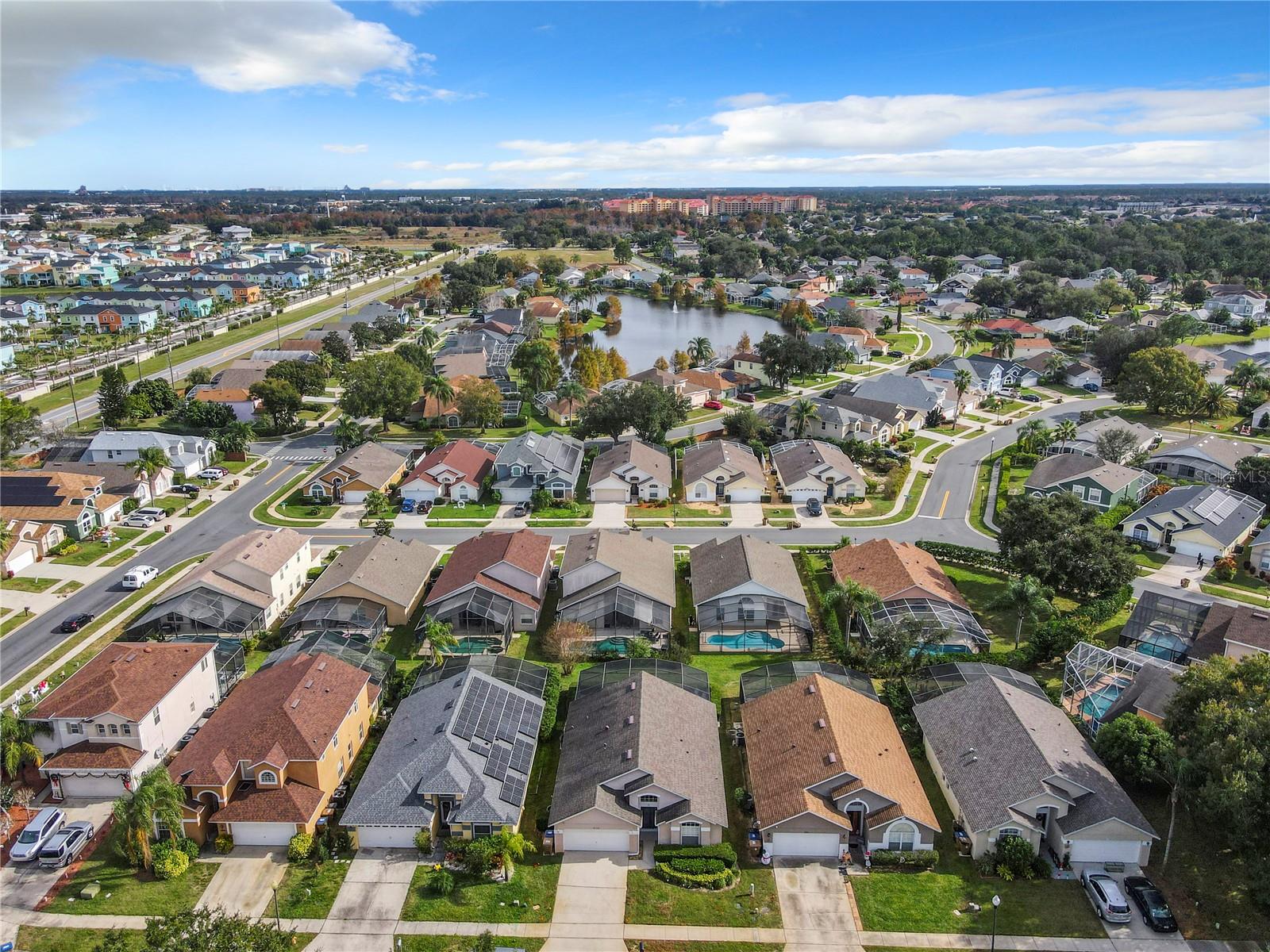 One or more photo(s) has been virtually staged. Meticulously maintained and updated pool home showcases Florida living at its finest. With a new roof in 2017, new hot water heater in 2018 and a new high efficiency Trane A/C unit with heat pump in 2023 this residence boasts an array of high-quality upgrades and a prime location in proximity to the renowned Disney Parks, upscale shopping, and exquisite dining experiences. Step inside to discover a thoughtfully designed floor plan that harmoniously combines modern elegance with functionality. Vaulted ceilings seamlessly connecting open living spaces, ideal for both everyday family life and the potential for a lucrative vacation rental venture. As you enter, be greeted by the sophisticated allure of high-polished 36x36 Kertiles porcelain tile flooring that adorns the spacious foyer, dining room, kitchen, and family room, setting a tone of refined luxury. The intelligently crafted split floor plan offers privacy and convenience, featuring two bedrooms with en-suite bathrooms—one situated at the front and the other at the rear. Newly installed plush carpeting graces all four bedrooms, enhancing comfort and style. The fully renovated kitchen showcases contemporary upgrades. Dark Brazilian granite countertops complement the stylish backsplash, harmonizing flawlessly with stainless steel Cavaliere range hood and Whirlpool appliances, including a French door refrigerator. The kitchen exudes modernity with new cabinet hardware, a pull-down spray Moen faucet, and a dark dual sink that adds a touch of sophistication. This home is adorned with chic crystal light fixtures thoughtfully placed throughout, accentuating its inherent beauty. Step outside to the private screened pool area with plenty of space to enjoy the Florida sunshine or relax under the covered patio, complete with a ceiling fan for added comfort, while lush hedges envelop the screen enclosure, providing an extra layer of privacy to enjoy moments of serenity and leisure.