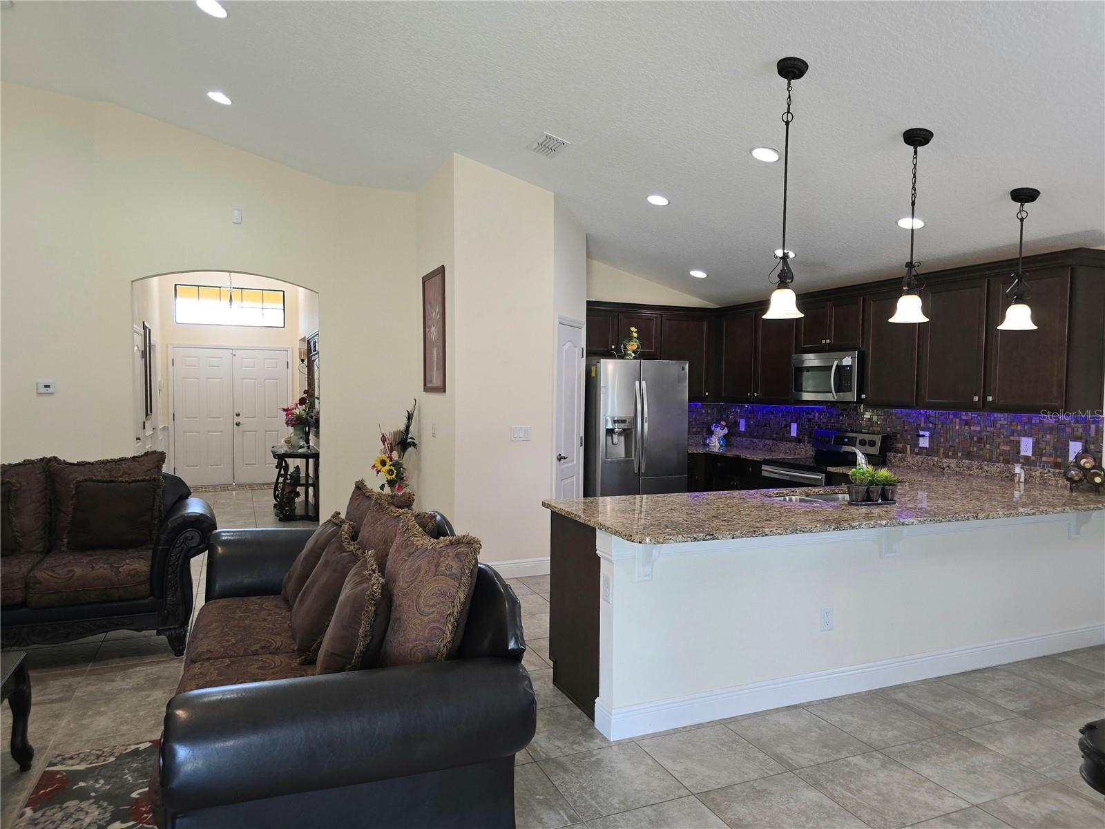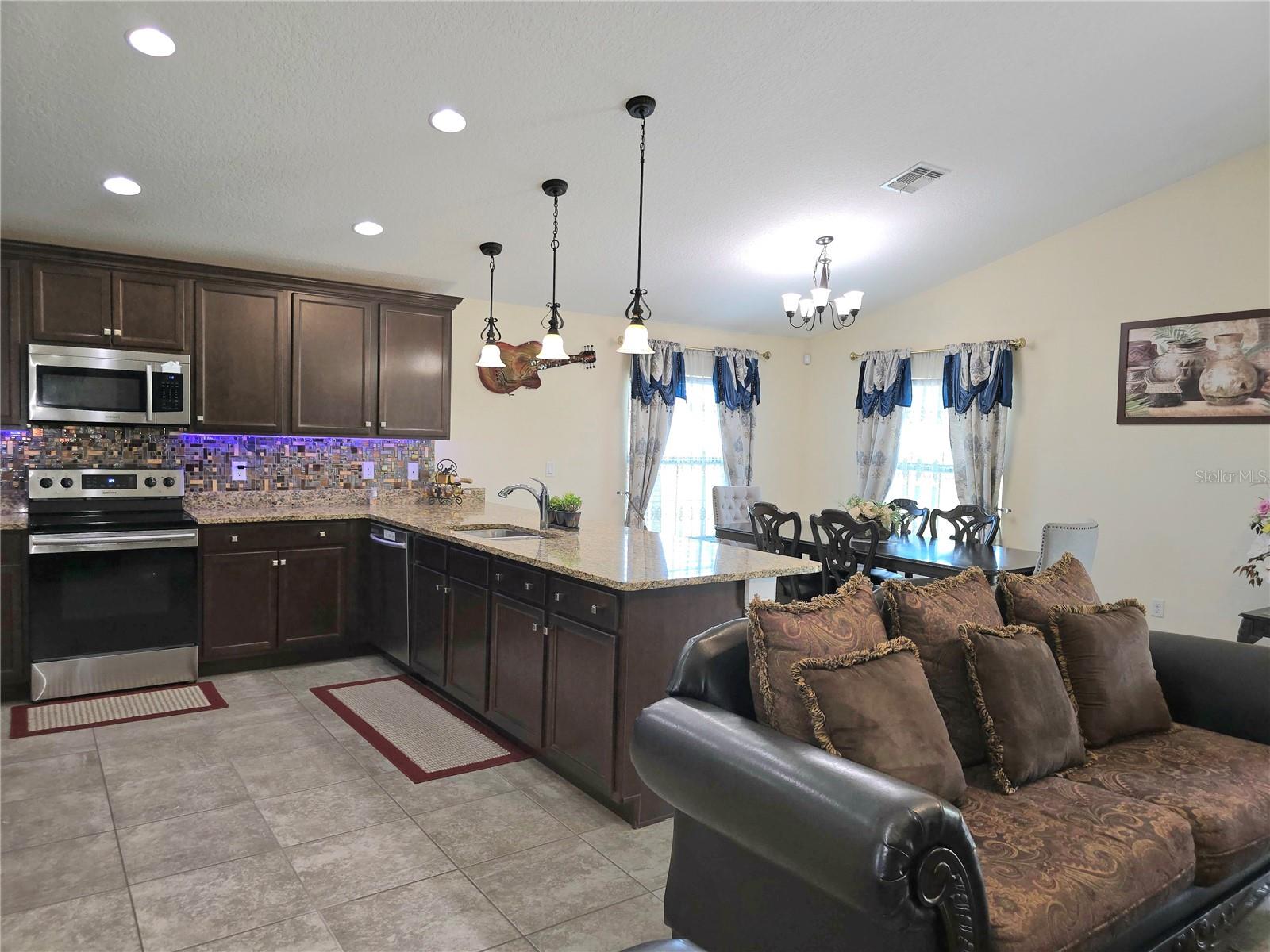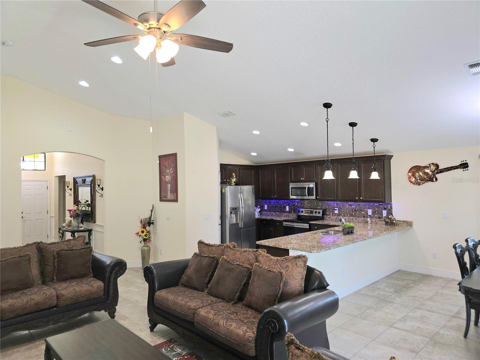 Built in 2019, this spacious FULLY FURNISHED 4-bedroom, 2-bathroom home sits on over a .25 lot with no rear neighbors for added privacy. Inside, you'll find granite countertops throughout, a bright kitchen, and a dedicated laundry room with washer and dryer included. The primary bathroom features a walk in shower and dual vanity. Hurricane shutters provide added peace of mind. Located just 3 miles from Merrill Gardens at Solivita Marketplace—offering restaurants, a gym, Sprouts supermarket, and more—and only 10 minutes from HCA Florida Poinciana Hospital. Easy access to I-4 makes commuting to Tampa or Orlando a breeze. Call today for a private showing, THIS ONE WON'T LAST!!!